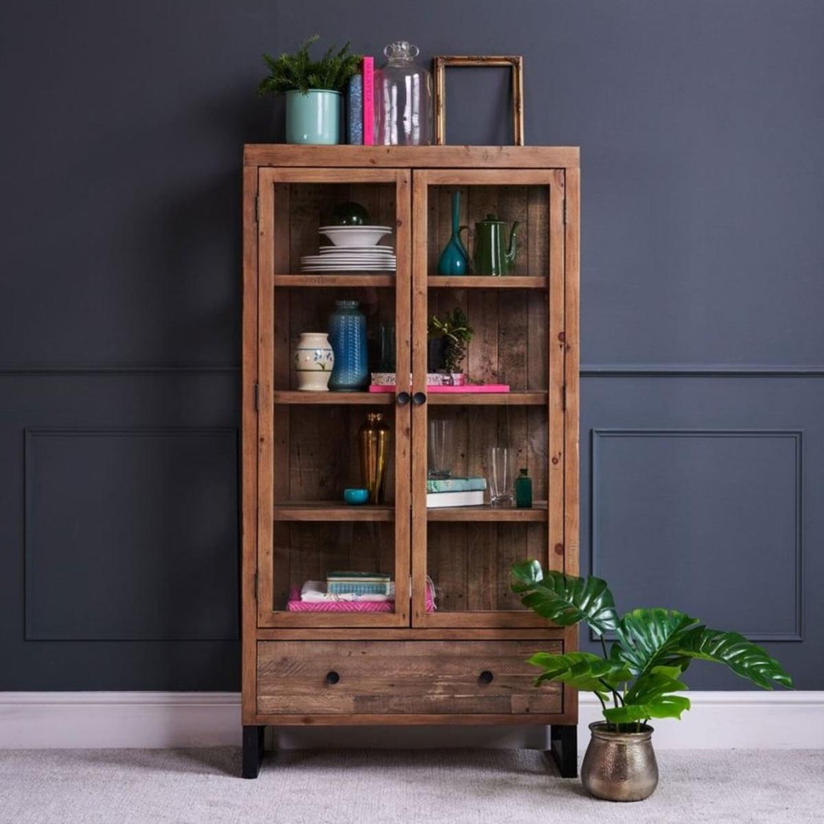 Showcase your favourite glassware and tableware in this ultra distressed reclaimed timber industrial style display cabinet. Part of the Adelaide range, this industrial style display cabinetby Baker Furniture sits perfect in any dining room. Featuring two doors with glass fronts and four shelves giving lots of storage space, the cabinet also sports a drawer at the bottom for storing away napkins and table linen.