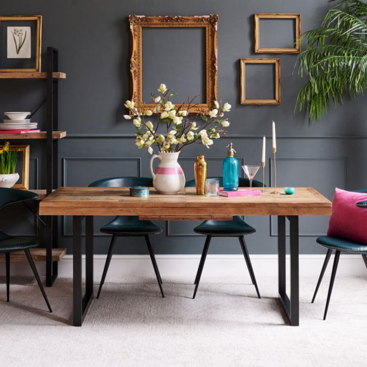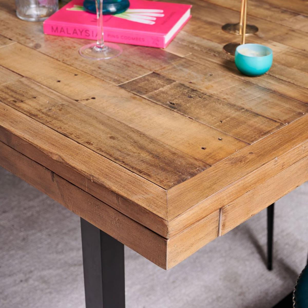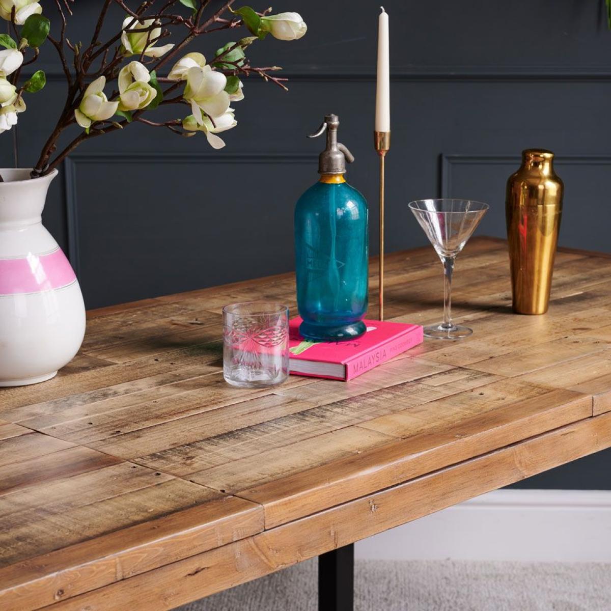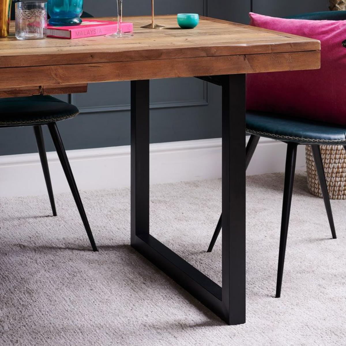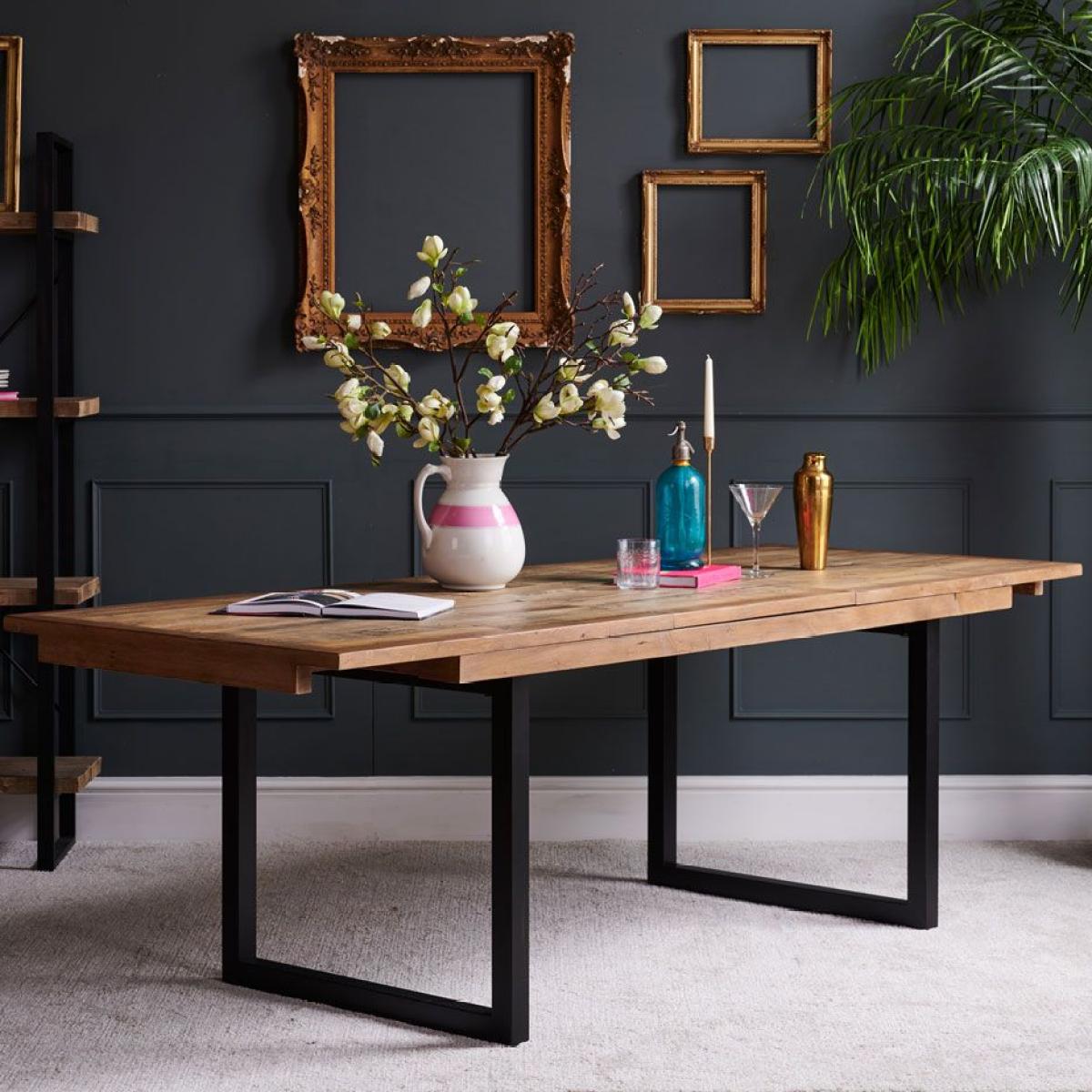 This statement. Industrial extendable dining table. Is the centre-piece of the Adelaide range. It's handmade reclaimed timber surface has been treated to be distressed but is still smooth to the touch, and its legs are cast from solid metal in a black finish. This rustic chic industrial style dining table is the must have within the Adelaide range. Please note: Reclaimed wood has a history and as a result, it's own character. It may have been used for buildings and structures over many years. It is a rustic material, and no two pieces are the same. Random markings & holes are a standard feature of reclaimed wood.