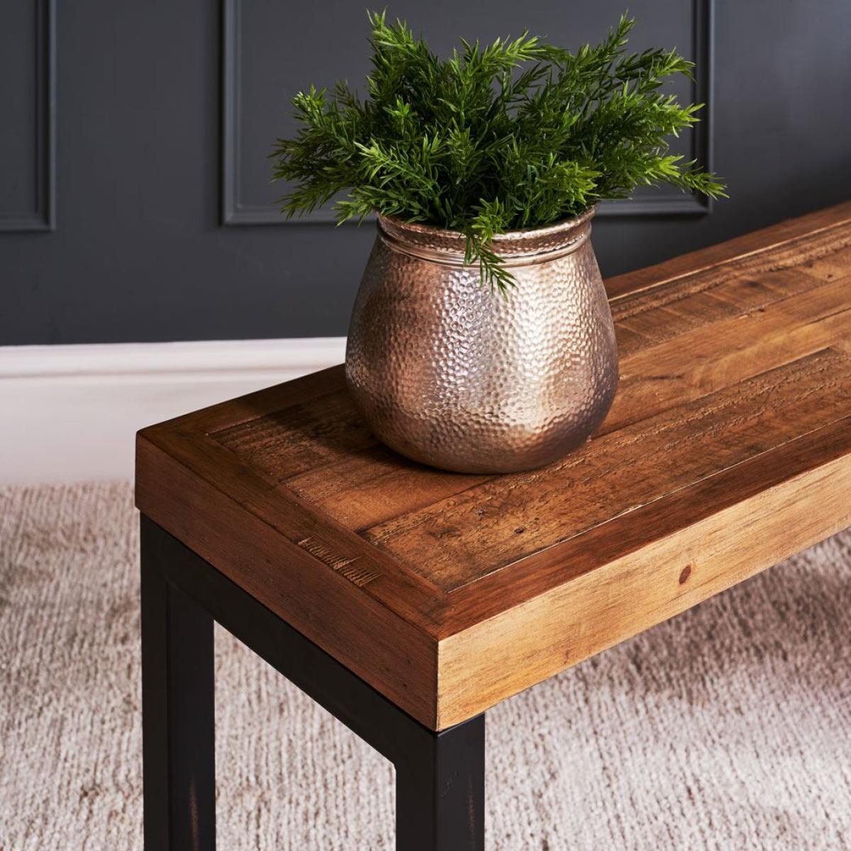 The Adelaide rustic industrial bench is constructed from beautifully restored reclaimed timber. It exudes the definition of chabby industrial chic and fits both modern and traditional homestyles. Every piece from the Adelaide range has its own history, and of course being reclaimed timber its better for our environment. This reclaimed timber bench pairs perfectly with the Adelaide Dining Table. Please note: Reclaimed wood has a history and as a result, its own character. It may have been used for buildings and structures over many years. It is a rustic material, and no two pieces are the same. Random markings amp; holes are a standard feature of reclaimed wood. Handmade in reclaimed timber. Metal legs in black finishH48cm x W140cm x D35cm
