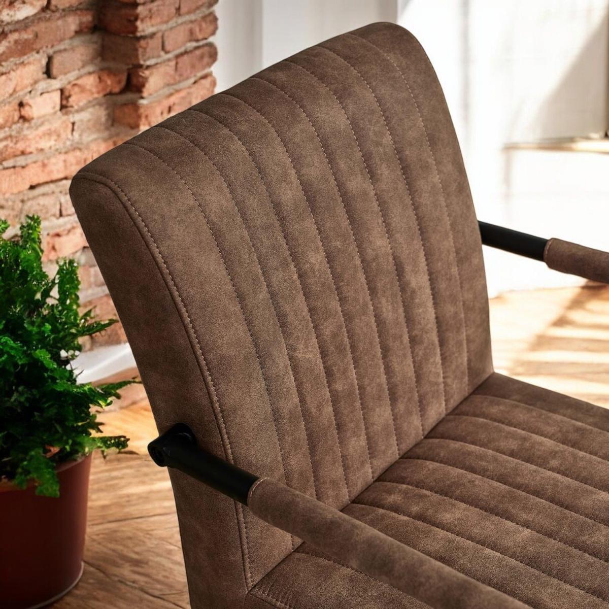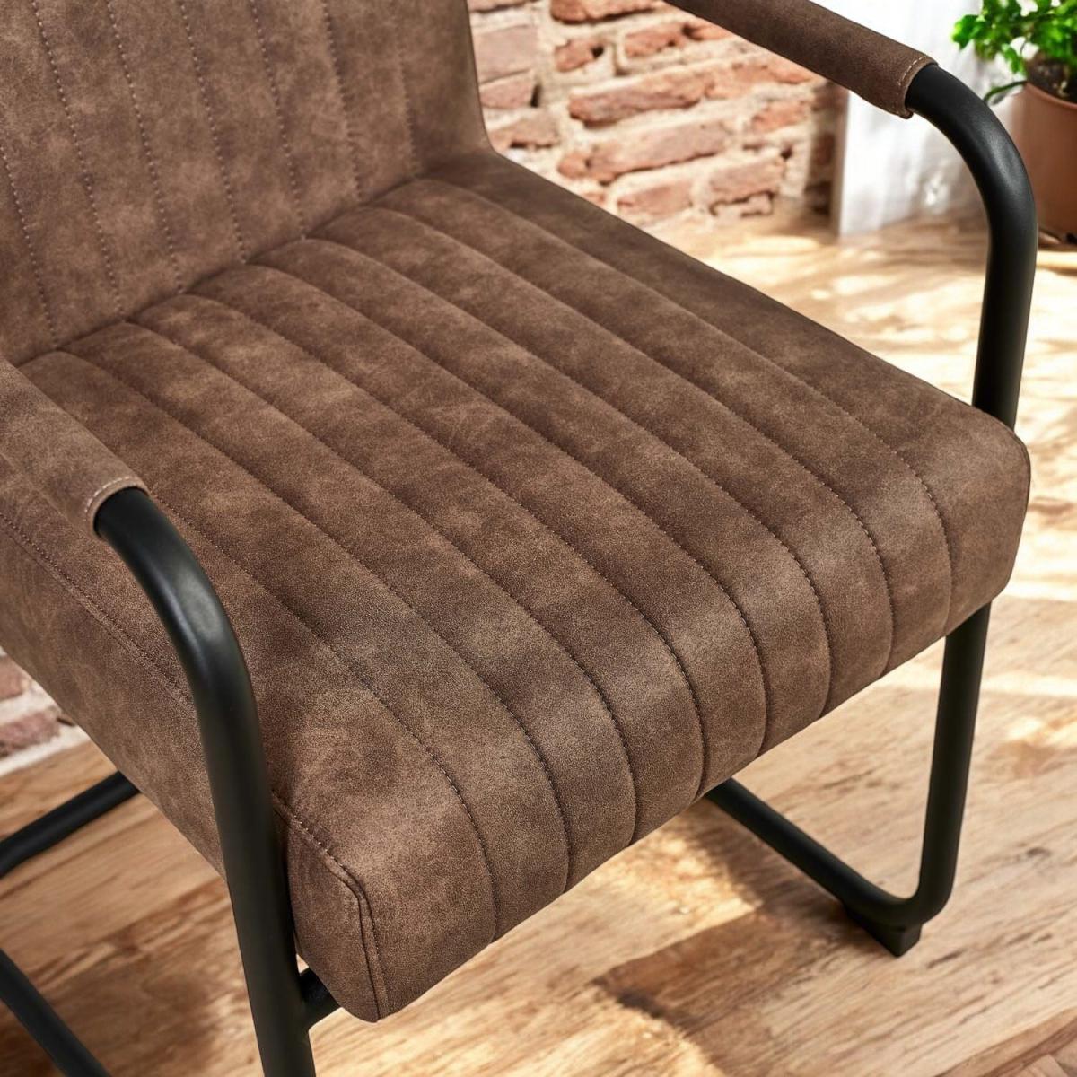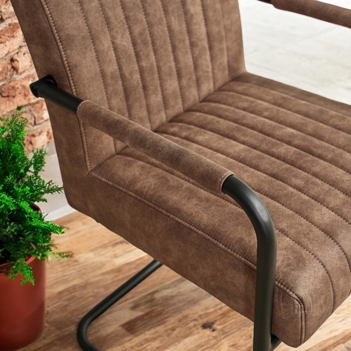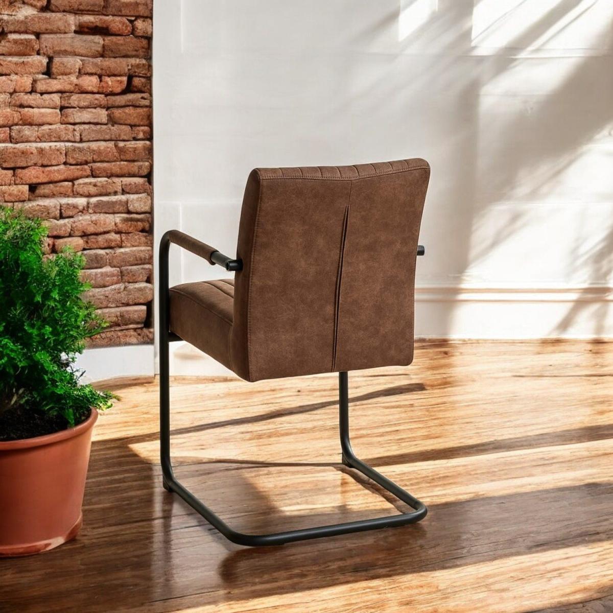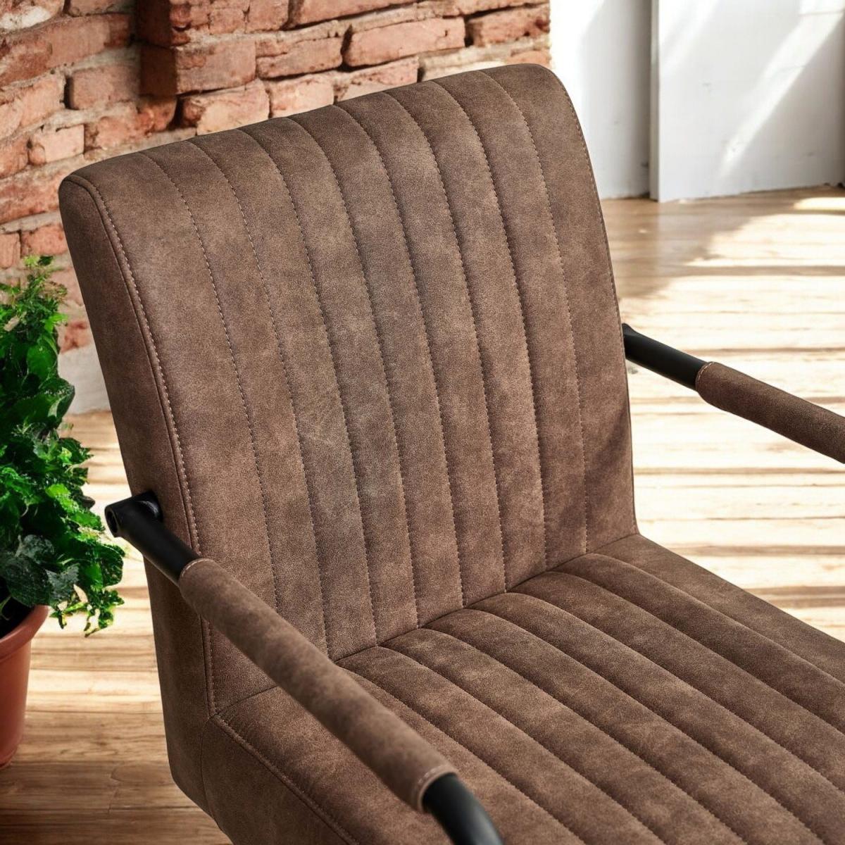 The Adele Dining Chair in sophisticated light brown faux suede upholstery is a stylish addition to your dining area. Enjoy the support of the metal arms and gentle rocking motion of the cantilever base as you dine, while feeling fully supported by the sturdiness of the materials and design. This pair of dining chairs, with soft upholstery and chic industrial style stitching, is a great companion to any of our industrial style dining tables or as an additional chair for other rooms in the house such as a study.