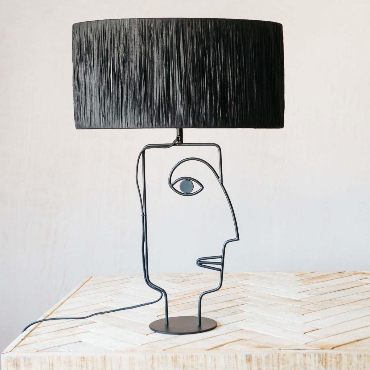 A minimalist metal table lamp with a contemporary black finish, sculpted to create an abstract face design. Perfect for adding character to your space.