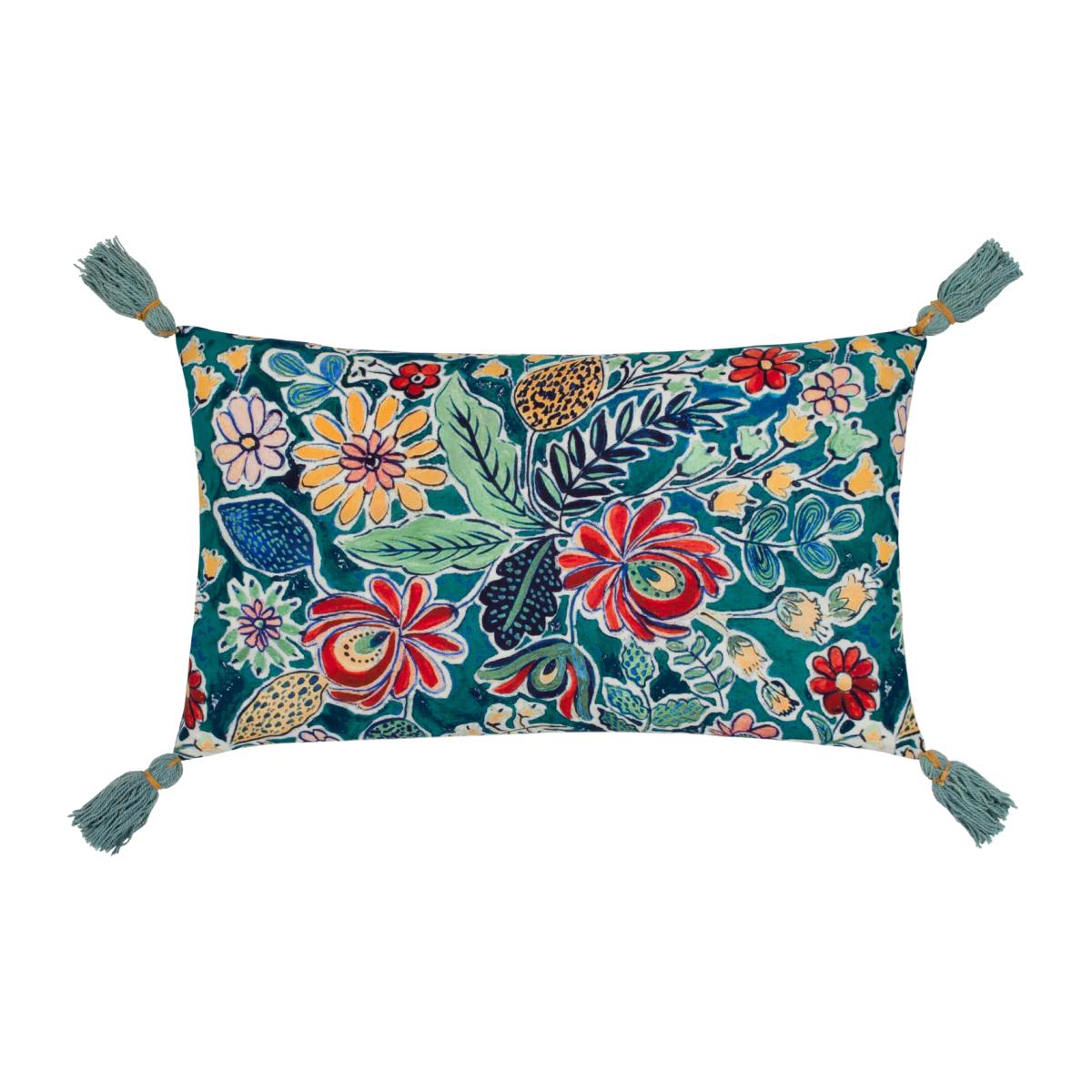 Adeline Floral Tasselled Cushion - Multicolour/Teal / 80 Feather 20 Polyester / 80 Polyester 20 Feather