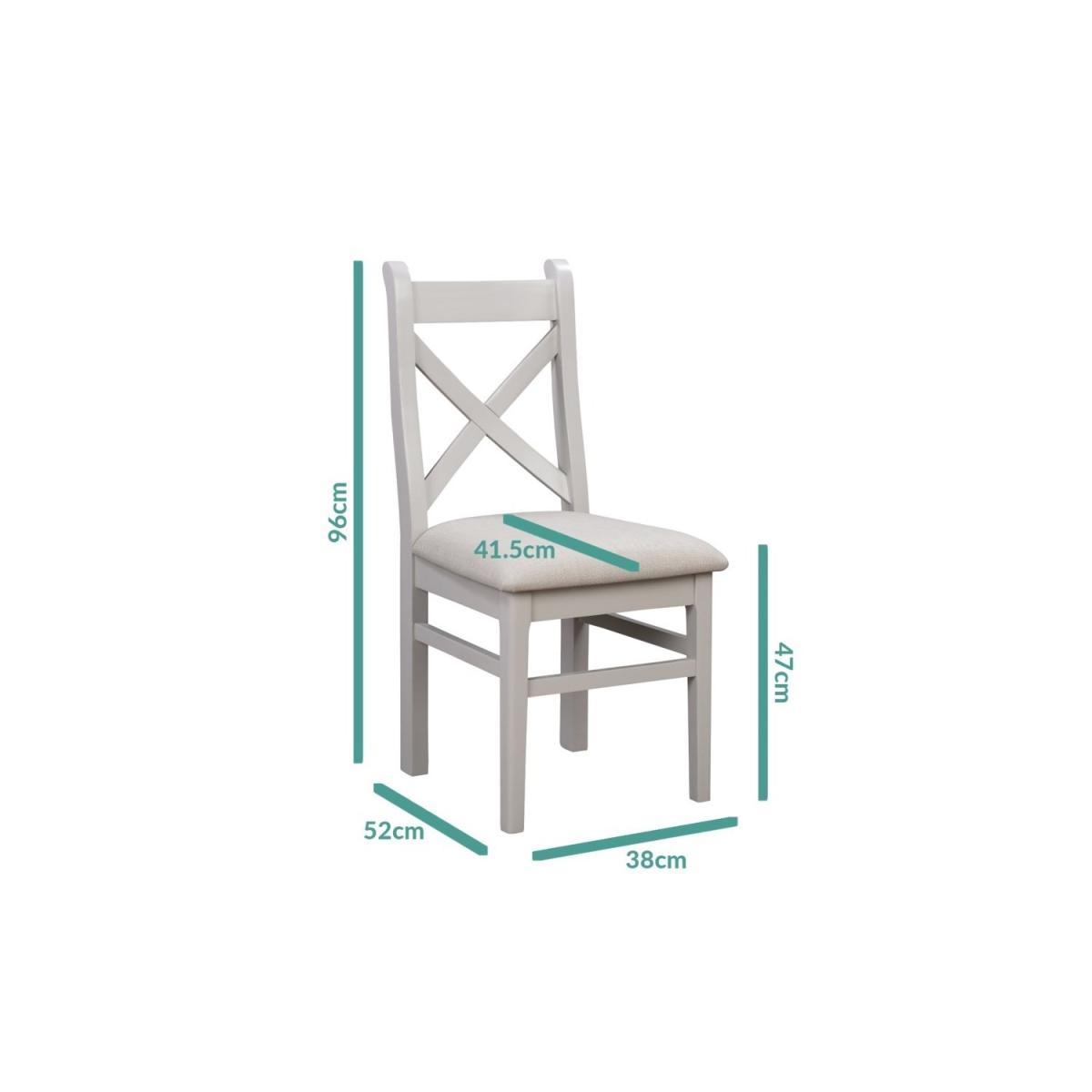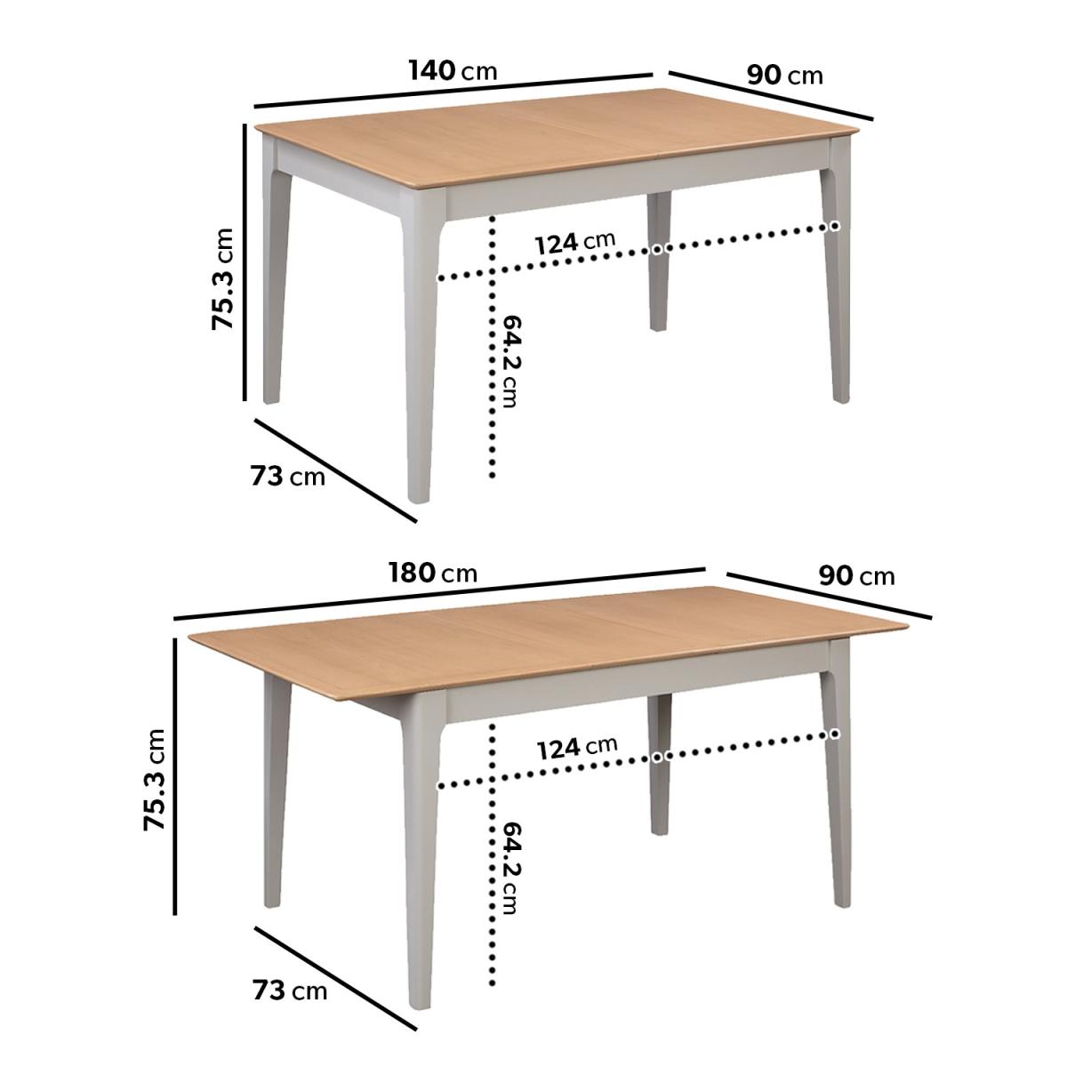 . This bundle includes. Grey Extendable Dining Table Solid Oak Top - Seats 6 - Adeline. 4 x Grey Paint Finish Dining Chairs with Fabric Seats - Adeline. 1 x Grey Painted Dining Bench with Off White Upholstered Seat - Seats 2 – Adeline Features we love Extendable solid oak dining table with grey features. Includes 4 grey high back chairs and 1 bench. Extended table seats 6 great for entertaining. Crafted from solid oak this set offers longevity. Matching items available in the Adeline range Need to know. Dining Table Information. Dimensions. H78 x W140 x D90 cm(closed) H78 x W180 x D90 cm(extended) Seats. 6 Colour. Grey and oak Finish. Painted solid oak Material. Solid oak Assembly required. Yes Dining Chair Information. Number of chairs. 4 Dimensions. H96 x W44 x D52 cm Floor to seat. 47cm Colour. Light grey and off white Finish. Painted and fabric upholstery Material. Solid oak fabric and foam Assembly required. No Dining Bench Information. Number of benches. 1 Dimensions. W101 x D32 x H45 cm Seats. 2 Colour. Light grey and off white Finish. Painted solid oak Material. Solid oak Assembly required. Yes..