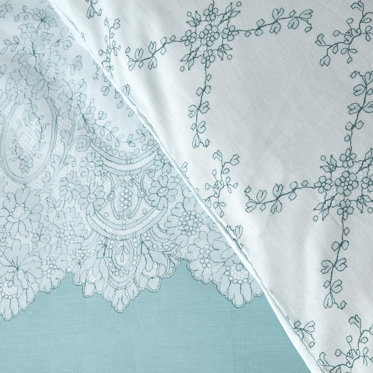 A light, elegant, and fresh bedroom accessory, this Adeline Lace Duvet Cover and Pillowcase Set is presented in a soothing duck egg tone and overlaid with a wonderful white lace print. Complete with matching pillowcases, this cotton-rich bedding set is finished with a reverse print with a floral crosshatch decoration.