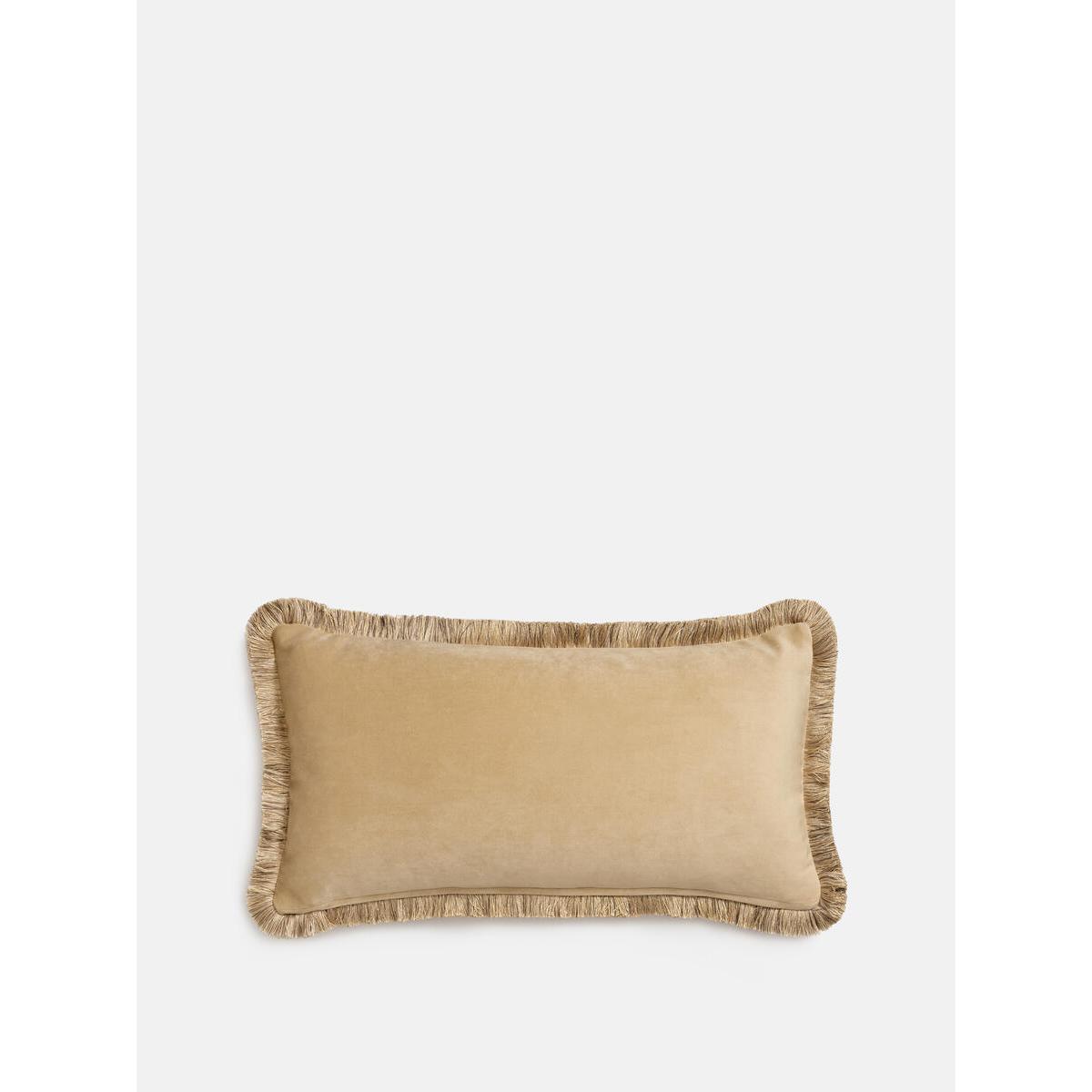 Oblong cushion with textured reverse stitch cotton cover. Covered in Stockholm Stitch fabric by Lewis and Wood. Gold velvet reverse and bespoke gold tonal eyelash fringing. Made in England. Inspired by the bedspreads at Kettner's Townhouse.