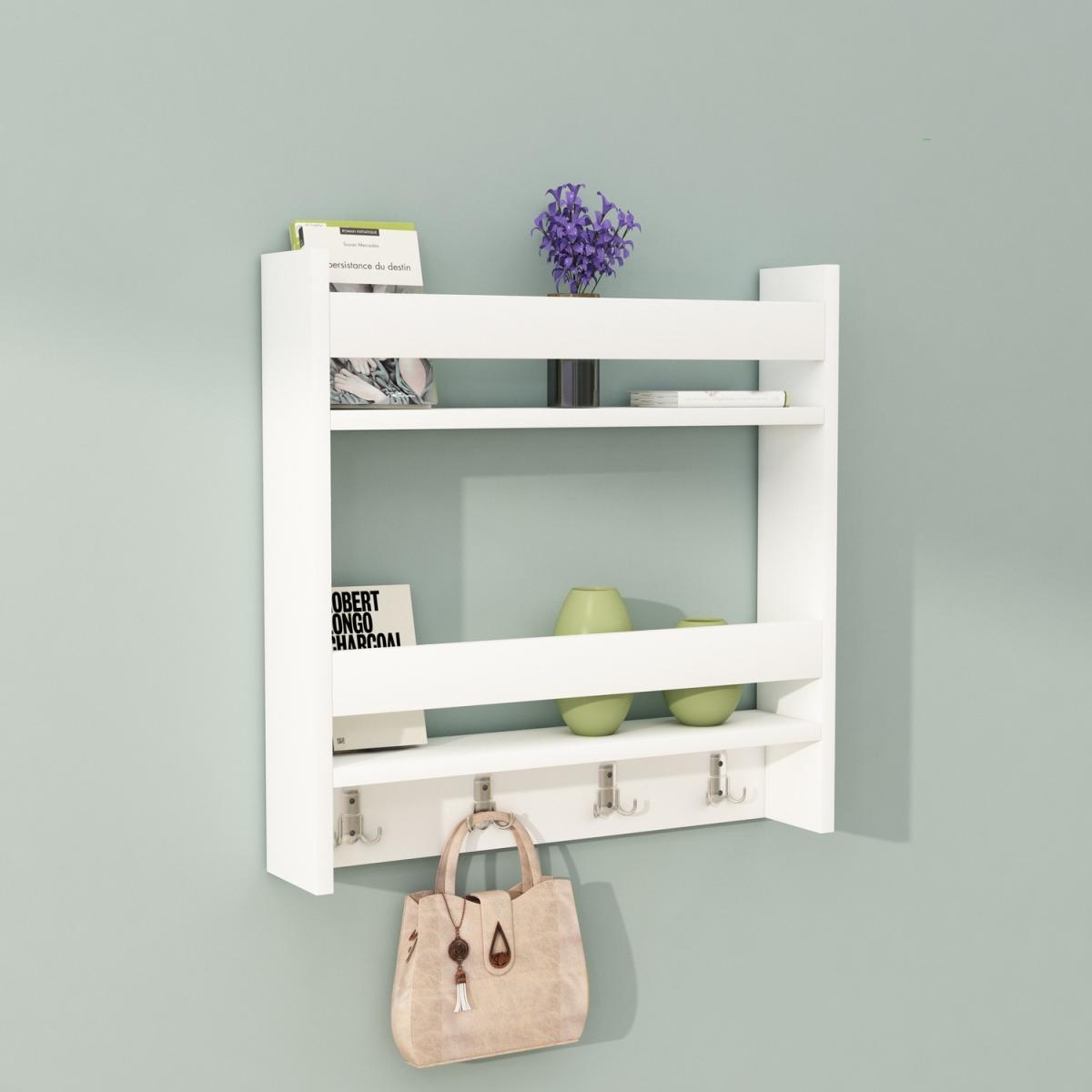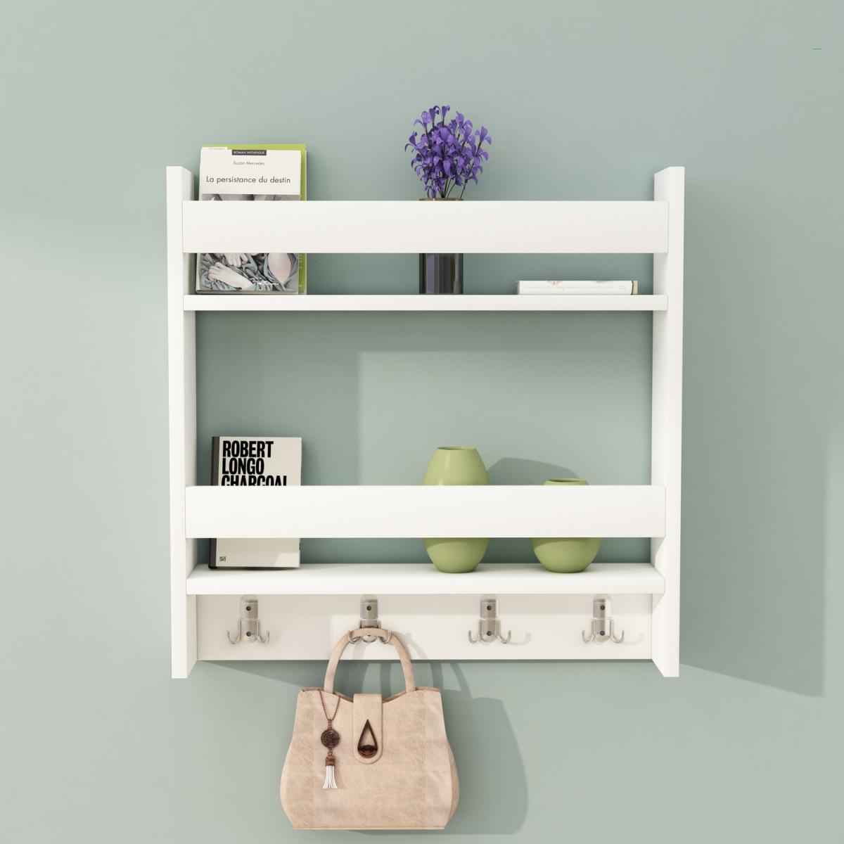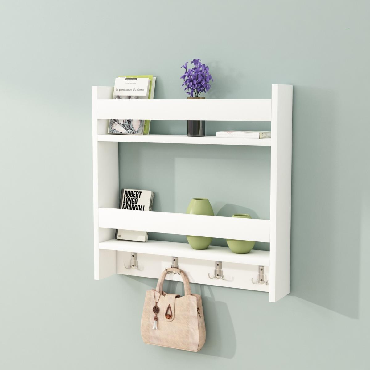 The wall shelf is made of thick high-quality melamine-coated particleboard. The manufactured wood surface is water-resistant to some extent and the edges are banded with PVC edge banding tape. Hooks are constructed from quality iron metal and coated with powder coating. First-class assemblyinstallation hardware and accessories are used. Our products are produced from certified quality raw materials that do not contain carcinogenic substances and comply with European Union health norms.