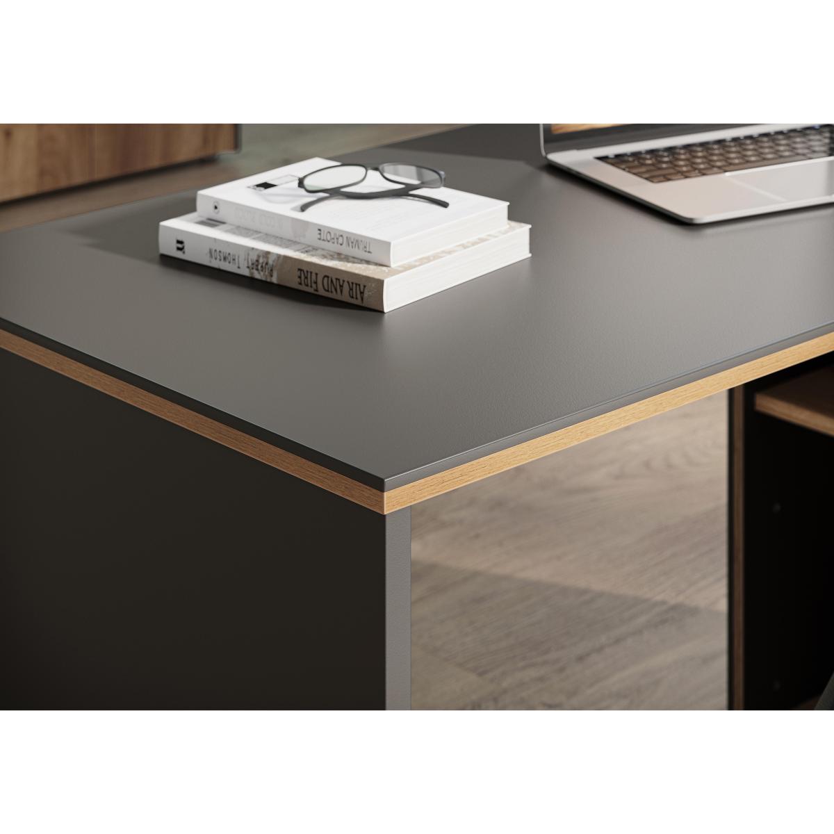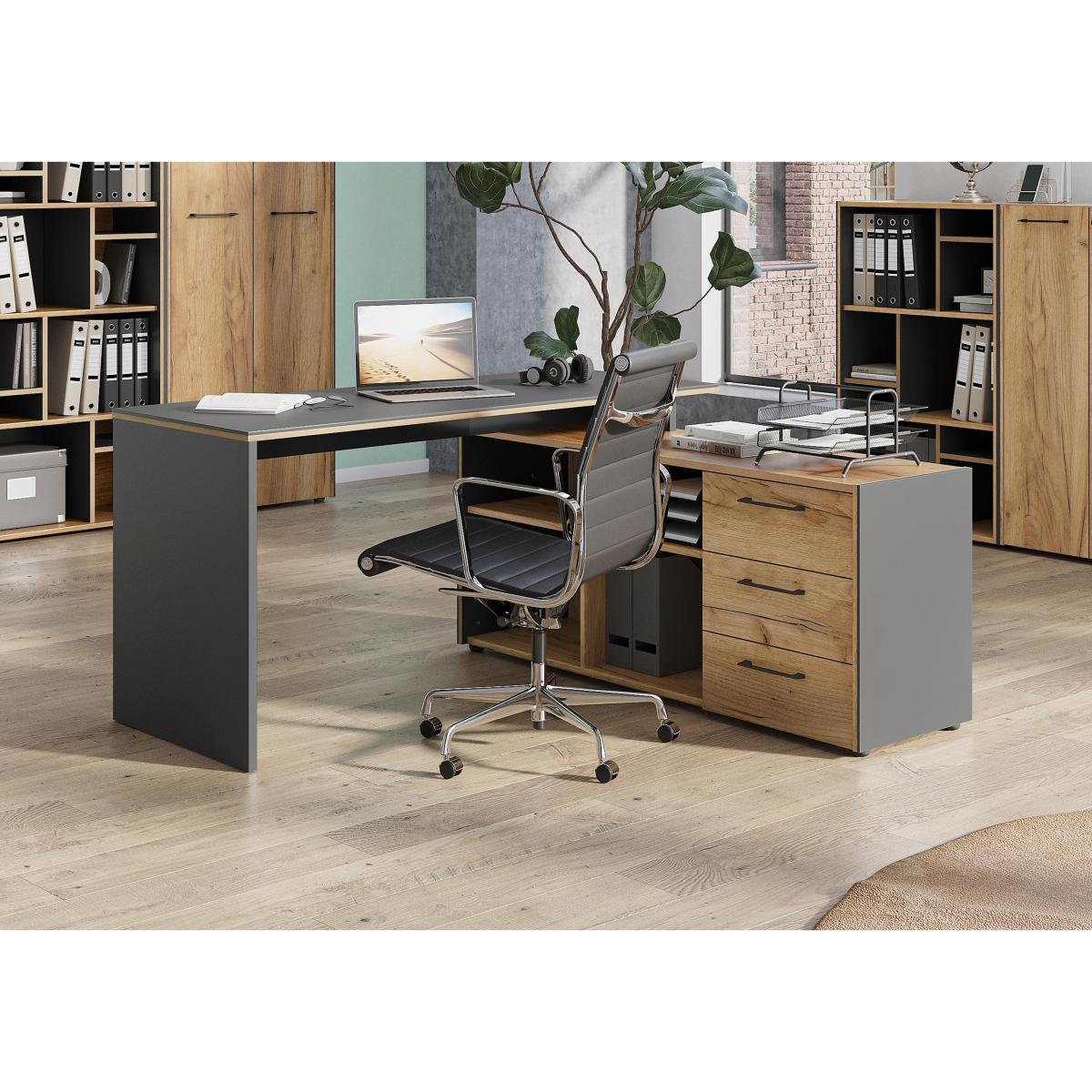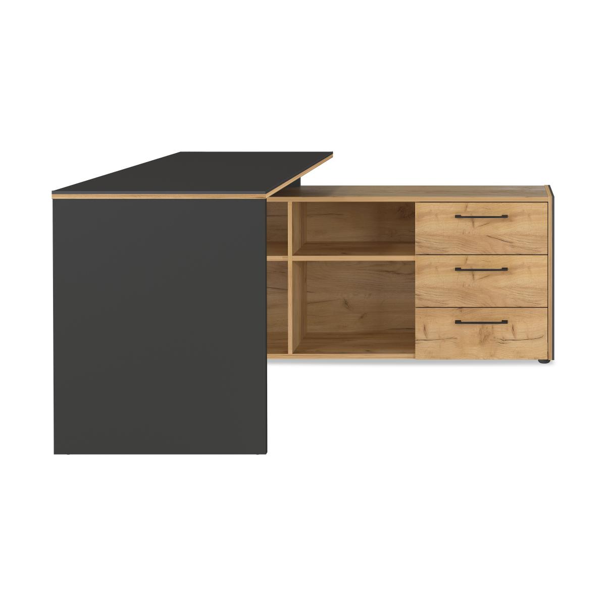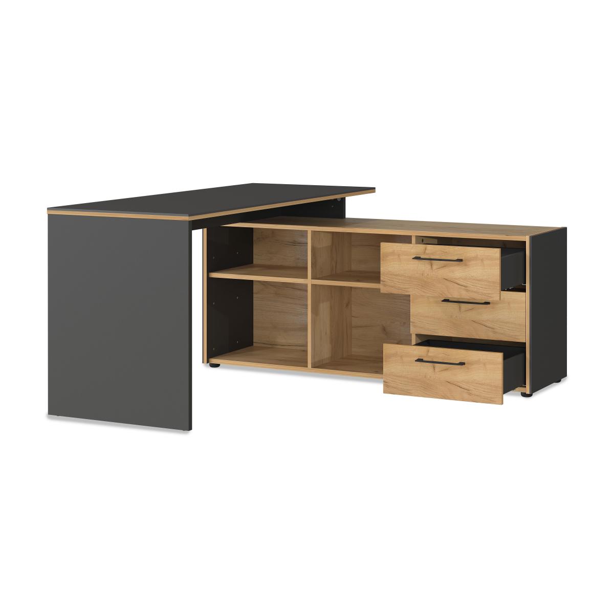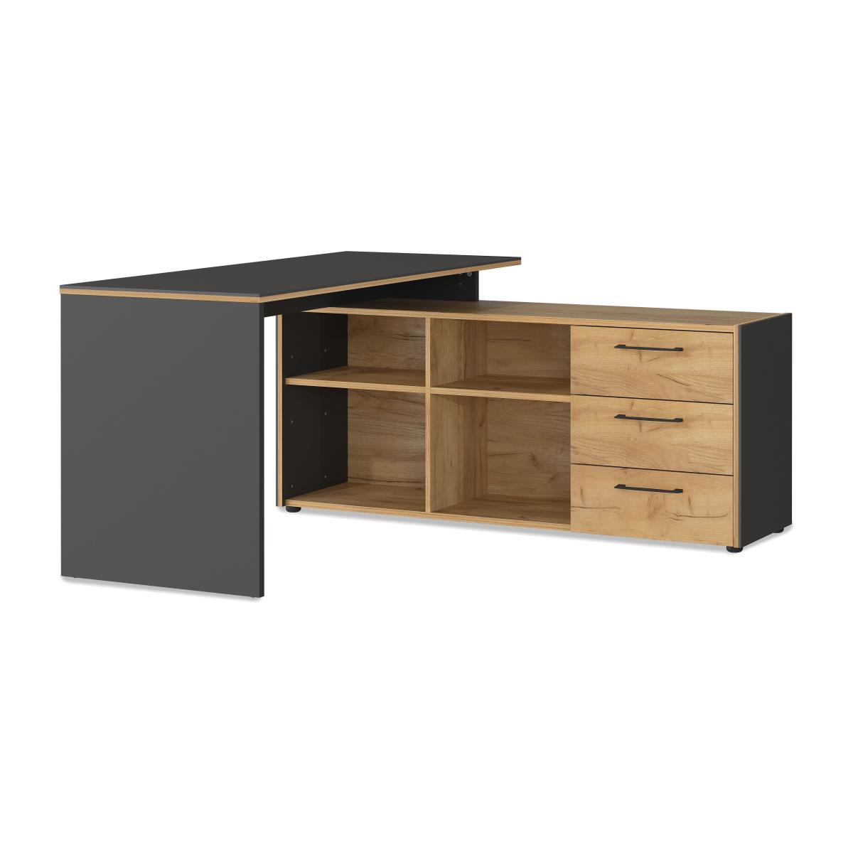 Transform your home office with stylish and functional office furniture from our Aden range. Designed and made in Germany, Aden is a completely modular collection that makes it easy to create – and recreate if you change your mind – the perfect home office setup. Pieces are finished in durable, scratch-resistant melamine with reinforced edges and come in a choice of contemporary colourways. The range includes roomy storage cabinets, stylish bookcases, corner desks, filing cabinets and more in a wide range of sizes to suit all kinds of home office spaces. Aden is part of the home office collection at Furniture Village. A corner desk – especially one with storage – puts everything within reach, and this one keeps you on trend too thanks to its contemporary melamine finish. Why you'll love it Large corner desk with storage unit makes the work day even more productive. Modular home office style that’s fabulous and functional. Contemporary oak-effect and graphite finish. Storage cabinet has open shelves and 3 drawers with metal handles. Silent soft-closing drawers with metal runners. In scratch-resistant melamine with shock-resistant edges. Made in Germany. A Furniture Village online exclusive. This corner desk with storage cabinet is part of our Aden range. What you need to know Easy self-assembly required, full instructions included. Storage unit can be positioned on either the left- or right-hand side of the desk at time of assembly. Surface has a durable melamine resin coating. Create your perfect home office setup with the Aden range. Mix and match a wide choice of modular pieces.