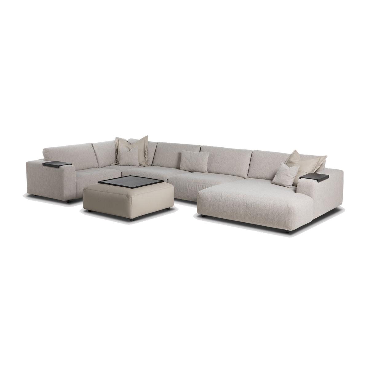 The Adessa Fabric Modular 5 Seater Sofa combines refined elegance with supreme comfort. Anchored by a solid wood frame, itrsquo;s draped in premium upholstery, blending plush fibres and down for an evolving cosy feel. Elastic sinuous springs and loose, feather-filled back cushions offer indulgent support, while graceful wave patterns add a touch of sophistication. Complete with a leather footstool and black oak trays, this modular piece seamlessly merges relaxation and function, creating a versatile sanctuary that brings warmth, style, and serenity into any living space