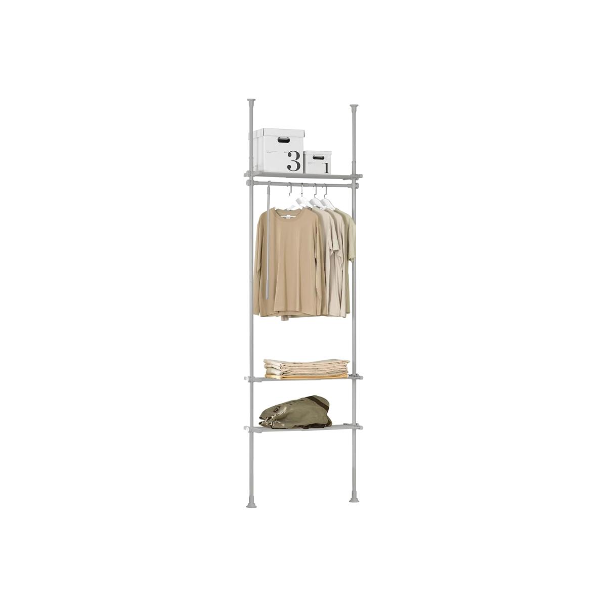 The adjustable size of the shelving is the perfect wardrobe for a walk-in closet, dressing room or bedroom. Designed to work as a wardrobe without taking up nearly as much room, the nifty system can easily be made taller or wider to perfectly suit your space - or your ever-expanding wardrobe! It has 3 shelves and one hanging rail, providing ample storage space for you. It needn't be screwed onto the floor or the ceiling. The upright poles rely on suction as you stretch them from floor to ceiling.