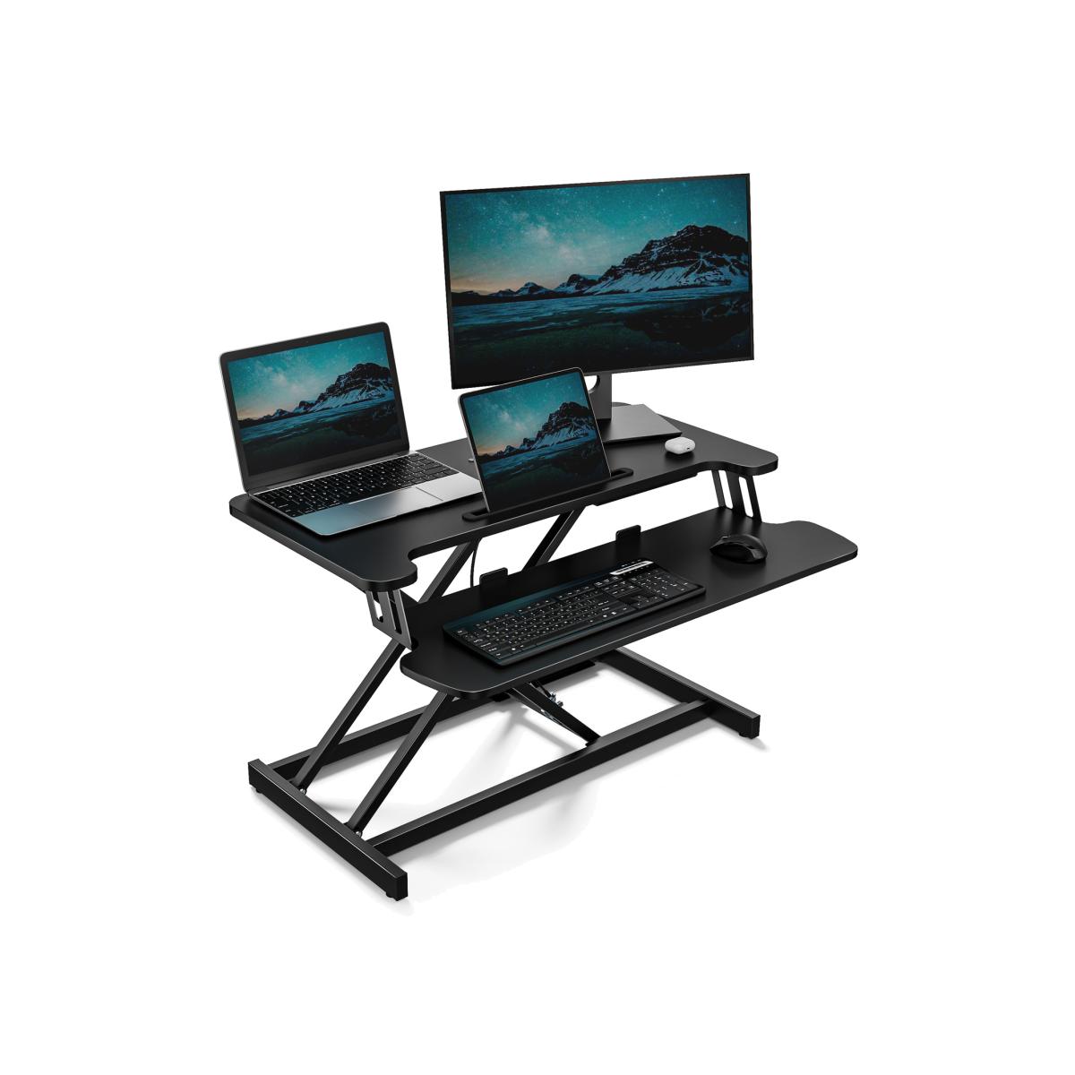 Ergonomically designed to promote better posture and reduce the risk of back and shoulder pain, the Von Haus Sit-Stand Rising Workstation allows you to effortlessly switch between sitting and standing. Ideal for the home office, the height-adjustable workstation's two-tier design provides ample room for your monitors on the top platform and can easily accommodate a keyboard or mouse underneath. The standing desk converter remains stable and secure, even when fully extended. Designed to sit atop your desk, the workstation is constructed from durable steel and with a range of colourways, the workstation will make a smart addition to any workspace.