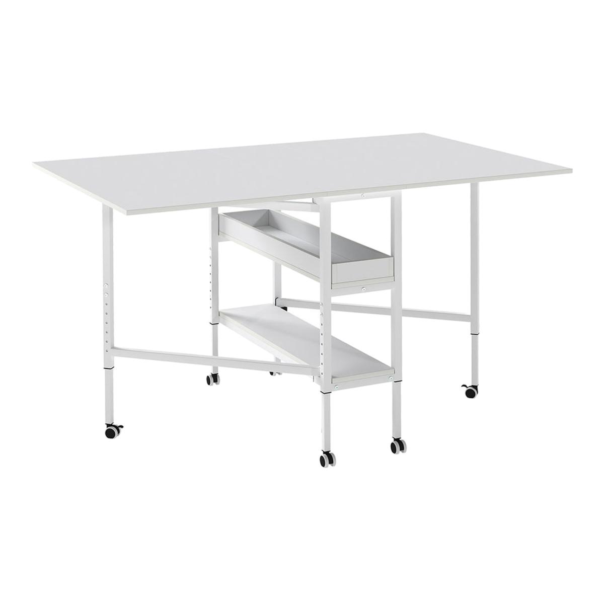 This versatile folding sewing table is designed to provide a convenient and ergonomic workspace for sewing, crafting, and even home office tasks. Its height is adjustable from 71cm to 100cm, allowing you to easily switch between different working positions to suit your comfort level, making it ideal for users of varying heights. Whether you need to sit or stand, this table adapts to your needs with ease. Equipped with mobile casters that feature brakes, the table can be smoothly rolled around your workspace for flexibility and convenience. When you're ready to work, simply lock the casters in place to ensure stability, preventing any unwanted movement while sewing or crafting. For added convenience, the table includes extra storage shelves with raised edges, helping to keep your tools, fabrics, or baskets organised and easily accessible. The raised edges prevent items from falling off while you move the table, helping you maintain a tidy and efficient workspace. Crafted with a sturdy steel frame and reinforced hinges, this sewing table provides durable support for heavy machines and long-term use. The solid construction ensures a stable work surface that will last, even under the demands of regular sewing and crafting projects. The large, multi-use surface is perfect for a variety of tasks, from sewing and crafting to home office work or cutting fabric. Its space-saving foldable design allows for easy storage when not in use, making it an ideal solution for those with limited space in their home or studio.