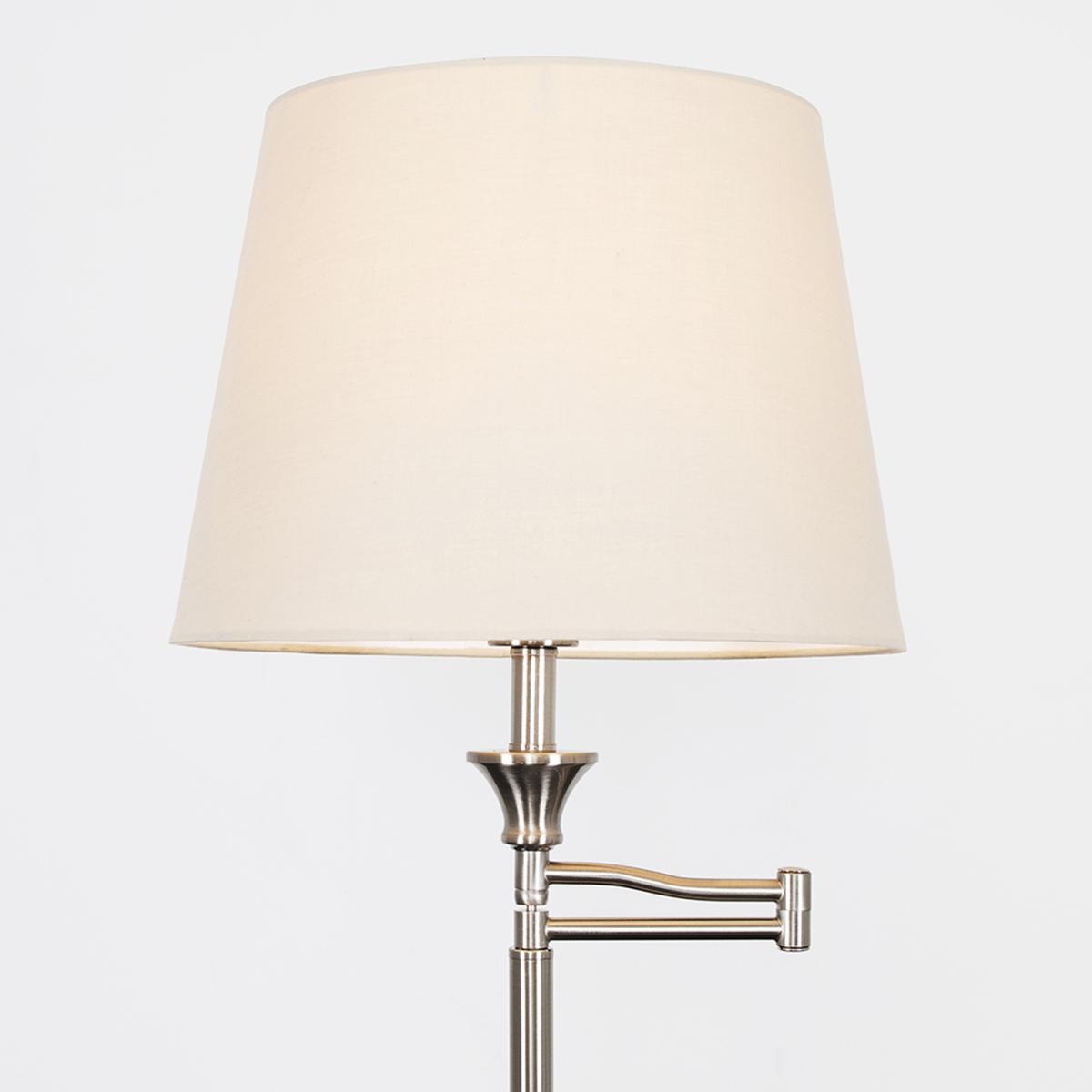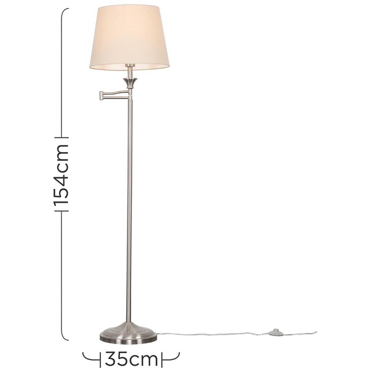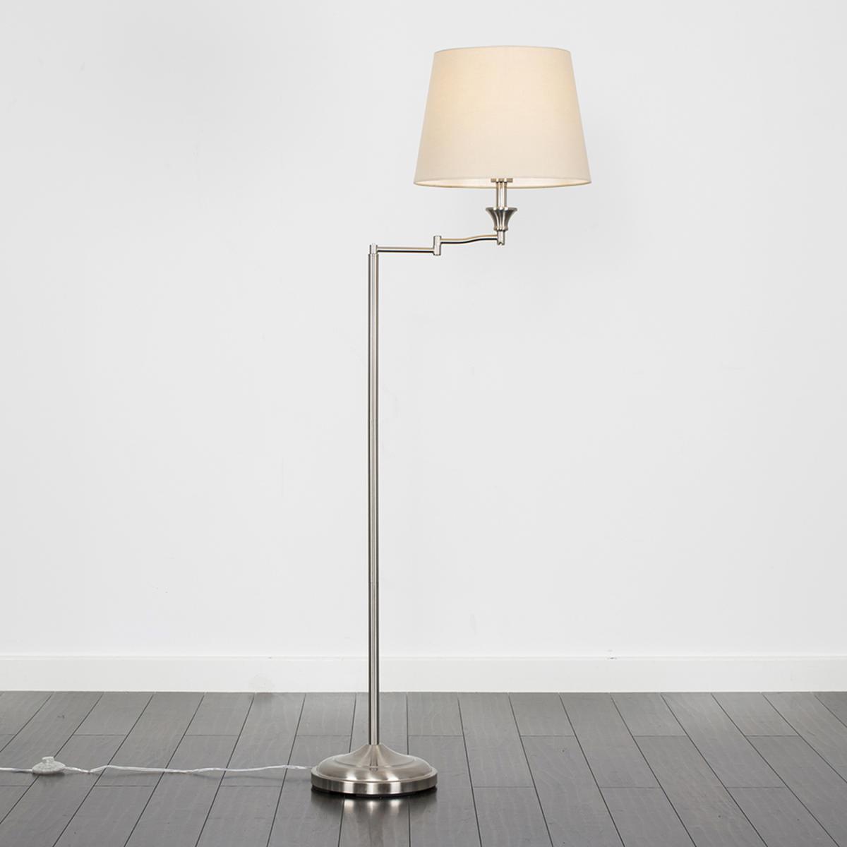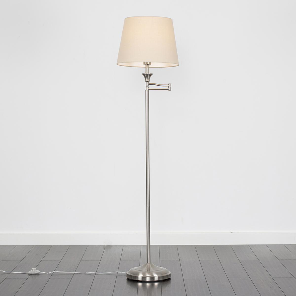 Sinatra Brushed Chrome Floor Lamp with Beige Aspen Shade. This traditional swing arm floor lamp is a gorgeous addition to any living or bedroom space. Perfect for illuminating any dark corners. Please note that the base requires full self-assembly. Requires one 60W ESE27 bulb or LED equivalent.