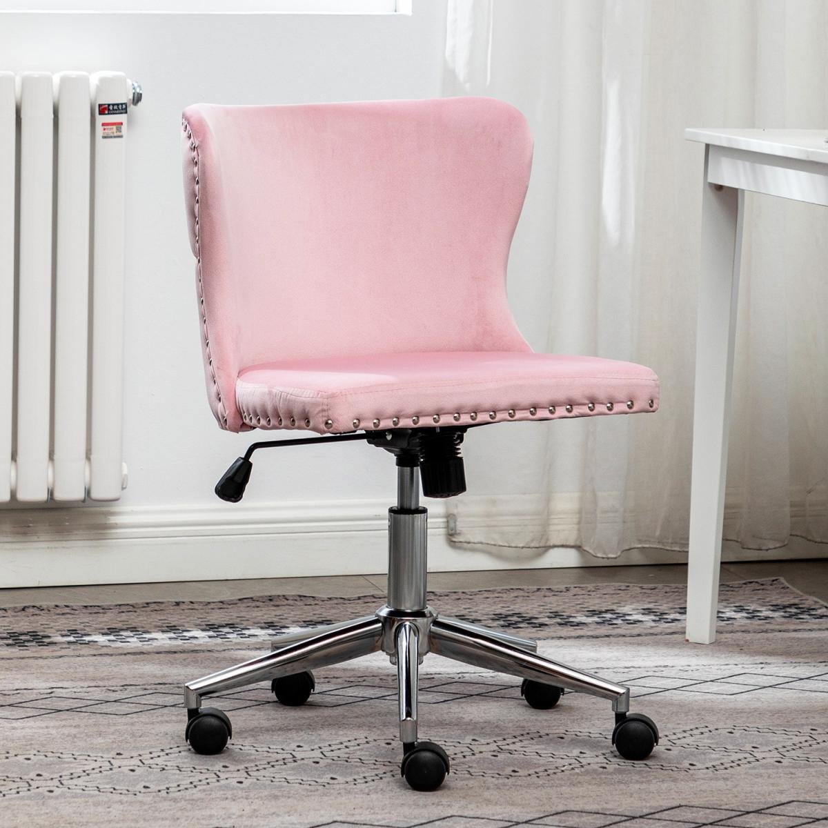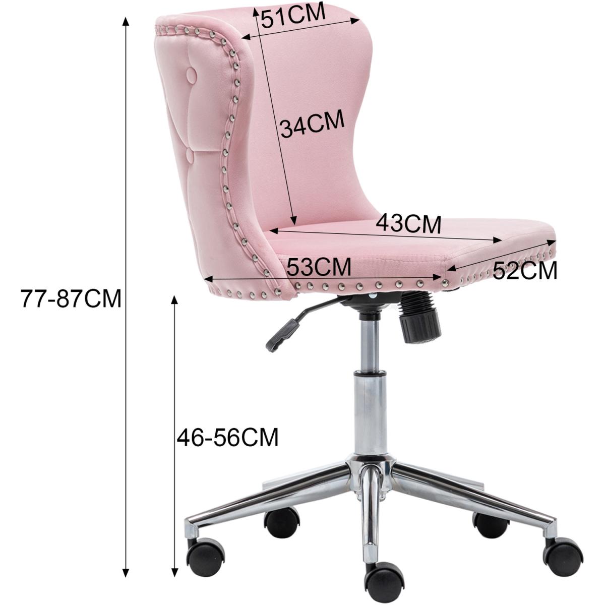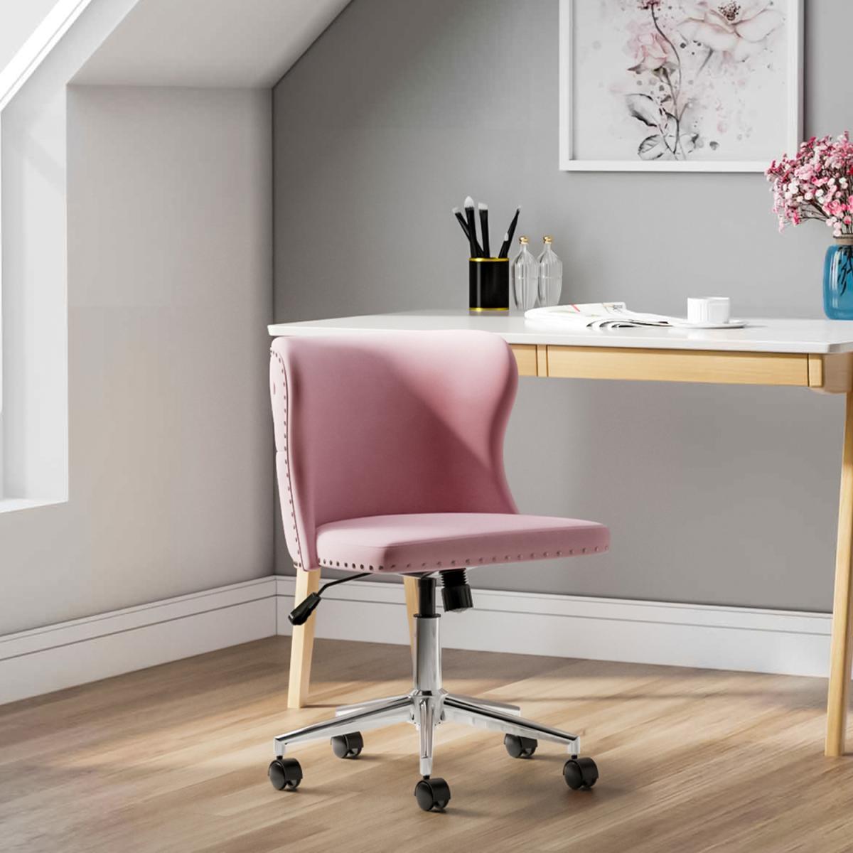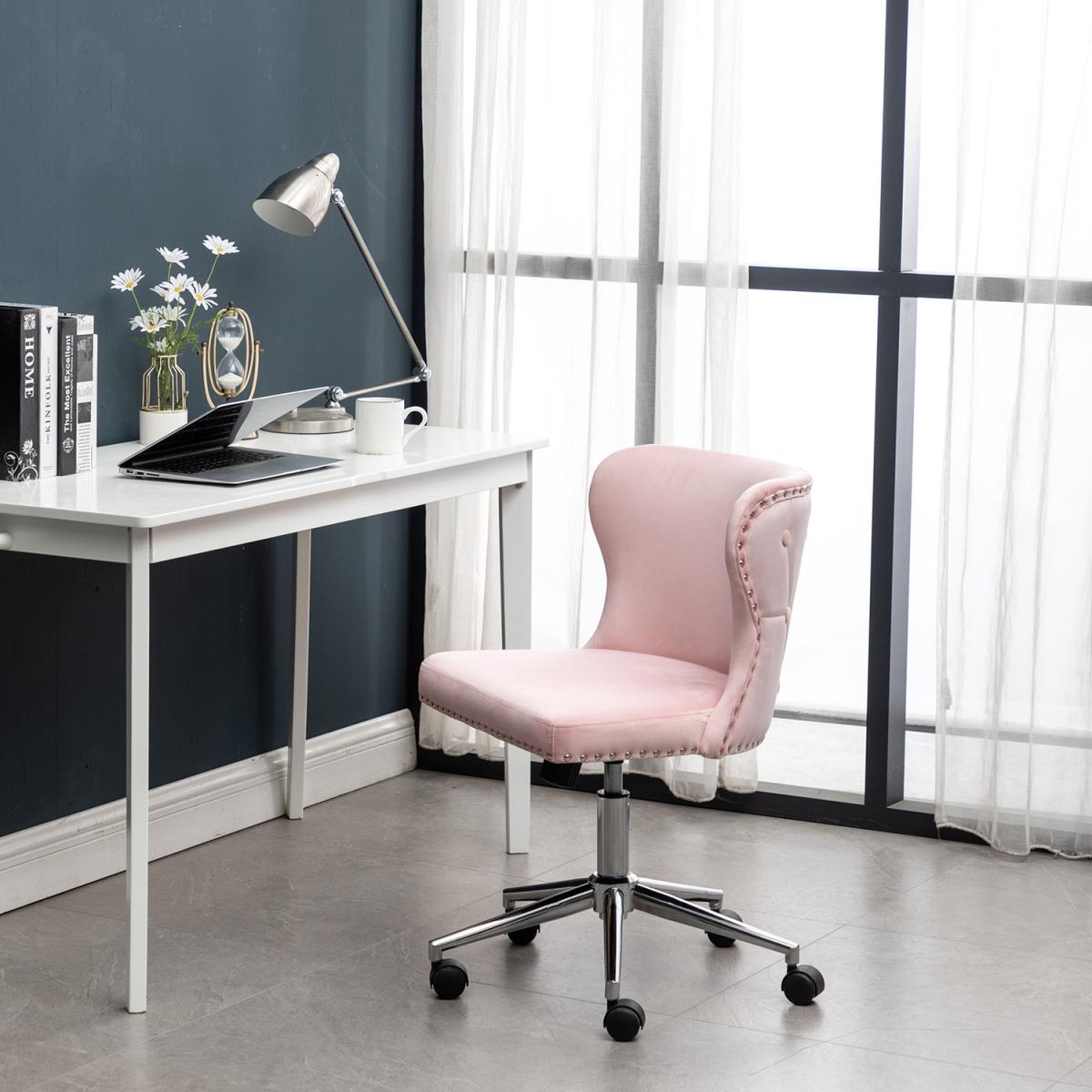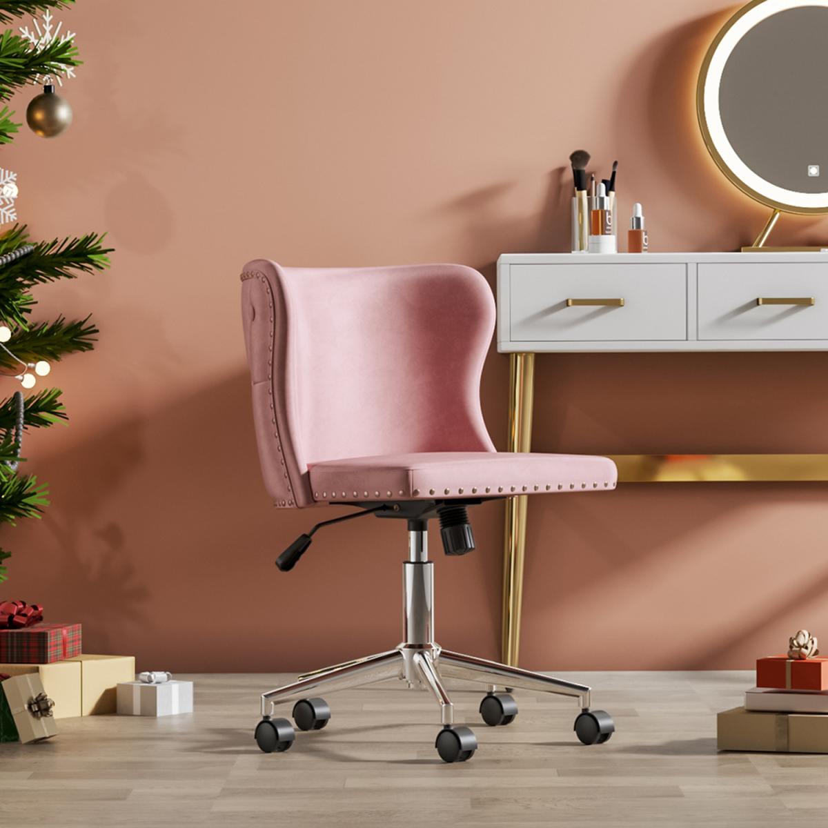 Smooth chrome finish base also features excellent rust-resistance and durability, with high load capacity, ready for your long term use. The padded back and seat feature a soft velvet cover and thick high elastic sponge which will make you feel comfortable and relaxed. Modern office chair comes with an adjustable human-curved lumbar support backrest. On the top, there are some buttoning details, which liven up the whole fitting. No body-shape limit, no posture limit. You can sit as comfortably as you want. Simple and quick assembly is required. All parts, hardware and tool are provided for your convenience. This fancy chair will be a nice-looking addition to your bedroom, study, dorm room, office, etc.