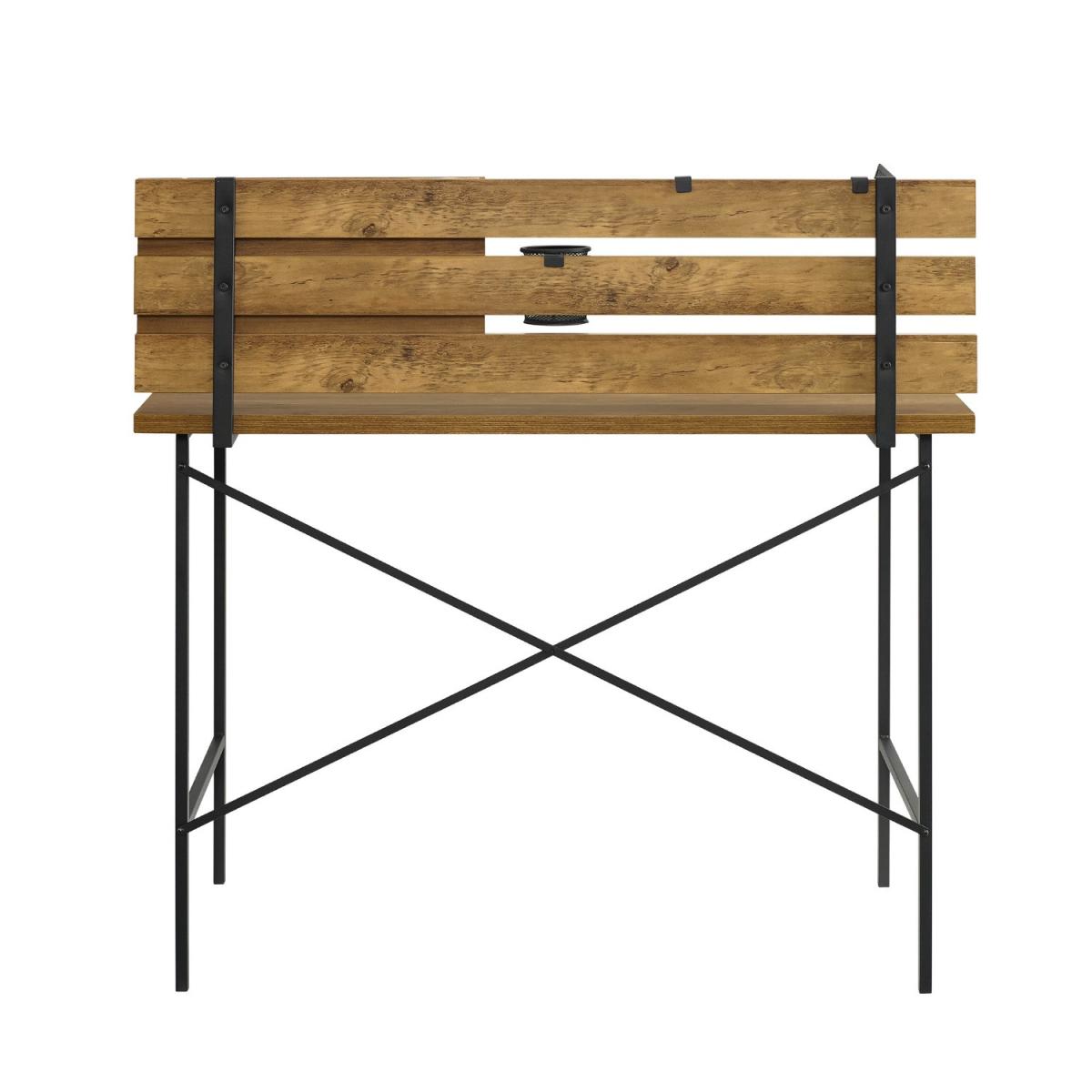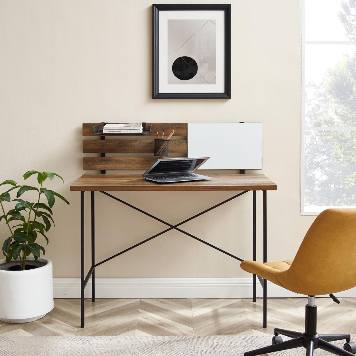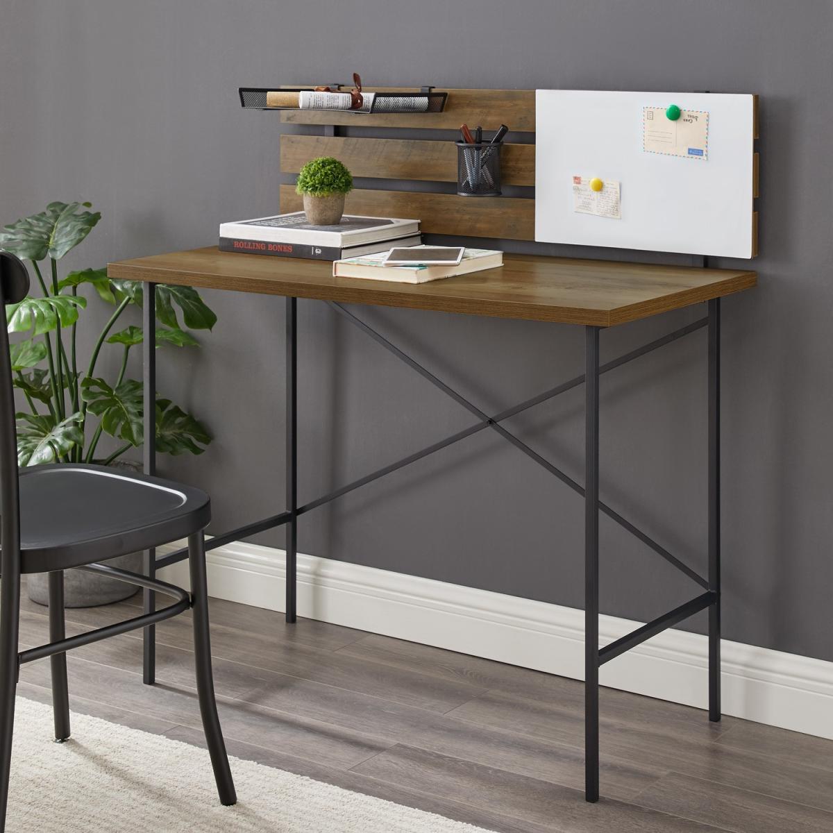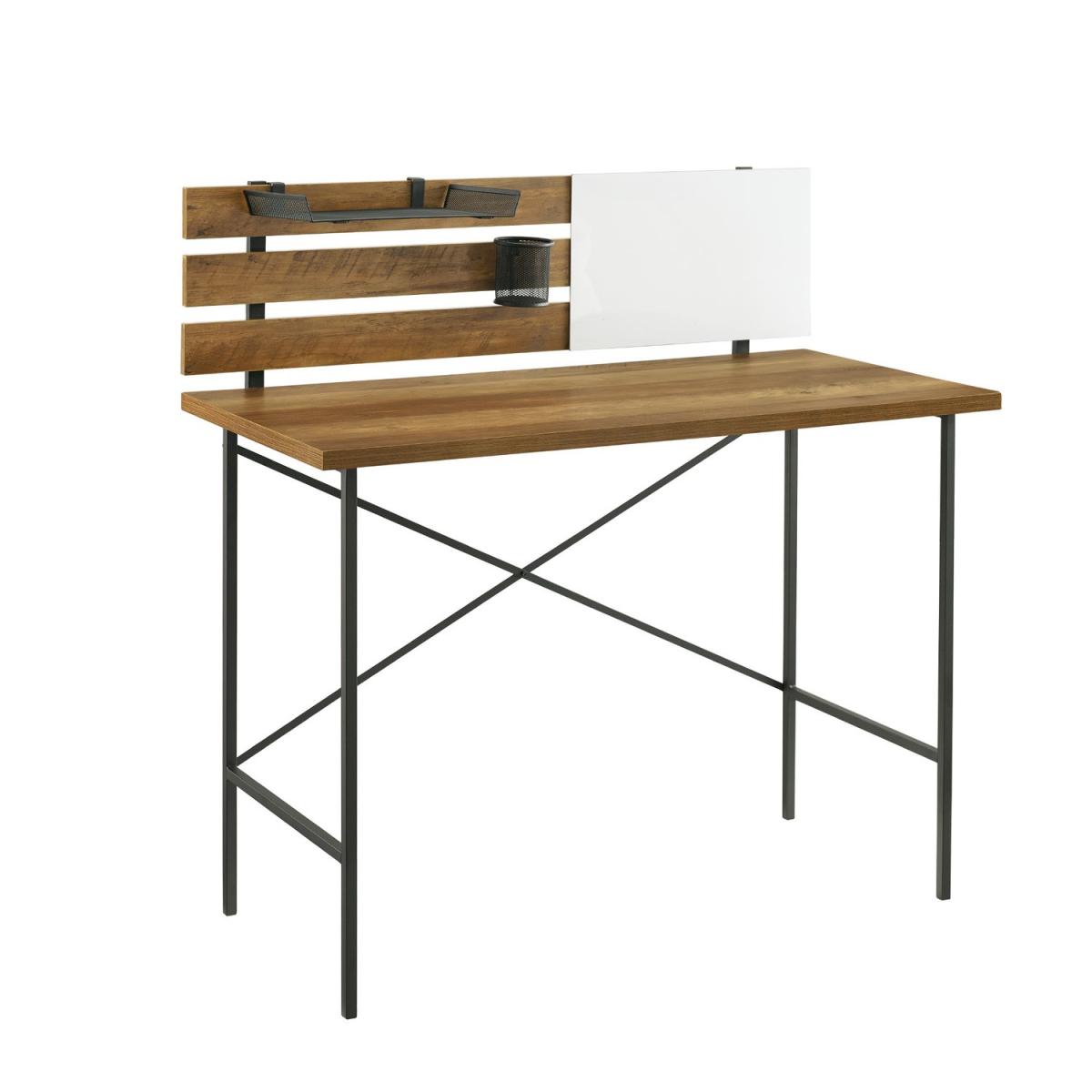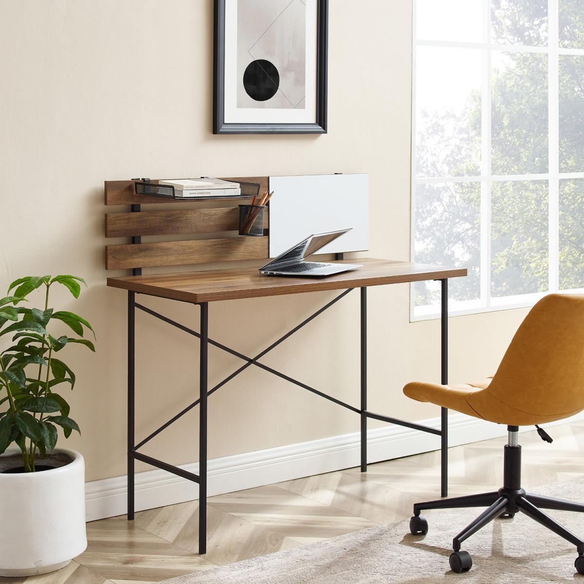 Dimensions H107 x W107 x D51 cm Contemporary and slick this small space friendly writing desk is replete with additional features that turn this laptop desk into so much more than a simple surface. It has a back extension that includes a magnetic dry erase board on the right with wood slats on the left. This ideal dorm desk also has a removable paper tray and pencil cup that is configured to rest on any of the slats so you can keep the surface of the desk clutter free. Features. Includes one adjustable pencil cup. Comes with one removable paper tray Magnetic dry erase board Slat style back with accessories Contemporary utility writing desk Easy assembly..
