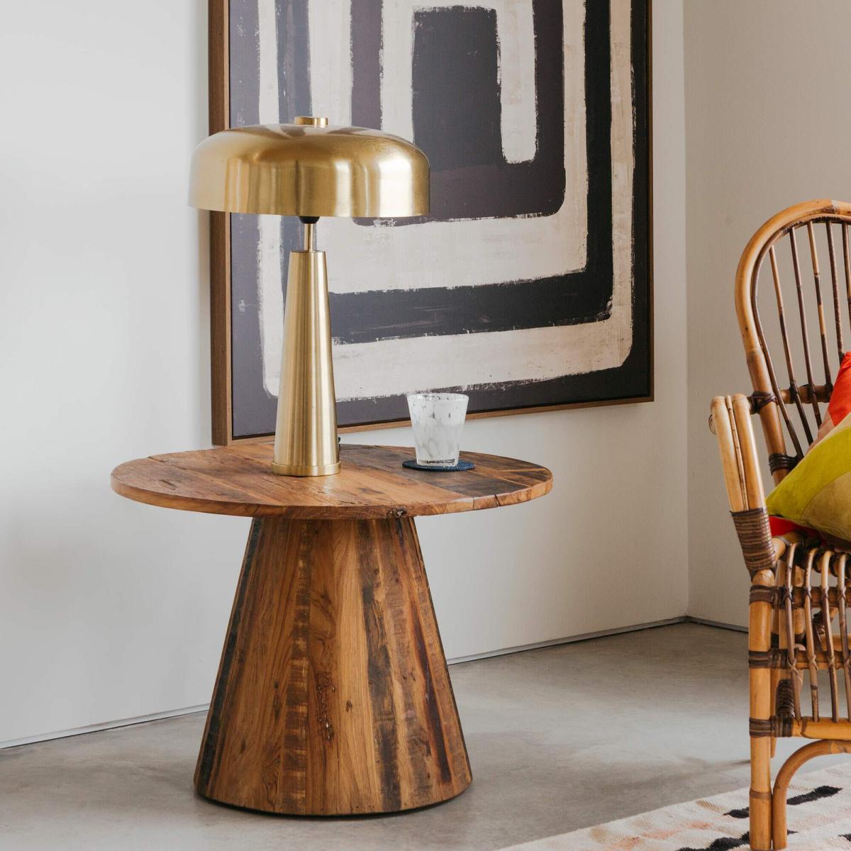 I love this little side table for its warm, natural timber finish, which adds a touch of organic texture to a range of interiors. It works particularly well in both contemporary and mid-century inspired spaces, offering versatility without overpowering other design elements. Practical styling tips include placing it beside a sofa with a stylish lamp or decorative objects to create an inviting vignette, or using it to add warmth and texture to a neutral colour palette. Its sturdy, statement form makes it a great focal point, and because of its natural wood grain, it pairs beautifully with other earthy materials like woven textures and soft textiles.