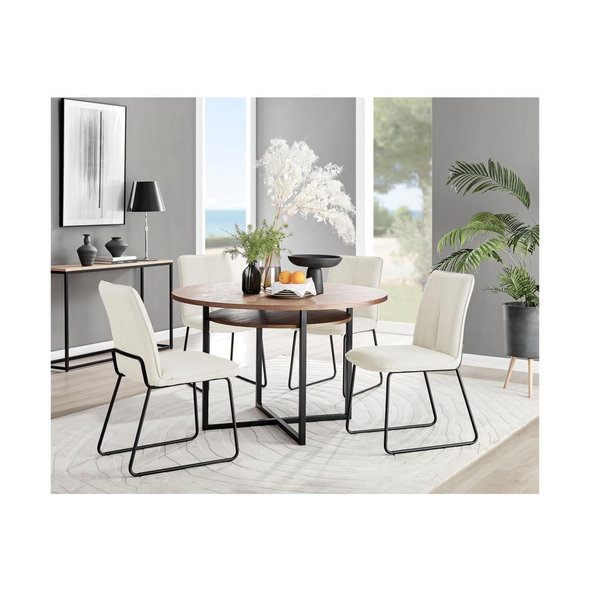 Our fabulous Adley round dining table with built-in storage shelf and structural metal legs is a big hit here at Furniturebox HQ! Designed by our own resident artist, Laura, who knows how much of a pain it is to clear off the school and office work from the table for dinner. She designed the Adley with this brilliant storage shelf, so you can quickly and easily move anything from the top out the way and keep things looking neat. We love it! A luxurious high-quality wood veneer finish to the top and storage shelf, and industrial black metal legs that form an eye-catching cross at the base. Comfortably seats 4. This will absolutely be a centrepiece for your home, serving all the form and the function. Easy wipeclean surfaces will keep it looking new for years to come. Also available in a range of other coloursmaterials. The Halle chair is a super-stylish design with nods to postmodern mid-century classic elements. The clean lines of the deep-padded seat and on-trend industrial metal legs connected front and back with open diamond spaces will keep your dining or living room looking chic and classy. The soft fabric of these dining chairs will add warm tones to your dining room. The black powder coated metal legs have a matte effect which adds an industrial design to these contemporary dining chairs.