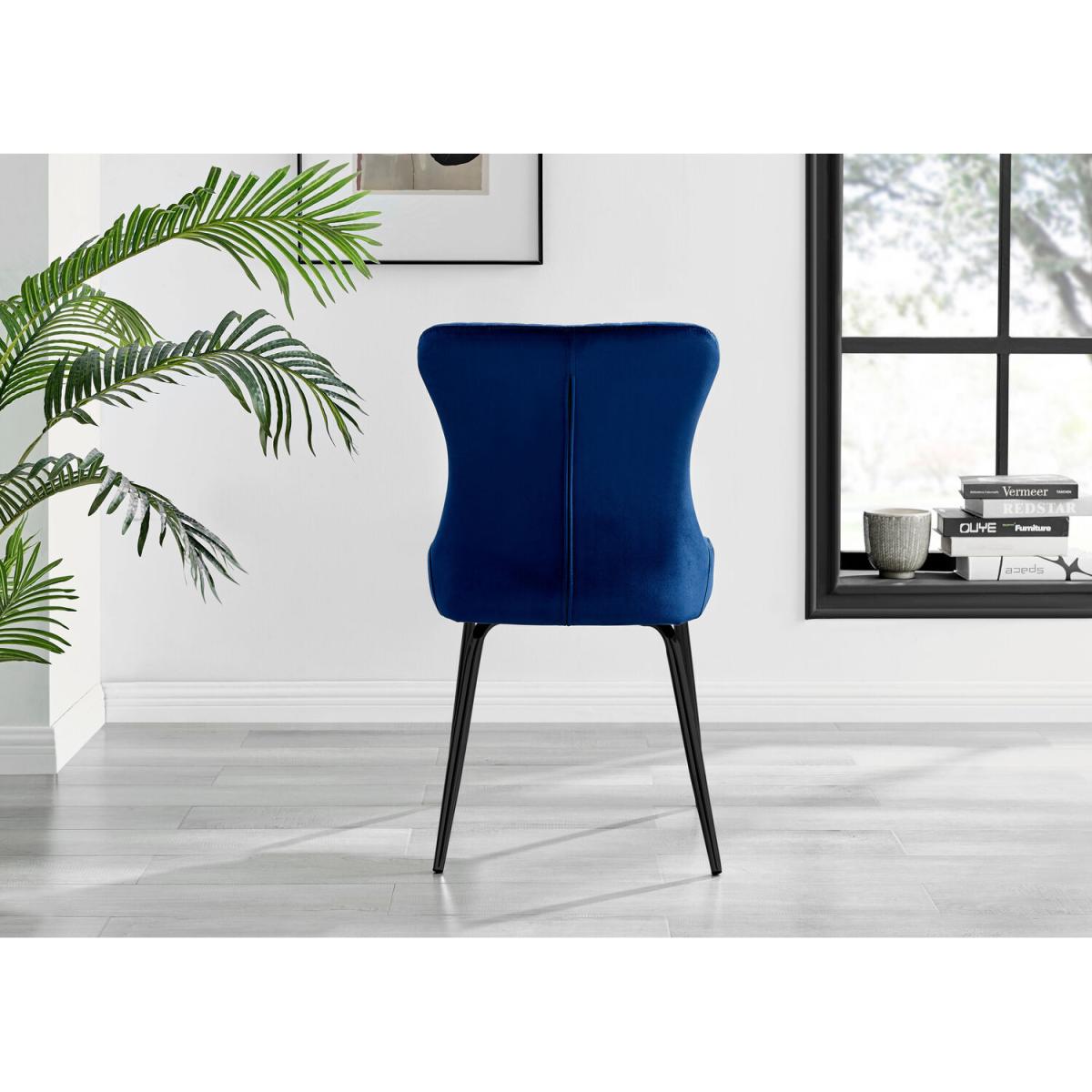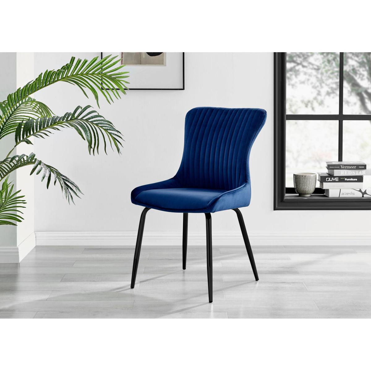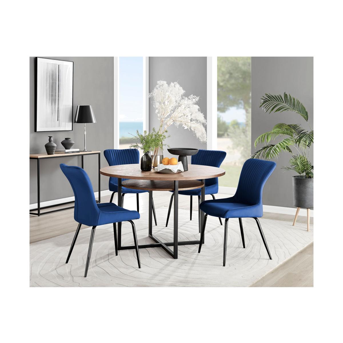 Our fabulous Adley round dining table with built-in storage shelf and structural metal legs is a big hit here at Furniturebox HQ! Designed by our own resident artist, Laura, who knows how much of a pain it is to clear off the school and office work from the table for dinner. She designed the Adley with this brilliant storage shelf, so you can quickly and easily move anything from the top out the way and keep things looking neat. We love it! A luxurious high-quality wood veneer finish to the top and storage shelf, and industrial black metal legs that form an eye-catching cross at the base. Comfortably seats 4. This will absolutely be a centrepiece for your home, serving all the form and the function. Easy wipeclean surfaces will keep it looking new for years to come. Also available in a range of other coloursmaterials. The Nora chair is a super-stylish modern chair with a nod to the classic wingback design. The elegant vertical piping stitching to the back and ergonomically designed seat sat on 4 slightly tapered legs make this uncluttered, classy and comfortable. This modern dining chair is upholstered in a soft velvet fabric which is modern and sophisticated. The black powder coated metal legs have a matte effect which adds an industrial design to these contemporary dining chairs.