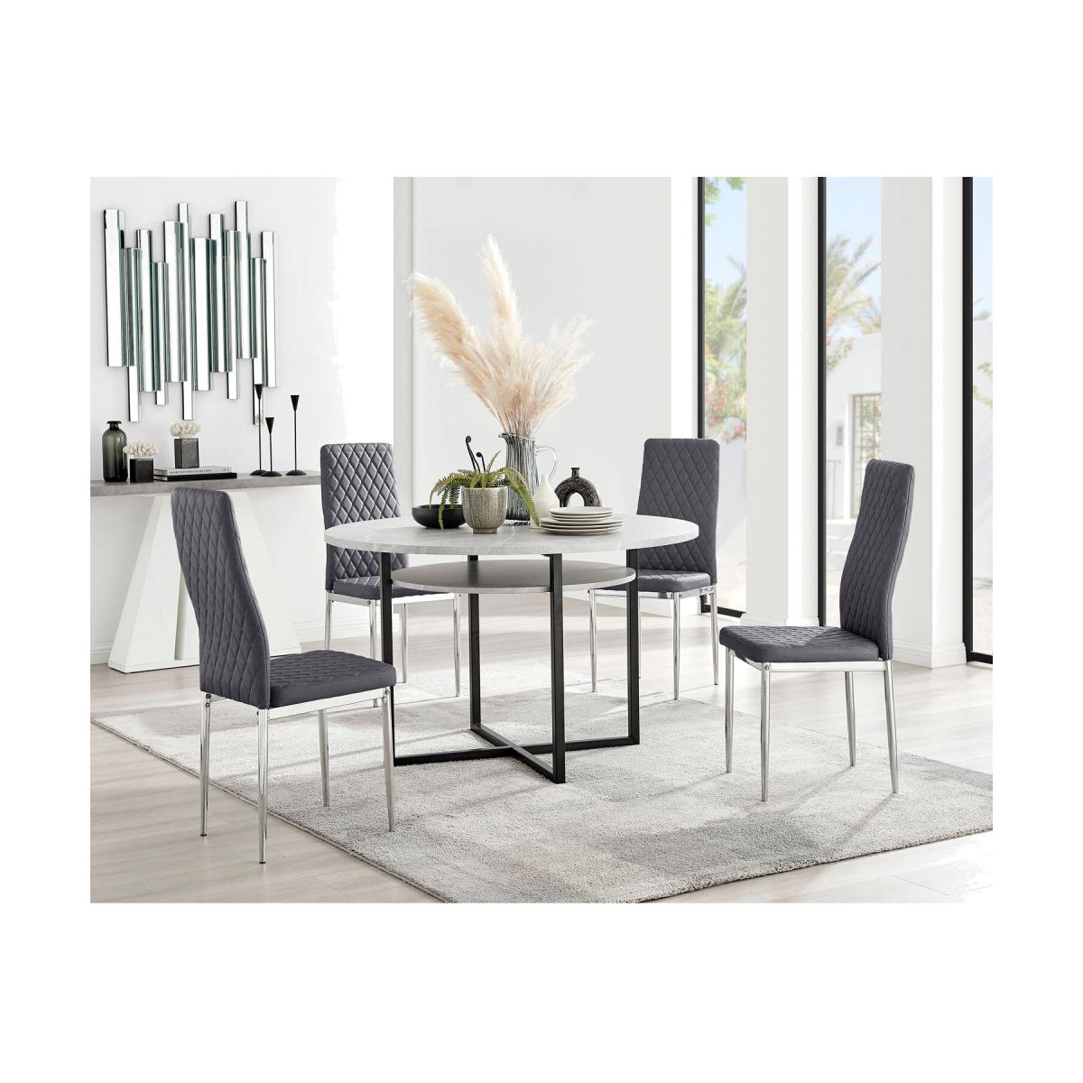 Our fabulous Adley round dining table with built-in storage shelf and structural metal legs is a big hit here at Furniturebox HQ! Designed by our own resident artist, Laura, who knows how much of a pain it is to clear off the school and office work from the table for dinner. She designed the Adley with this brilliant storage shelf, so you can quickly and easily move anything from the top out the way and keep things looking neat. We love it! A luxurious high-quality matte grey concrete finish to the top and storage shelf, and structural industrial black metal legs that form an eye-catching cross at the base. Comfortably seats 4. This will absolutely be a centrepiece for your home, serving all the form and the function. Easy wipeclean surfaces will keep it looking new for years to come. Also available in a range of other coloursmaterials. Upholstered in soft touch grey velvet and finished with diamond pattern stitching the Milan dining chairs would seamlessly fit in with most dining spaces, whilst not compromising on either style or comfort. The stylish shiny chrome silver leg and hatched velvet combination gives this chair a contemporary edge, whilst it's simple design allows for practical everyday usage. The chairs are made from high quality durable velvet that's easy to keep clean and are ergonomically designed for maximum comfort and support. They feature a deep foam seat cushion and plastic feet to protect the floor from any damage! At an unbeatable price you cannot go wrong with these chairs!