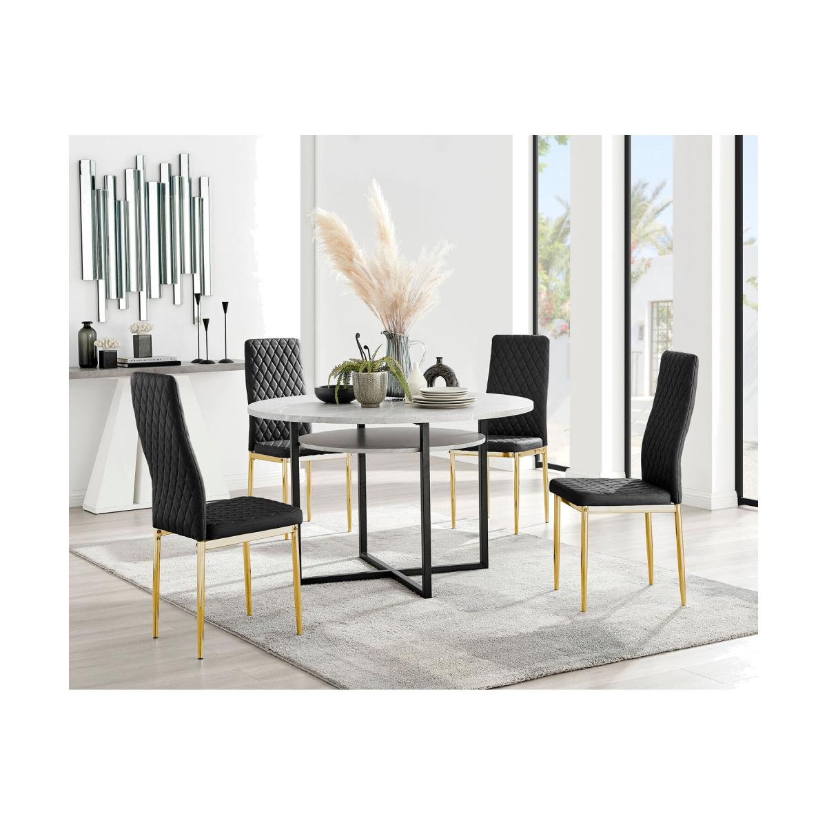 Our fabulous Adley round dining table with built-in storage shelf and structural metal legs is a big hit here at Furniturebox HQ! Designed by our own resident artist, Laura, who knows how much of a pain it is to clear off the school and office work from the table for dinner. She designed the Adley with this brilliant storage shelf, so you can quickly and easily move anything from the top out the way and keep things looking neat. We love it! A luxurious high-quality matte grey concrete finish to the top and storage shelf, and structural industrial black metal legs that form an eye-catching cross at the base. Comfortably seats 4. This will absolutely be a centrepiece for your home, serving all the form and the function. Easy wipeclean surfaces will keep it looking new for years to come. Also available in a range of other coloursmaterials. Upholstered in soft touch black velvet and finished with diamond pattern stitching the Milan dining chairs would seamlessly fit in with most dining spaces, whilst not compromising on either style or comfort. The stylish gold shiny chrome metal leg and hatched velvet combination gives this chair a contemporary edge, whilst it's simple design allows for practical everyday usage. The chairs are made from high quality durable velvet that's easy to keep clean and are ergonomically designed for maximum comfort and support. They feature a deep foam seat cushion and plastic feet to protect the floor from any damage! At an unbeatable price you cannot go wrong with these chairs!