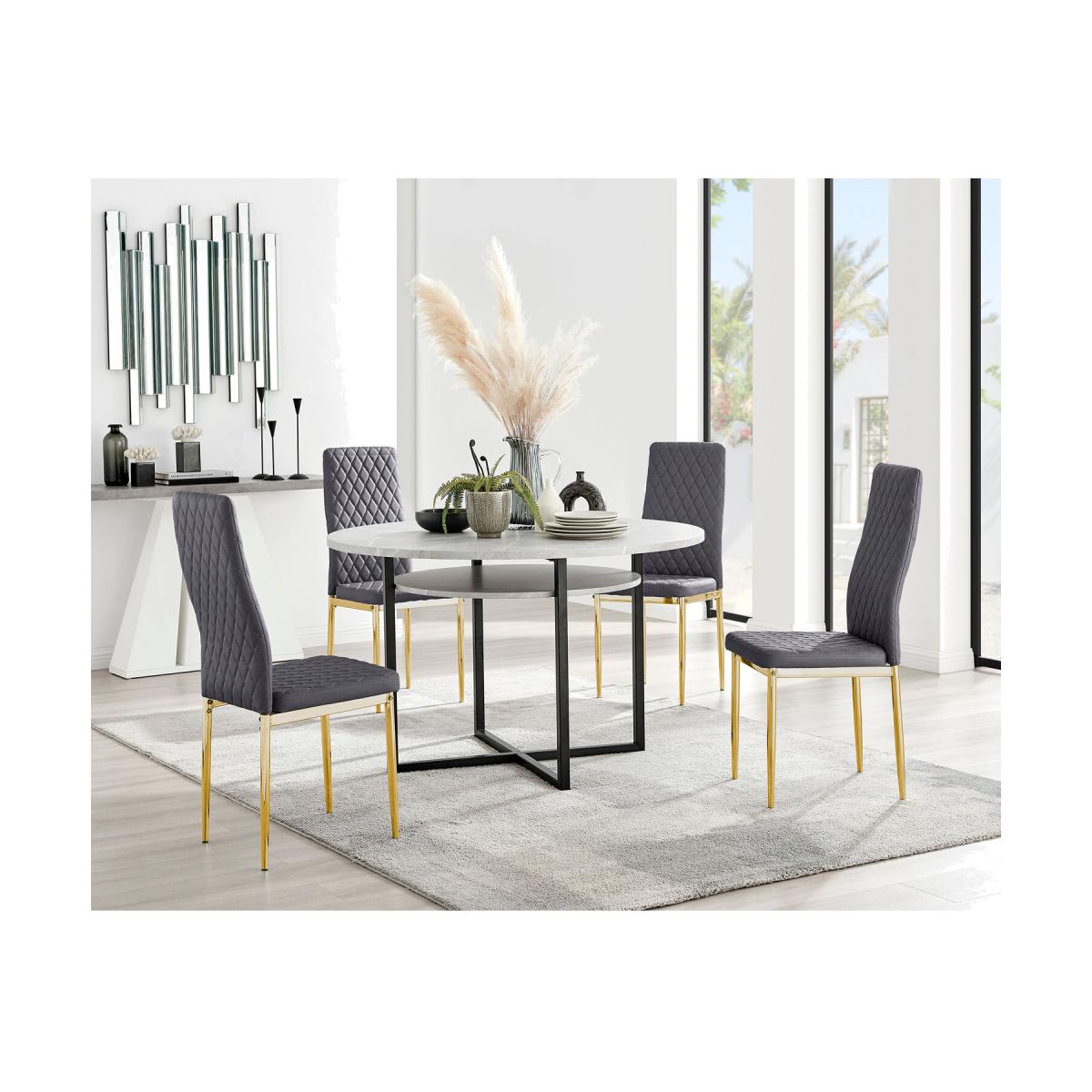 Our fabulous Adley round dining table with built-in storage shelf and structural metal legs is a big hit here at Furniturebox HQ! Designed by our own resident artist, Laura, who knows how much of a pain it is to clear off the school and office work from the table for dinner. She designed the Adley with this brilliant storage shelf, so you can quickly and easily move anything from the top out the way and keep things looking neat. We love it! A luxurious high-quality matte grey concrete finish to the top and storage shelf, and structural industrial black metal legs that form an eye-catching cross at the base. Comfortably seats 4. This will absolutely be a centrepiece for your home, serving all the form and the function. Easy wipeclean surfaces will keep it looking new for years to come. Also available in a range of other coloursmaterials. Upholstered in soft touch grey velvet and finished with diamond pattern stitching the Milan dining chairs would seamlessly fit in with most dining spaces, whilst not compromising on either style or comfort. The stylish gold shiny chrome metal leg and hatched velvet combination gives this chair a contemporary edge, whilst it's simple design allows for practical everyday usage. The chairs are made from high quality durable velvet that's easy to keep clean and are ergonomically designed for maximum comfort and support. They feature a deep foam seat cushion and plastic feet to protect the floor from any damage! At an unbeatable price you cannot go wrong with these chairs!