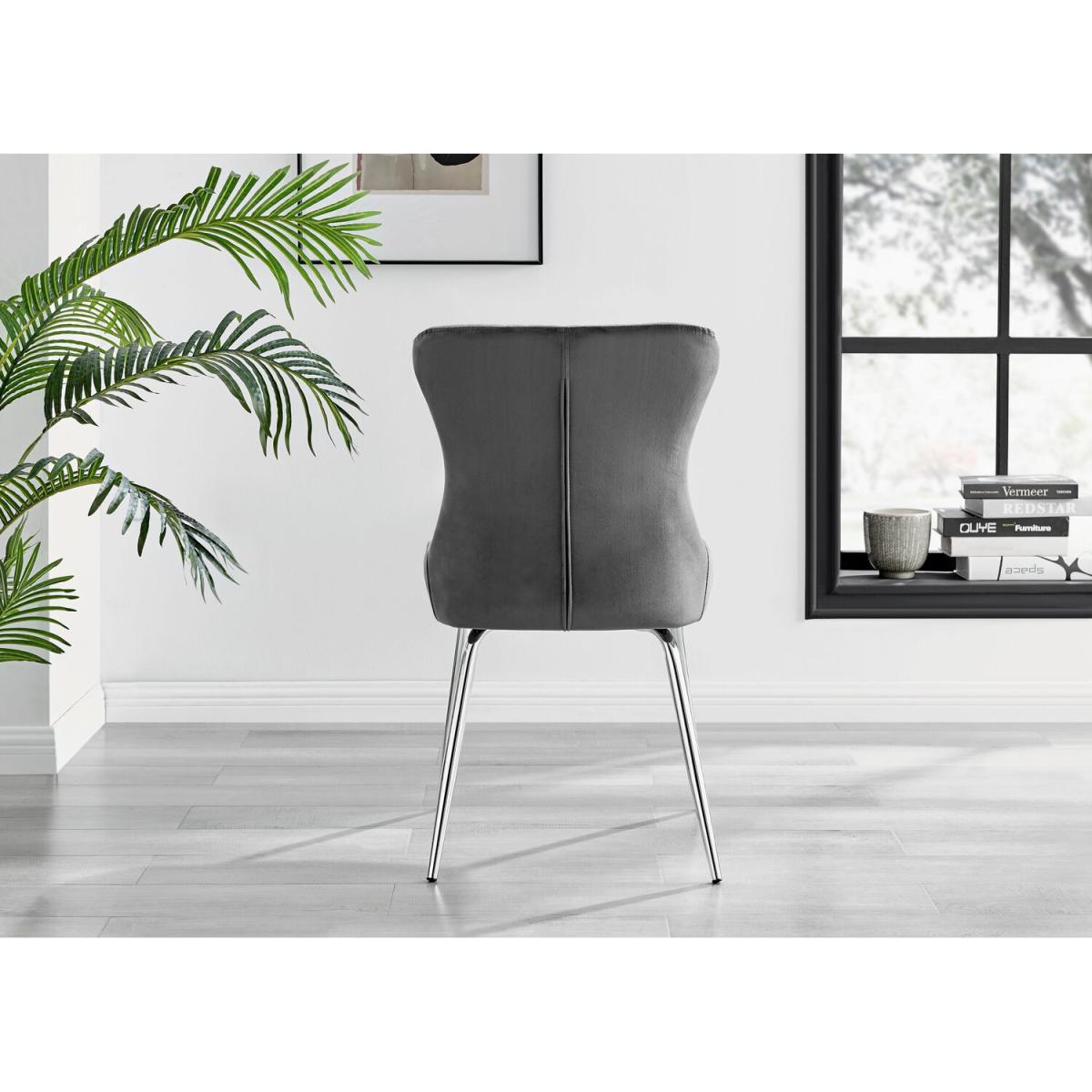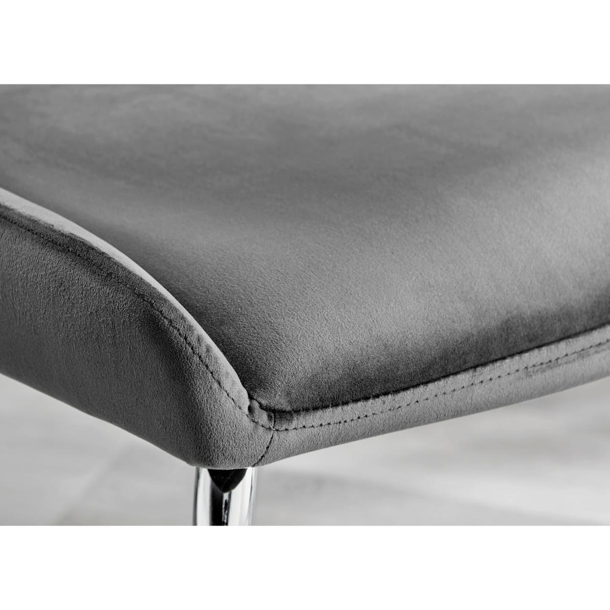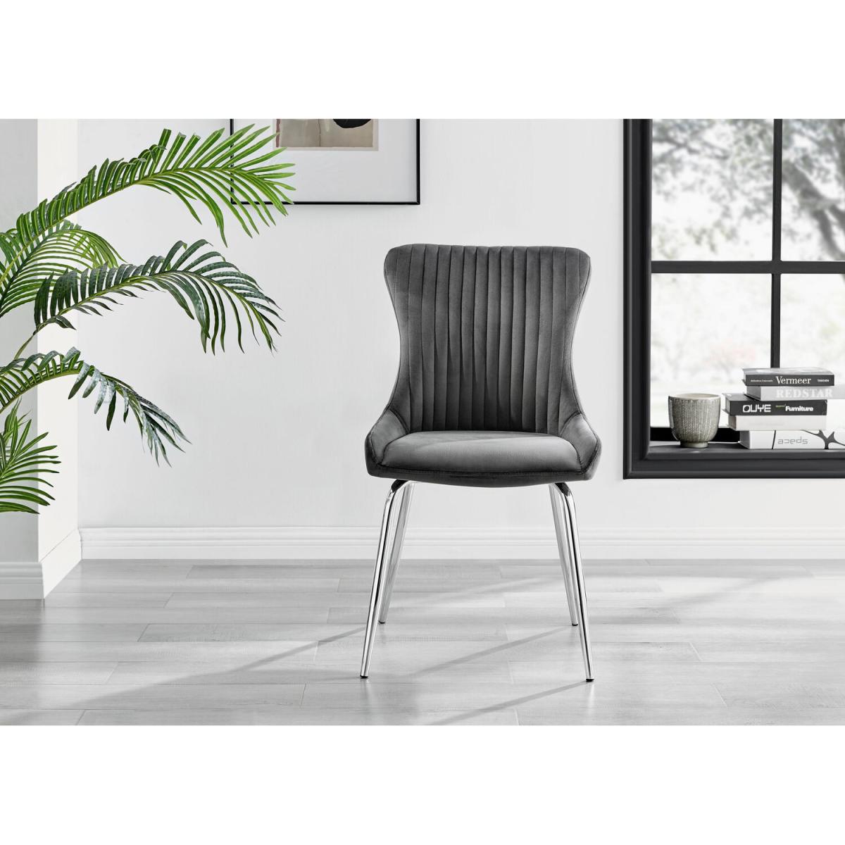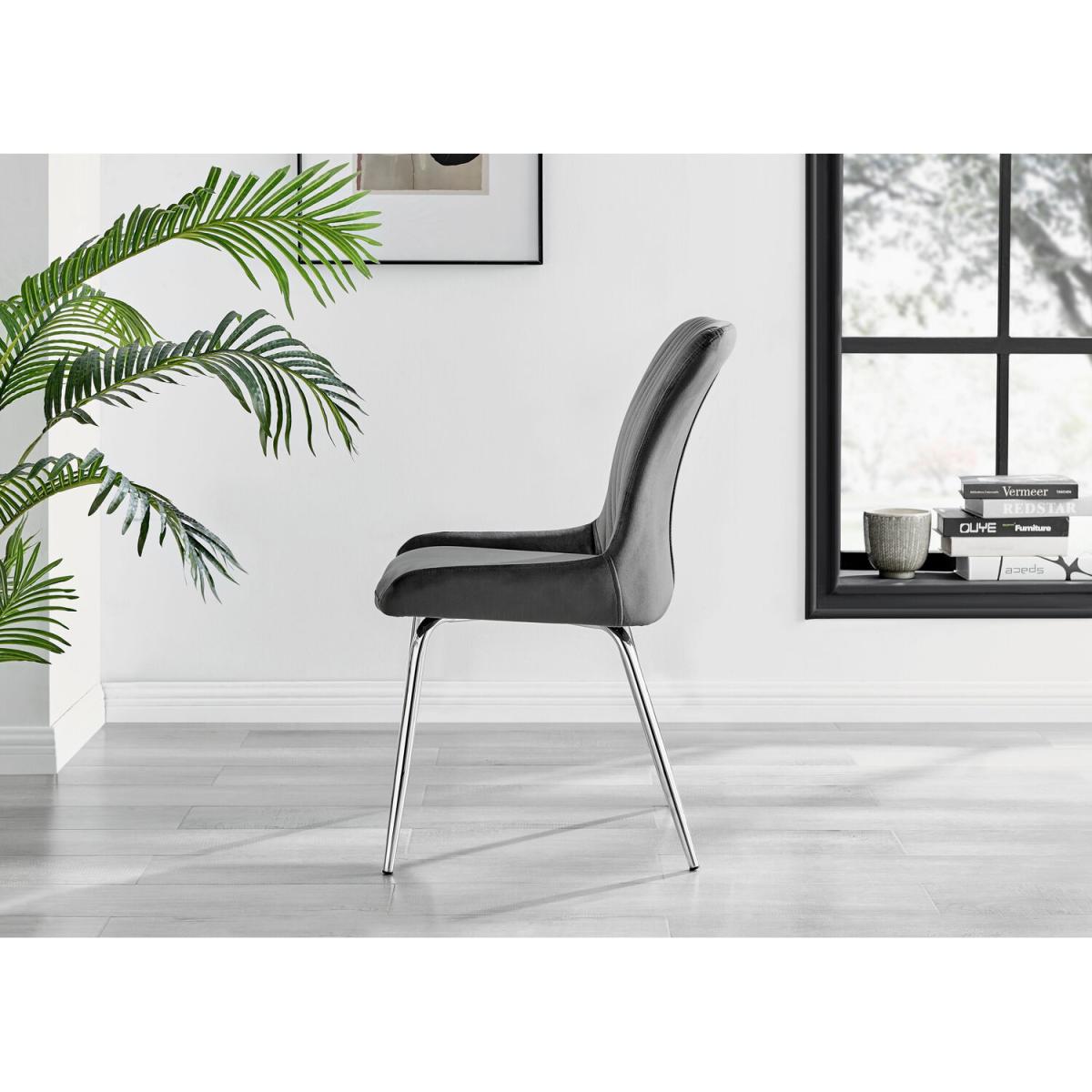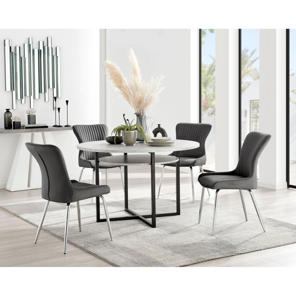 Our fabulous Adley round dining table with built-in storage shelf and structural metal legs is a big hit here at Furniturebox HQ! Designed by our own resident artist, Laura, who knows how much of a pain it is to clear off the school and office work from the table for dinner. She designed the Adley with this brilliant storage shelf, so you can quickly and easily move anything from the top out the way and keep things looking neat. We love it! A luxurious high-quality matte grey concrete finish to the top and storage shelf, and structural industrial black metal legs that form an eye-catching cross at the base. Comfortably seats 4. This will absolutely be a centrepiece for your home, serving all the form and the function. Easy wipeclean surfaces will keep it looking new for years to come. Also available in a range of other coloursmaterials. The Nora chair is a super-stylish modern chair with a nod to the classic wingback design. The elegant vertical piping stitching to the back and ergonomically designed seat sat on 4 slightly tapered legs make this uncluttered, classy and comfortable. This modern dining chair is upholstered in a soft velvet fabric which is modern and sophisticated. For an ultra modern touch on your dining set, choose this silver chrome leg design which beautifully compliments the rest of the dining chair design.