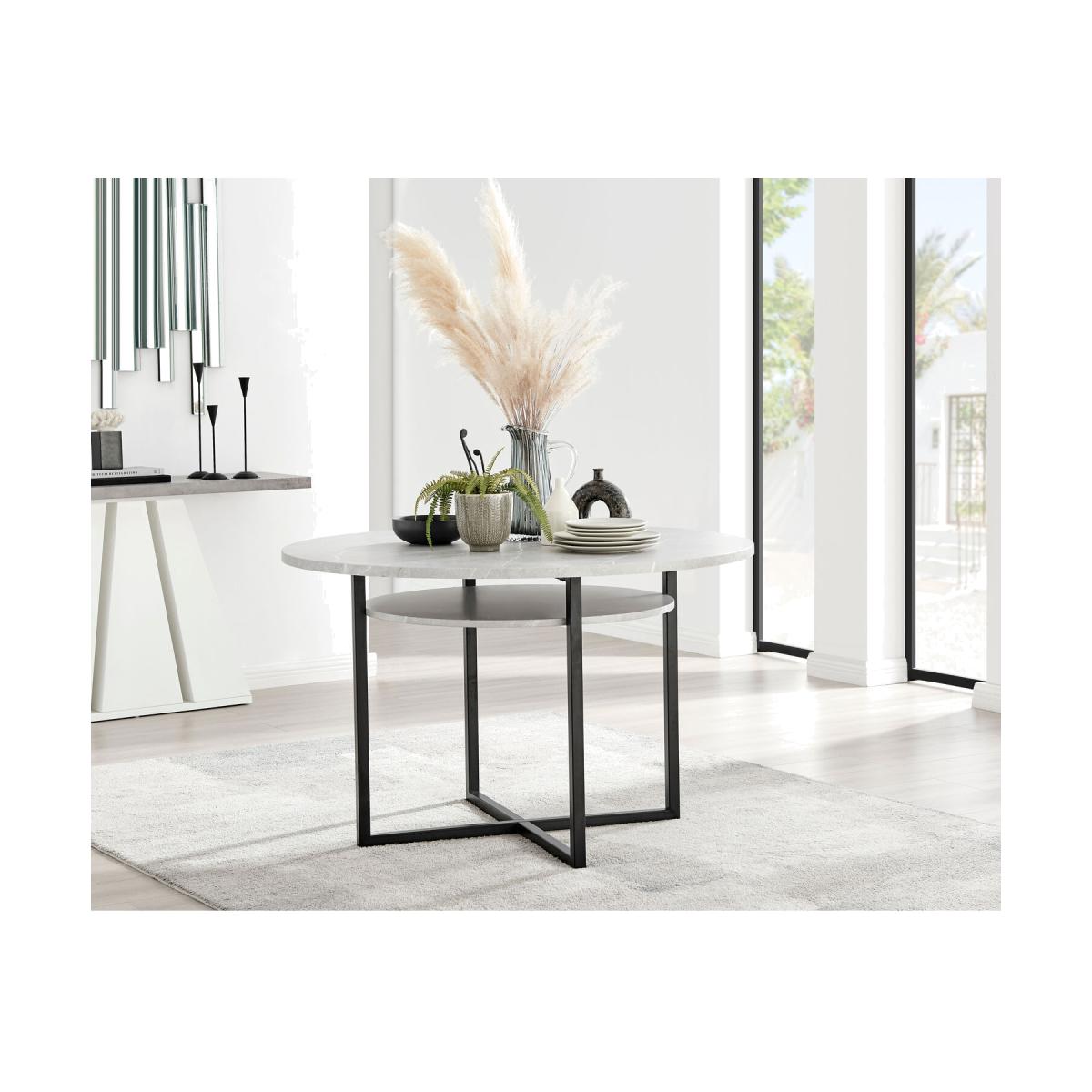 Our fabulous Adley round dining table with built-in storage shelf and structural metal legs is a big hit here at Furniturebox HQ! Designed by our own resident artist, Laura, who knows how much of a pain it is to clear off the school and office work from the table for dinner. She designed the Adley with this brilliant storage shelf, so you can quickly and easily move anything from the top out the way and keep things looking neat. We love it! A luxurious high-quality matte grey concrete finish to the top and storage shelf, and structural industrial black metal legs that form an eye-catching cross at the base. Comfortably seats 4. This will absolutely be a centrepiece for your home, serving all the form and the function. Easy wipe-clean surfaces will keep it looking new for years to come. Also available in a range of other colours materials.