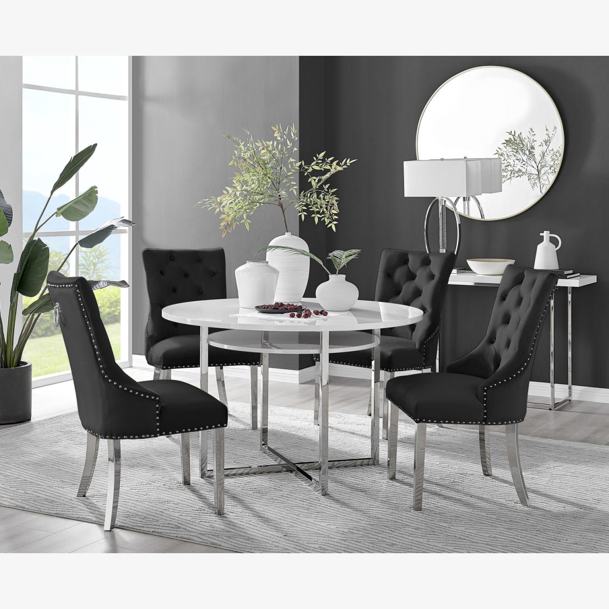 Our fabulous Adley round dining table with built-in storage shelf and structural metal legs is a big hit here at Furniturebox HQ! Designed by our own resident artist, Laura, who knows how much of a pain it is to clear off the school and office work from the table for dinner. She designed the Adley with this brilliant storage shelf, so you can quickly and easily move anything from the top out the way and keep things looking neat. We love it! A luxurious high-quality white glossy veneer finish to the top and storage shelf, and structural silver chrome legs that form an eye-catching cross at the base. Comfortably seats 4. This will absolutely be a centrepiece for your home, serving all the form and the function. Easy wipe clean surfaces will keep it looking new for years to come. Also available in a range of other colours and materials. The Belgravia knocker chair is the ultimate in dining chair opulence with its scoop back design that allows you and your guests to lean back and feel supported by the wrap-around arms. Stylish Chesterfield-inspired button tufting and diamond stitching add to the modern chic look. The design gives us straight lines and soft padded curves contemporary and comfortable. The thick filled seat cushion is supportive and comfortable and is complemented by the velvet fabric. These ultra-modern chairs have subtle chrome button detailing along the trim of the seat and around the back of the chair which pairs beautifully with the chrome legs and knocker. These little details, with the soft colour, keep this chair light, bright and elegant. The highlight of the Belgravia chair is the chrome knocker on the back of the chair which is a popular feature for both modern and traditional dining rooms. Anyone for a lovely dinner party or some cocktails sat in one of these! We're in love!