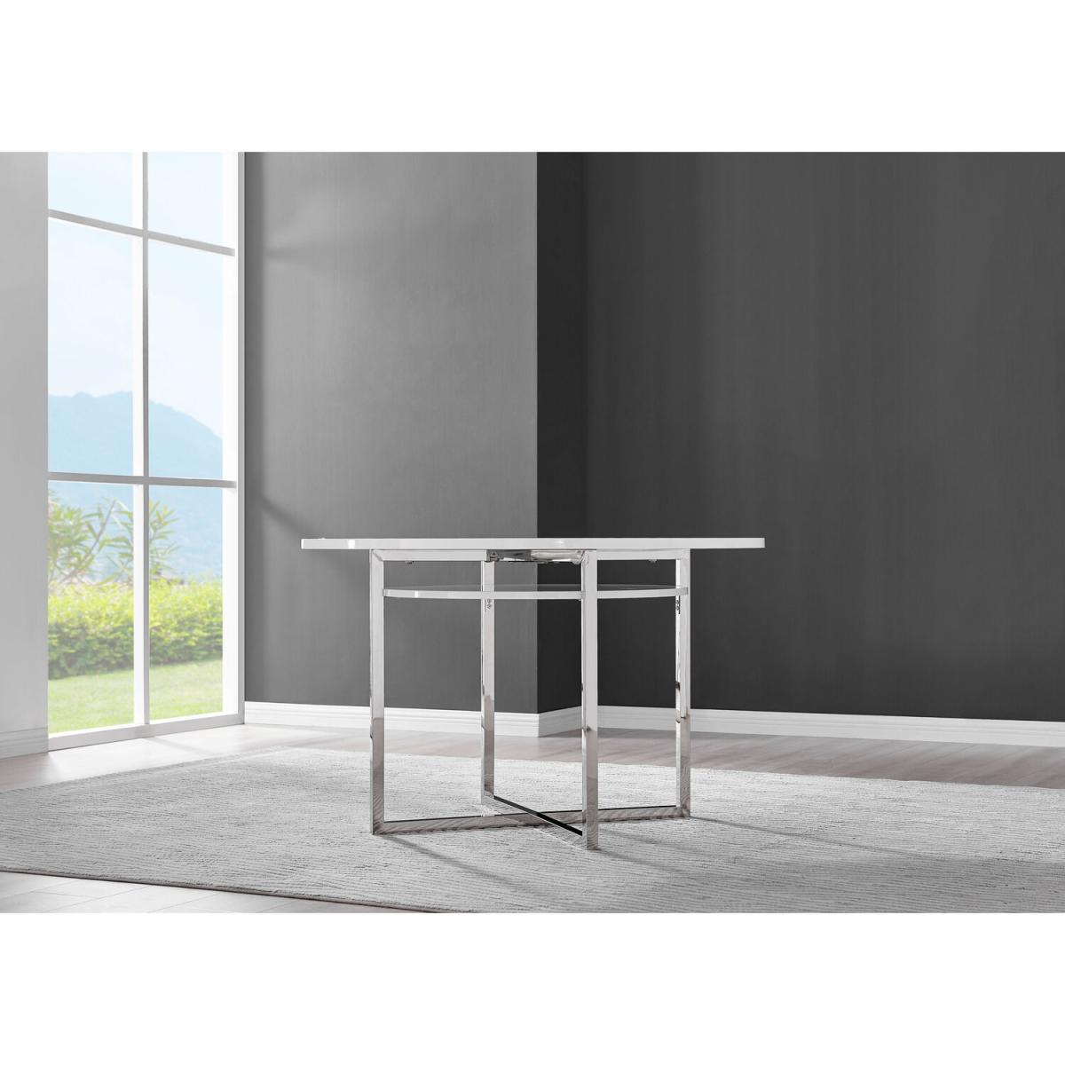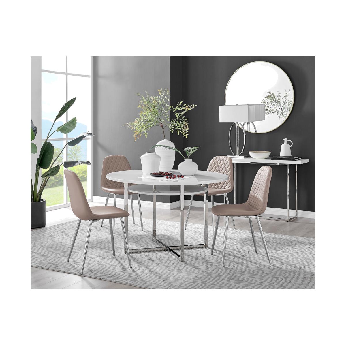 Our fabulous Adley round dining table with built-in storage shelf and structural metal legs is a big hit here at Furniturebox HQ! Designed by our own resident artist, Laura, who knows how much of a pain it is to clear off the school and office work from the table for dinner. She designed the Adley with this brilliant storage shelf, so you can quickly and easily move anything from the top out the way and keep things looking neat. We love it! A luxurious high-quality white glossy veneer finish to the top and storage shelf, and structural silver chrome legs that form an eye-catching cross at the base. Comfortably seats 4. This will absolutely be a centrepiece for your home, serving all the form and the function. Easy wipeclean surfaces will keep it looking new for years to come. Also available in a range of other coloursmaterials. With a perfect balance of pattern and texture the new Corona Chair is a statement piece ready for the modern dining space. The trendy chrome legs are all the rage and offer a perfect way to add an accent of lustre to your home. The Scandi-style faux leather seat with diamond pattern stitching is a unique take on a classic design offering comfort and durability for everyday use.
