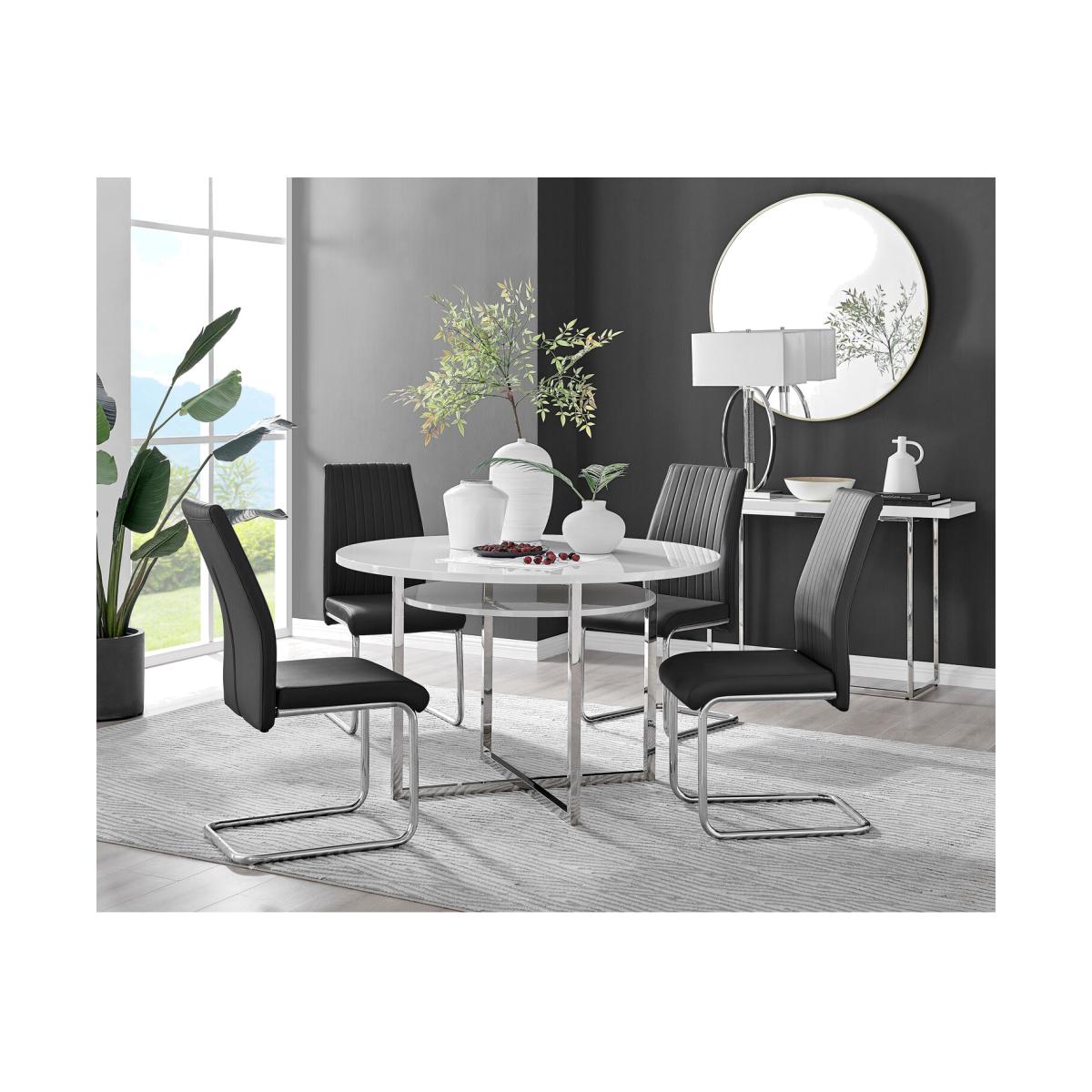 Our fabulous Adley round dining table with built-in storage shelf and structural metal legs is a big hit here at Furniturebox HQ! Designed by our own resident artist, Laura, who knows how much of a pain it is to clear off the school and office work from the table for dinner. She designed the Adley with this brilliant storage shelf, so you can quickly and easily move anything from the top out the way and keep things looking neat. We love it! A luxurious high-quality white glossy veneer finish to the top and storage shelf, and structural silver chrome legs that form an eye-catching cross at the base. Comfortably seats 4. This will absolutely be a centrepiece for your home, serving all the form and the function. Easy wipeclean surfaces will keep it looking new for years to come. Also available in a range of other coloursmaterials. The stylish, curved chrome leg and stitched leather combination gives this chair a contemporary edge, whilst it's simple design allows for practical everyday usage. The Lorenzo chairs are made from high quality, soft touch faux leather and are ergonomically designed for maximum comfort and support. Featuring a deep foam seat cushion these chairs are a delight to sit on and the plastic feet protect the floor from any damage! At a truly unbeatable price add some class to your dining room with these Lorenzo dining chairs!