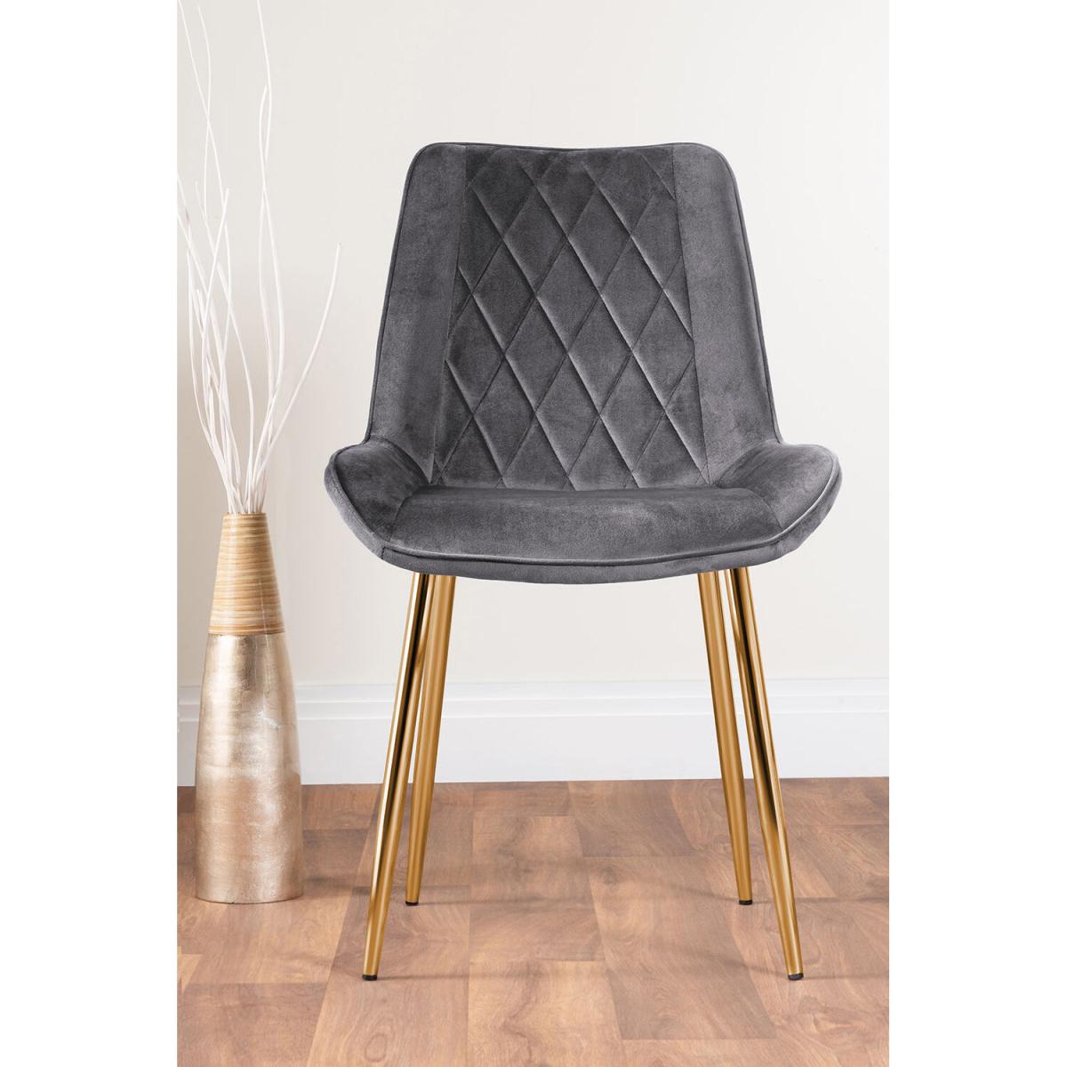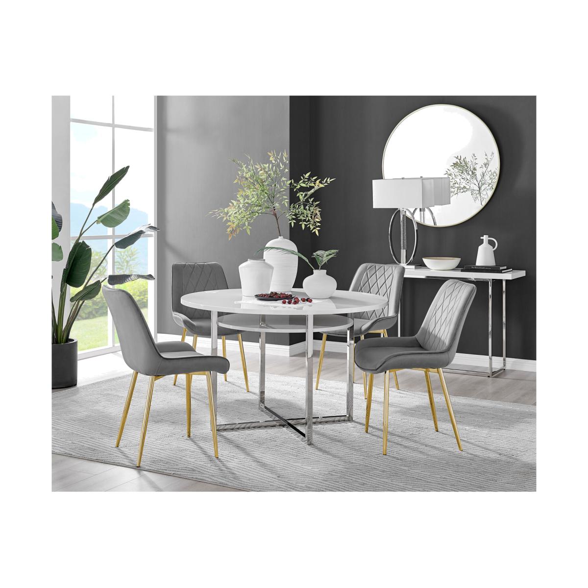 Our fabulous Adley round dining table with built-in storage shelf and structural metal legs is a big hit here at Furniturebox HQ! Designed by our own resident artist, Laura, who knows how much of a pain it is to clear off the school and office work from the table for dinner. She designed the Adley with this brilliant storage shelf, so you can quickly and easily move anything from the top out the way and keep things looking neat. We love it! A luxurious high-quality white glossy veneer finish to the top and storage shelf, and structural silver chrome legs that form an eye-catching cross at the base. Comfortably seats 4. This will absolutely be a centrepiece for your home, serving all the form and the function. Easy wipeclean surfaces will keep it looking new for years to come. Also available in a range of other coloursmaterials. Modernise your dining area with our luxurious velvet upholstered Pesaro Dining Chairs. With a nod to the Mid-century modern design era, the Pesaro features gorgeous textured diamond stitching with an ergonomically designed curved seat pad blending seamlessly to the supporting medium high back rest. Sat atop elegant slightly tapered legs in black, chrome or gold effect. The Pesaro is a perfect match to any dining table or use as a luxe vanity seat in the bedroom, as an occasional chair for the living area or to add a bit of luxury to your home office.