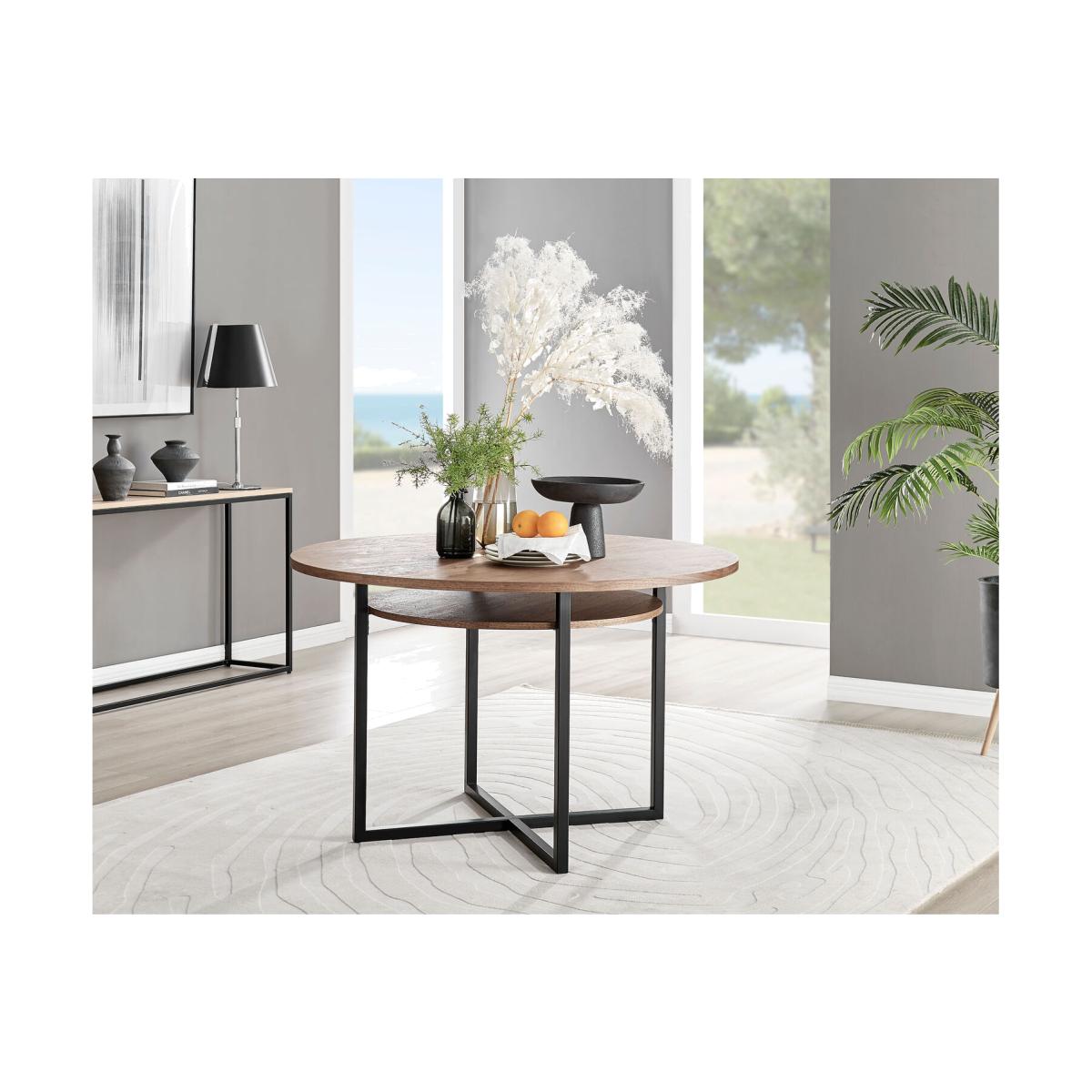 Our fabulous Adley round dining table with built-in storage shelf and structural metal legs is a big hit here at Furniturebox HQ! Designed by our own resident artist, Laura, who knows how much of a pain it is to clear off the school and office work from the table for dinner. She designed the Adley with this brilliant storage shelf, so you can quickly and easily move anything from the top out the way and keep things looking neat. We love it! A luxurious high-quality wood veneer finish to the top and storage shelf, and industrial black metal legs that form an eye-catching cross at the base. Comfortably seats 4. This will absolutely be a centrepiece for your home, serving all the form and the function. Easy wipe-clean surfaces will keep it looking new for years to come. Also available in a range of other colours materials.