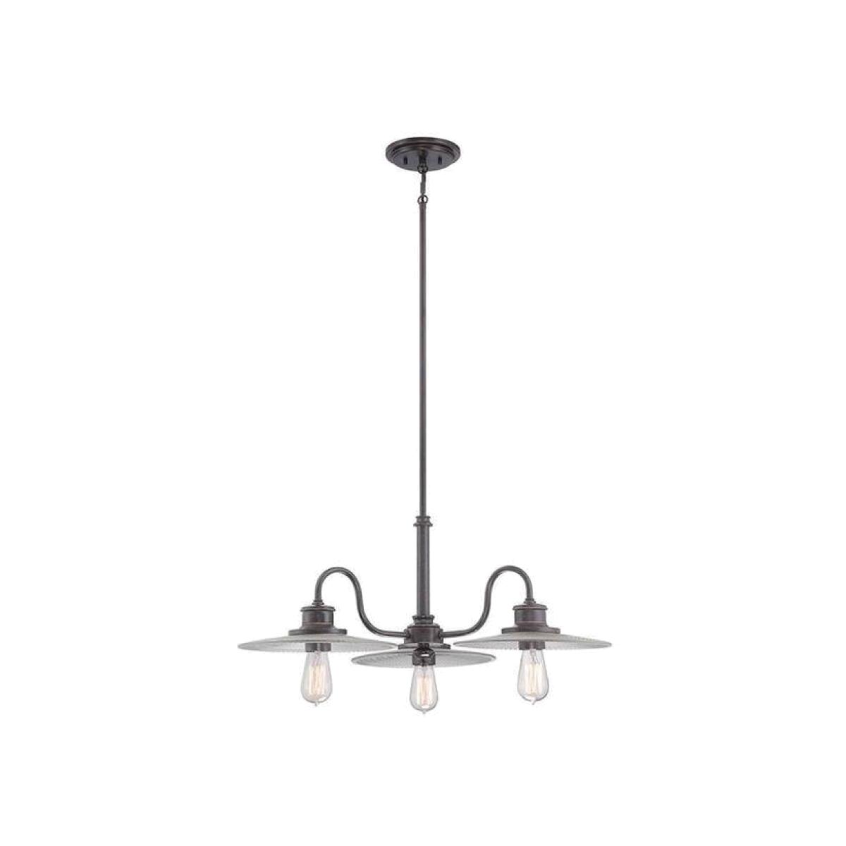 This chandelier is reminiscent of the coastal board-walks of the past. Finished in Imperial Bronze. The Victorian Edison style bulb adds the perfect vintage touch and highlights the clear ribbed glass. Also available in this range Wall Light, and Mini Pendant.
