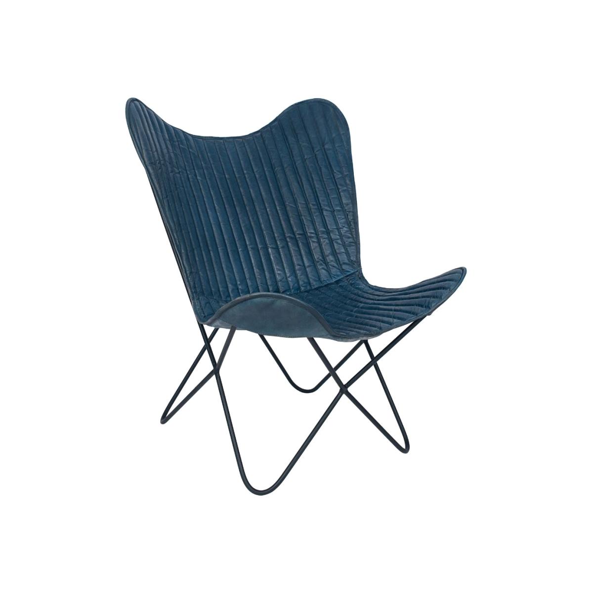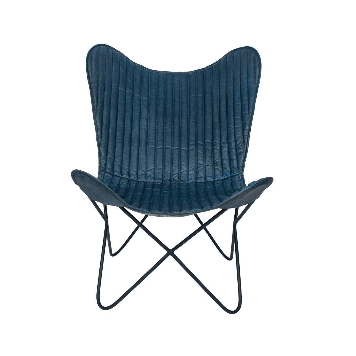 Deep blue and iron butterfly chair. Stylish in design, the Admiral seat combines practicality and style. Boasting a soft prussian blue leather and iron frame, this trendy seat will be perfect in any room of the home.