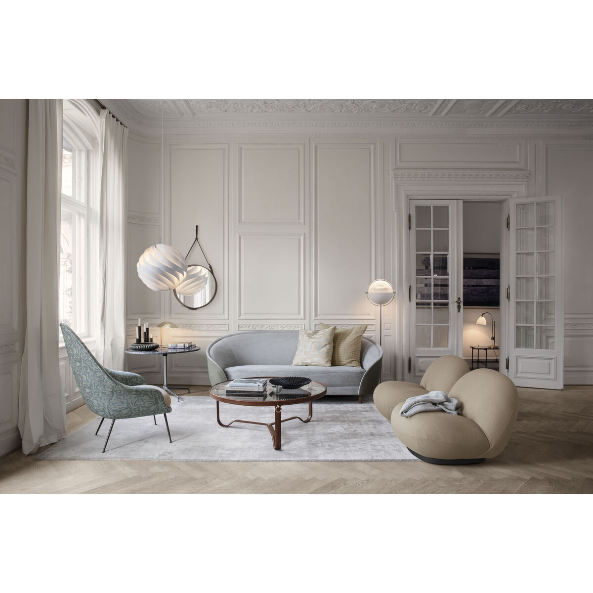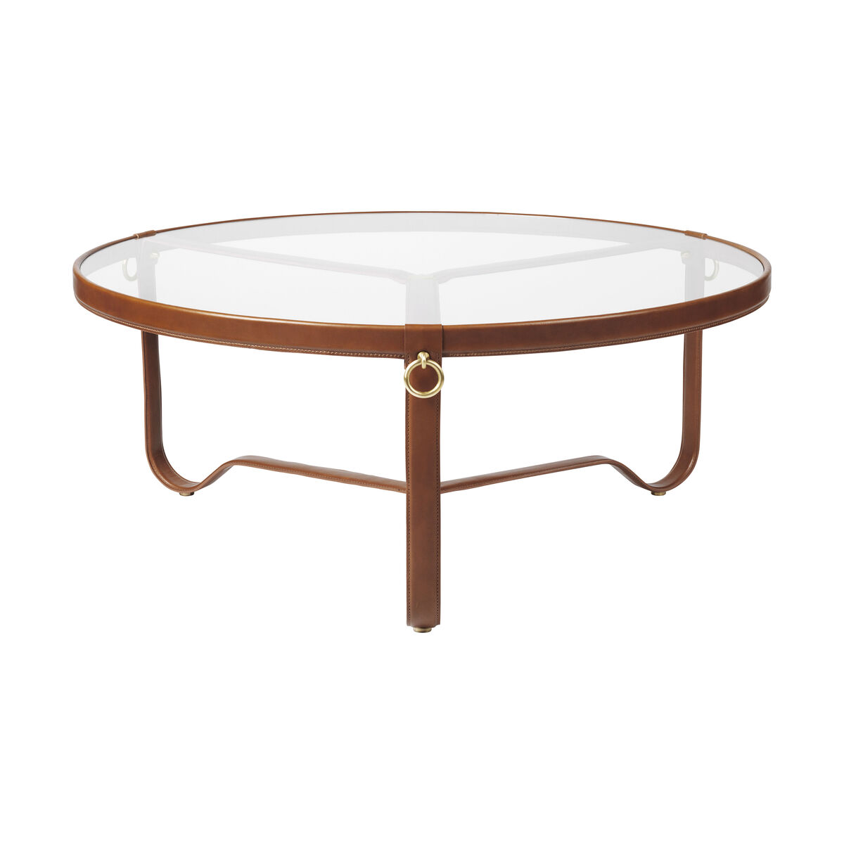 Possessing a rare elegance, this coffee table that mixes leather and glass was designed by French architect and designer Jacques Adnet (1901-1981) in the 50s. Deeply rooted in the Art Deco movement that began in Paris in the 1920s, Jacques Adnet is known for his avant-garde design. He was one of the first to combine leather, metal and glass. In 1950, he entered into a partnership with Hermès, with which he developed a collection of furniture and accessories covered with leather. His style is the pinnacle of luxury. This coffee table consists of a glass top lined with luxurious Italian leather and adorned with three golden brass rings. This stylistic detail evokes luxury leather goods. The curved metal legs, also covered with leather, meet elegantly in the middle of the table. An exceptional piece of furniture.
