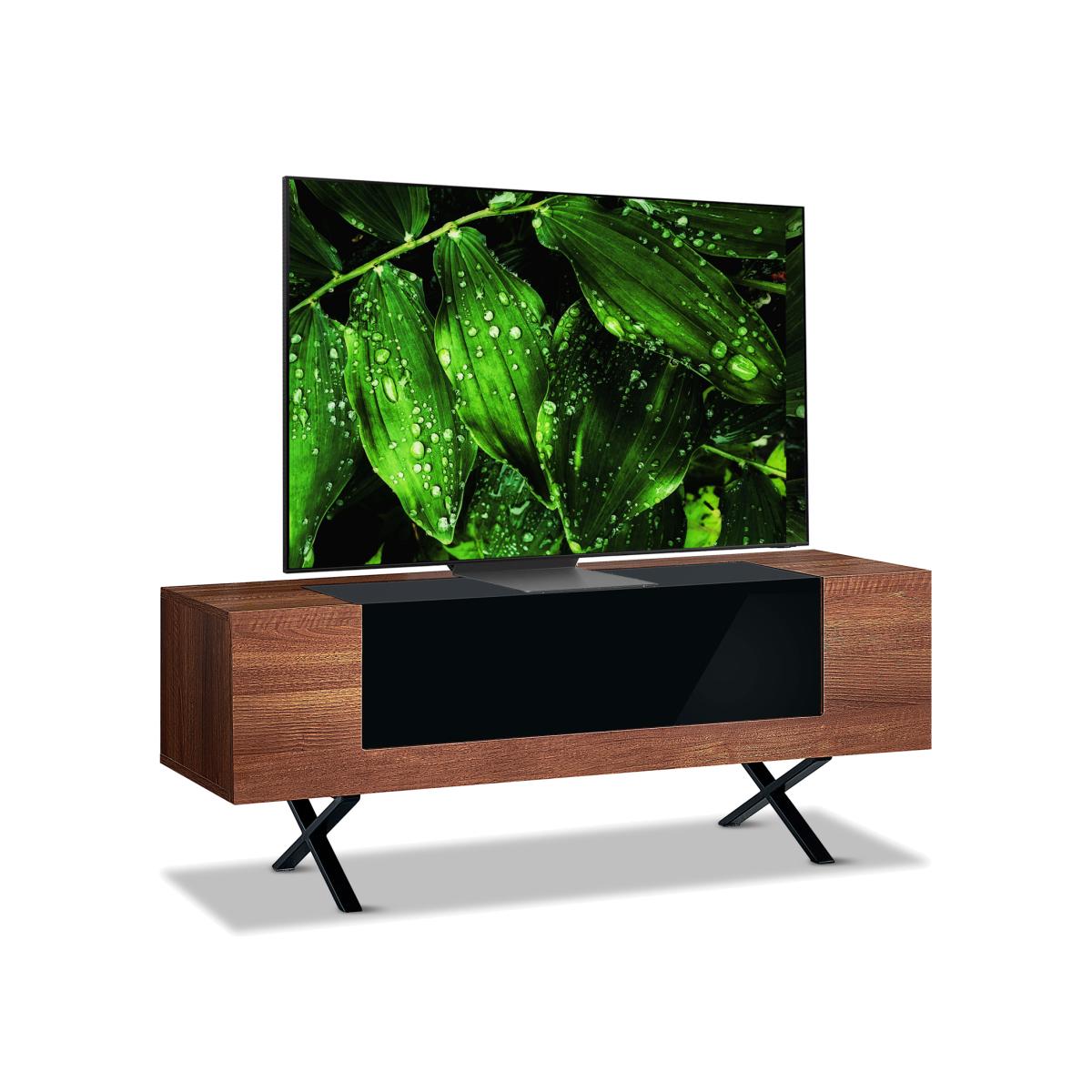 The luxurious Adonis TV cabinet is suitable for all LED, LCD, and OLED flat screen TVs up to 55", with space to accommodate most home cinema systems, blu-ray player, Sky/Virgin/BT receivers, amplifiers, digital boxes and games consoles. The Adonis TV stand comes with the revolutionary BEAMTHRU Remote Friendly system, to allow remote control signals to pass through the glass and operate your equipment with ease. A Powerful perpendicular cabinet with stylish X-Frame matt black legs and rubber feet protectors, the Adonis TV unit is finished in walnut with a contrasting black easy-close door. Combining style with safety, the Adonis living room cabinet has toughened safety glass supports (BS6206. A) to relevant British standards. It also comes flat packed and complete with clear and concise manual for easy Self-Assembly. Dimensions: Width: 120cm x Depth: 40cm x Height: 46.5cm / Maximum TV Weight: 50kg.