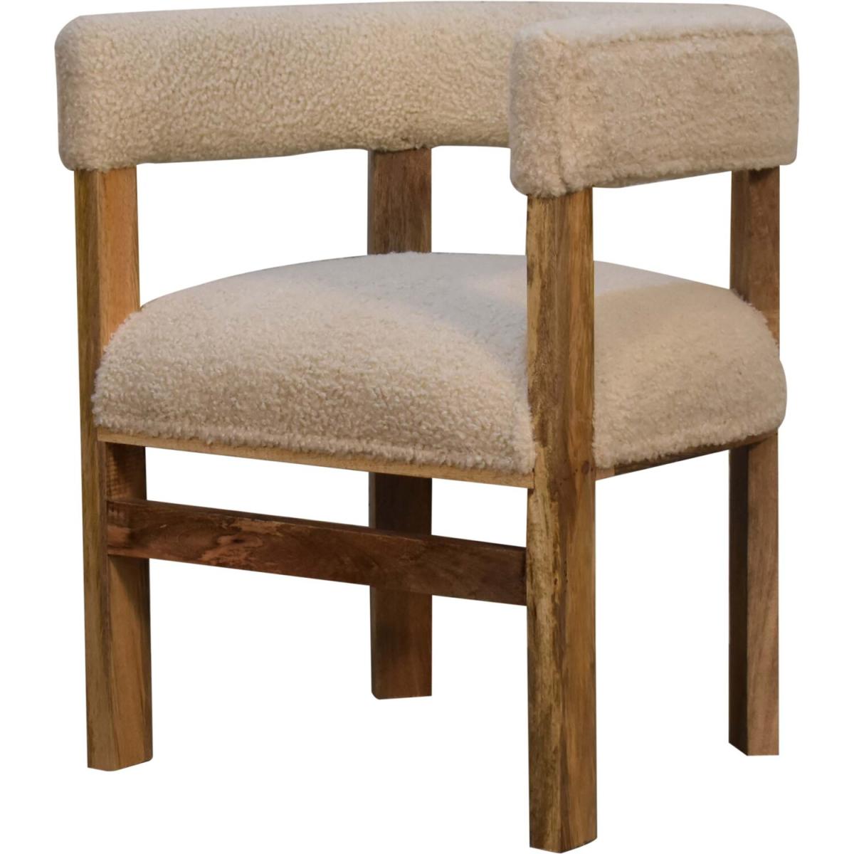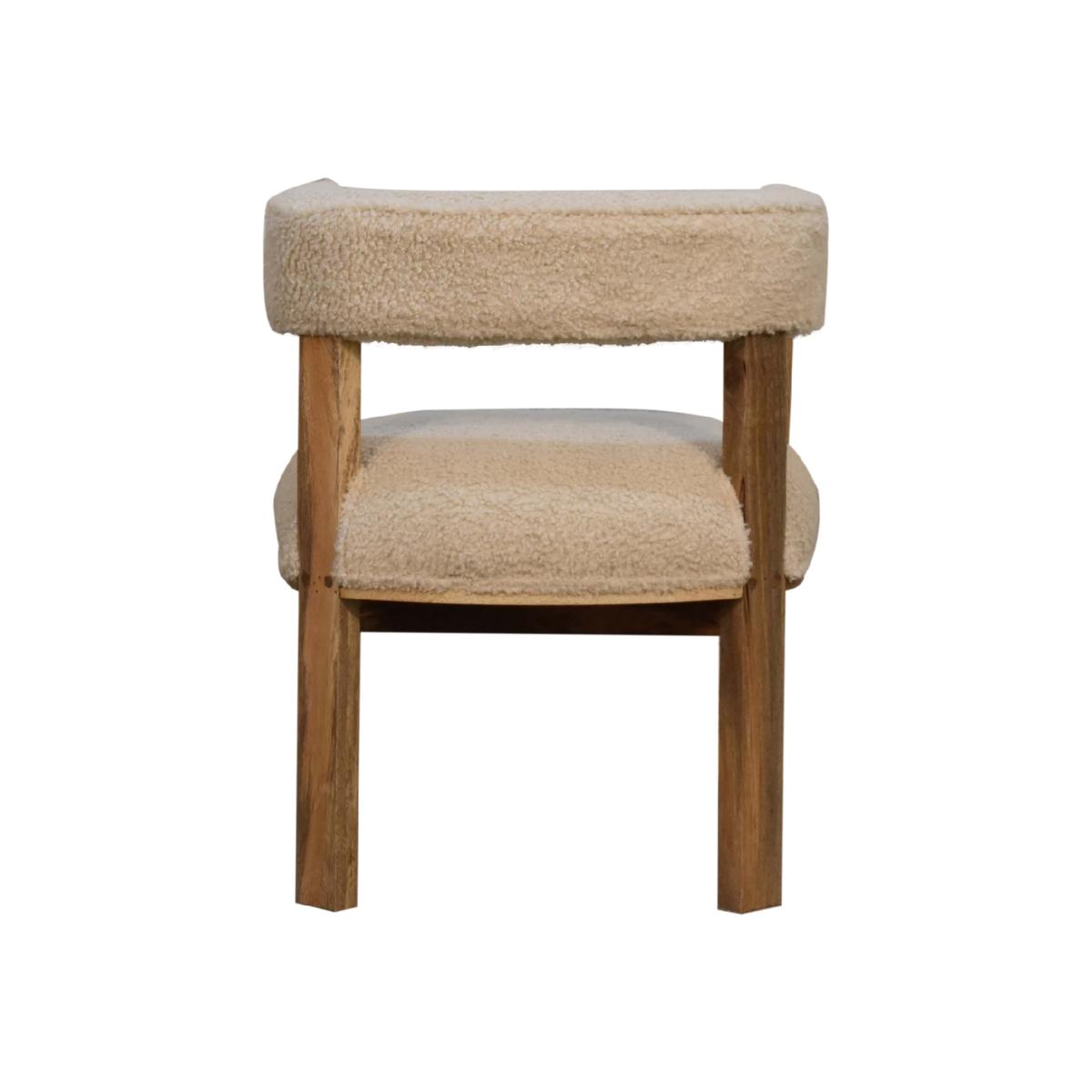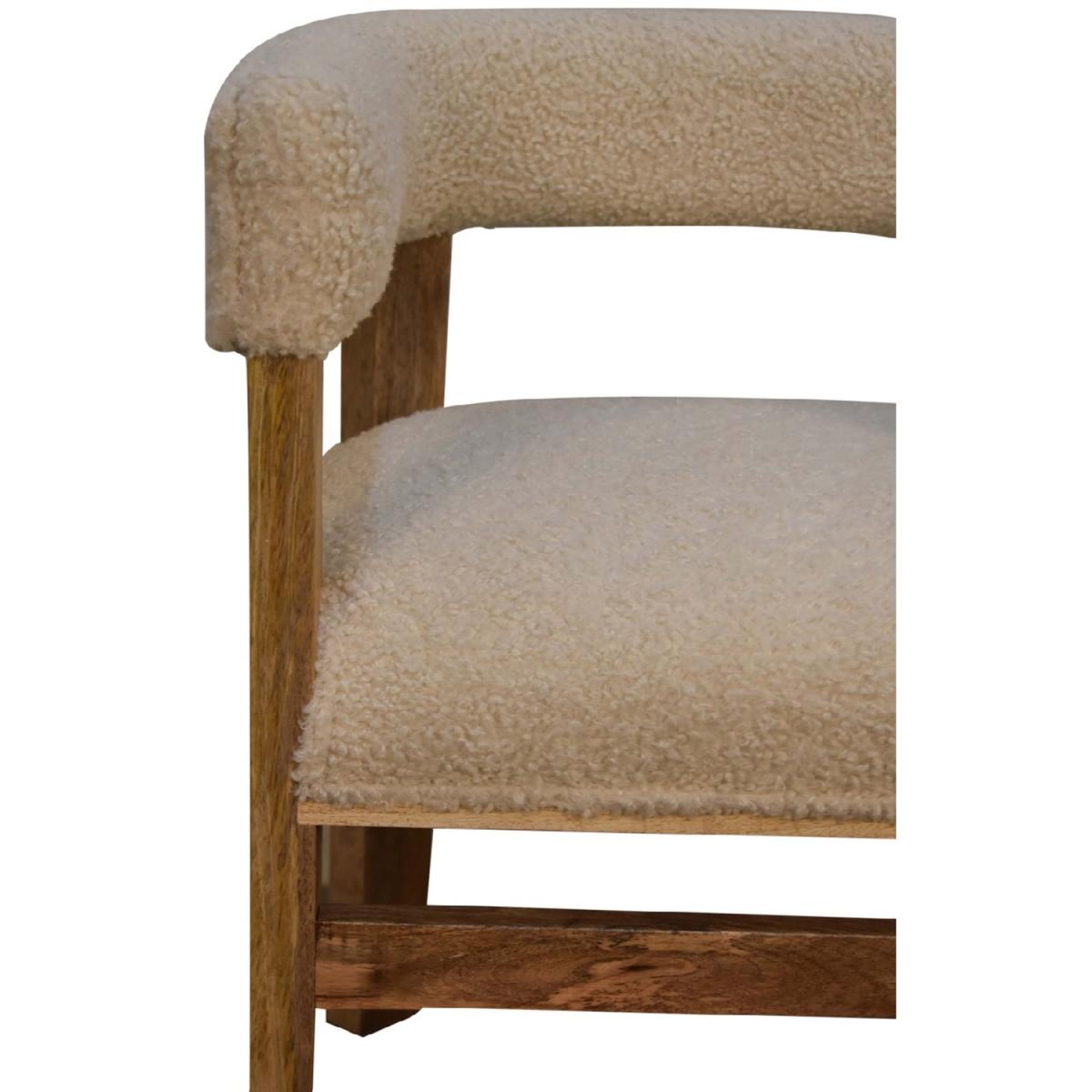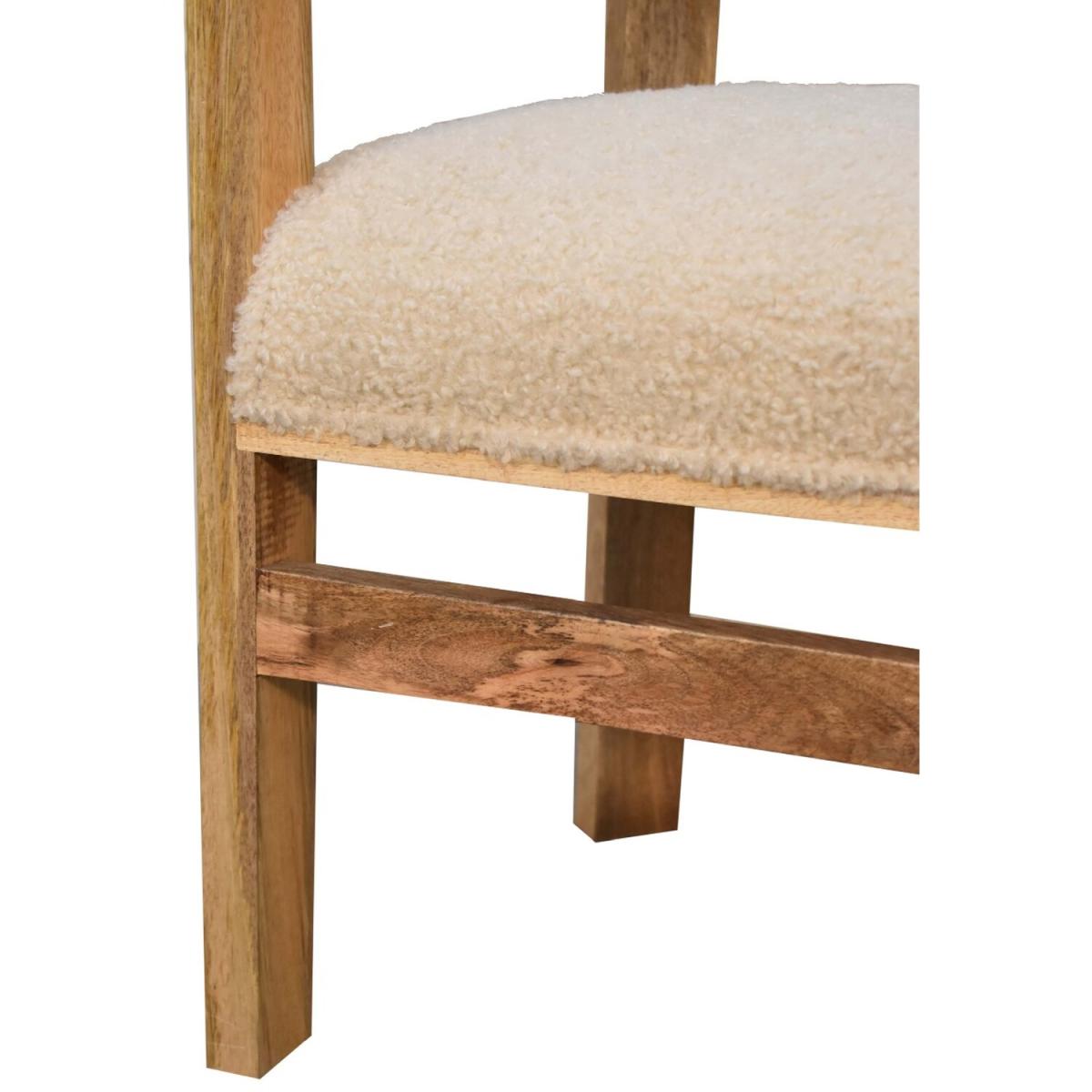 Derived from the French word for curled or ringed yarn or fabric. This handwoven upholstered furniture piece is made of 100 cotton and natural yarn, combing a solid wood frame and legs which are constructed from 100 solid mango wood in an oak-ish finish, allowing both finishes and materials to compliment each other beautifully.