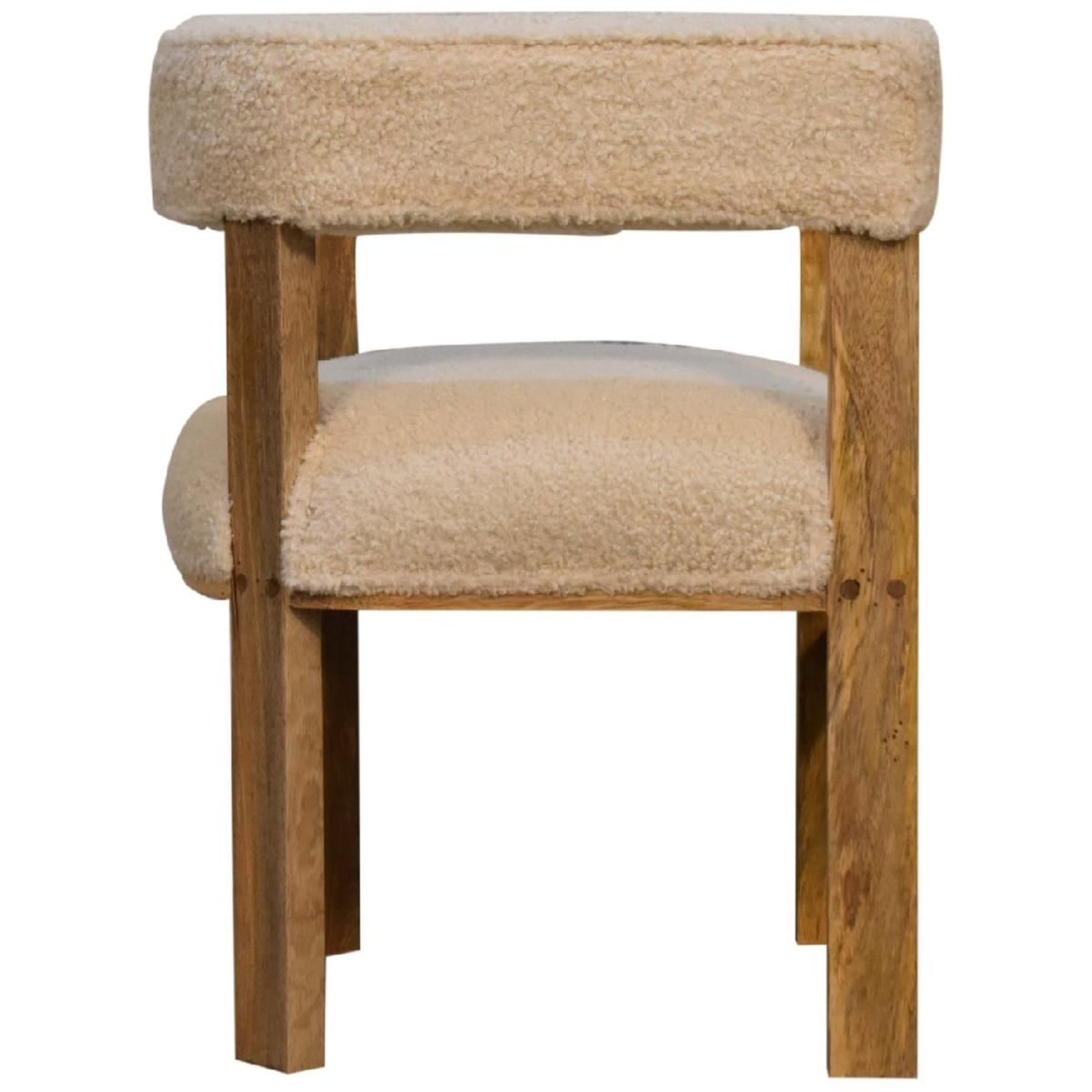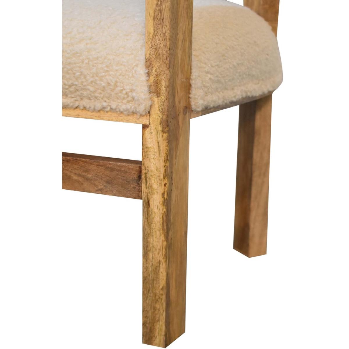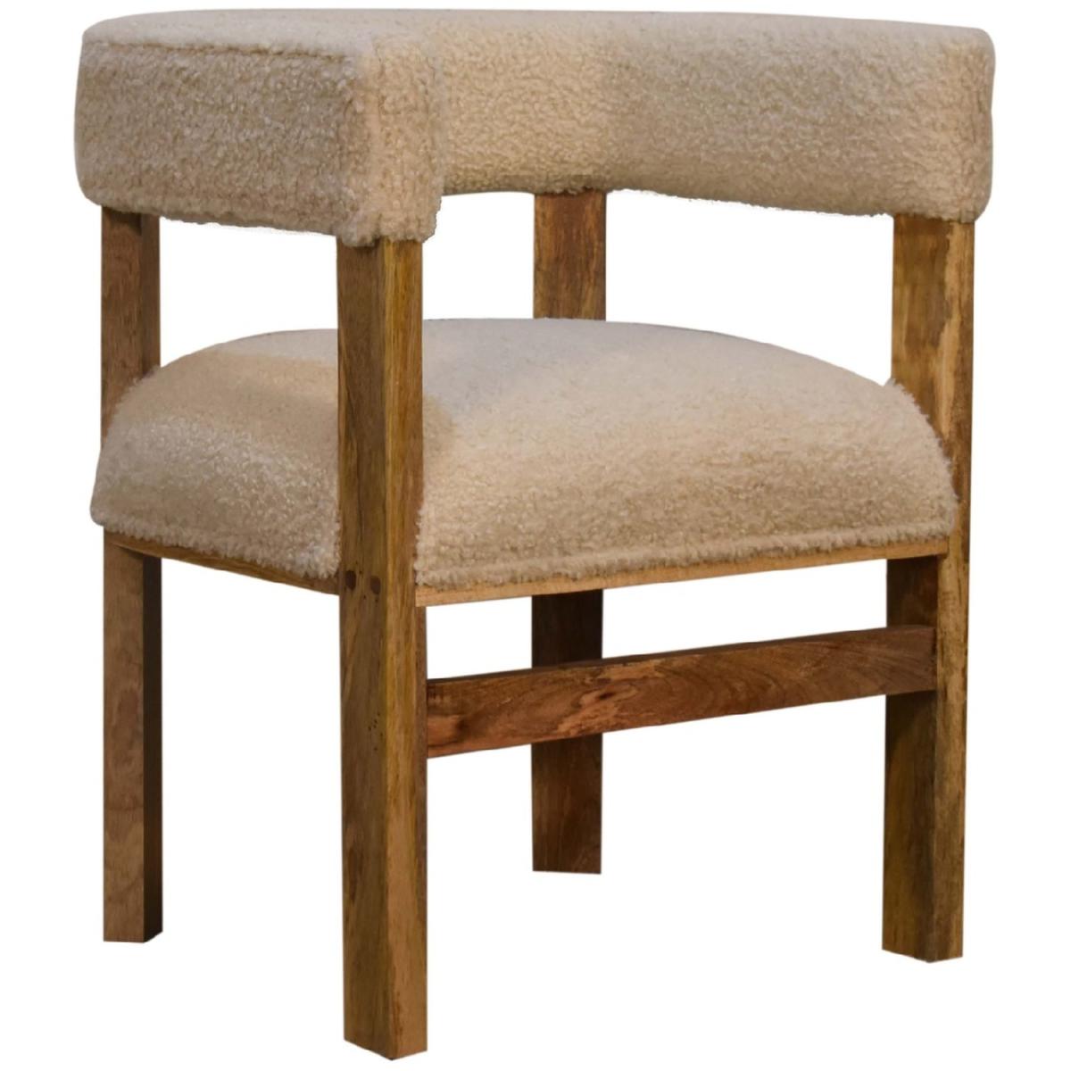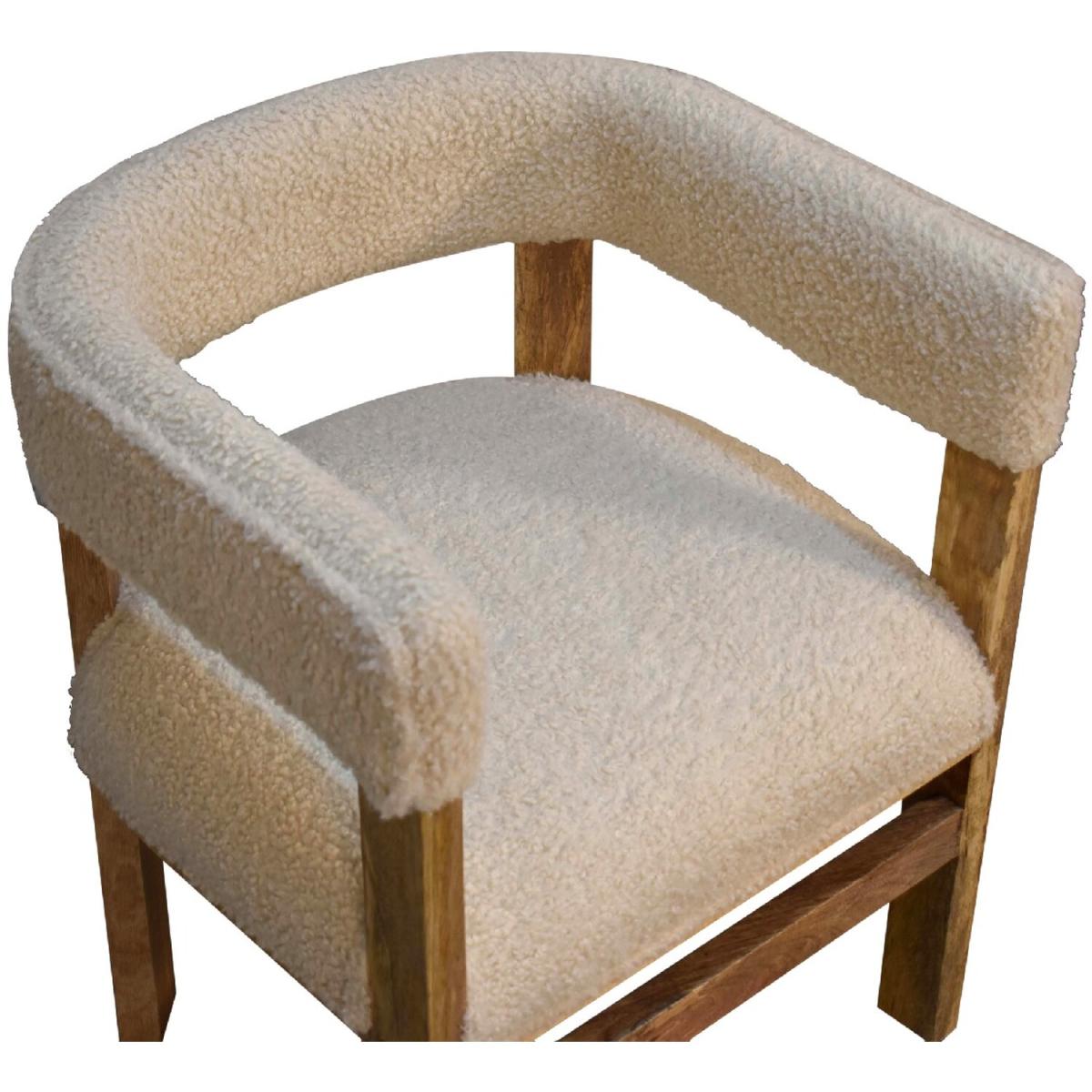 Derived from the French word for curled or ringed yarn or fabric. This handwoven upholstered furniture piece is made of 100 cotton and natural yarn, combing a solid wood frame and legs which are constructed from 100 solid mango wood in an oak-ish finish, allowing both finishes and materials to compliment each other beautifully.