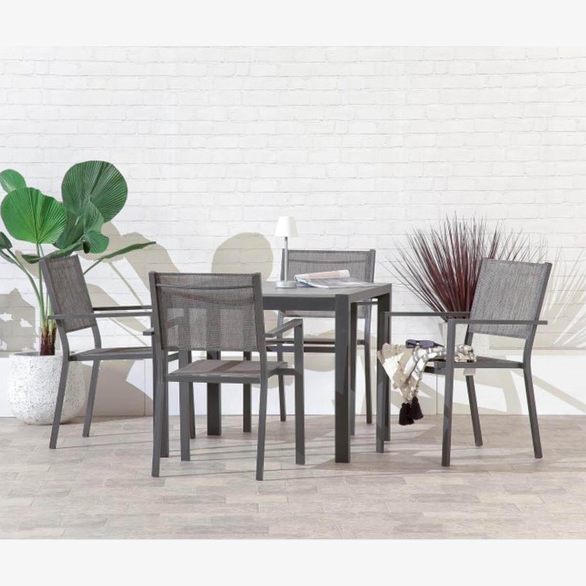 Introducing the Suntime Adrano 5pc Square Dining Set, a stunning addition to your outdoor space. This set includes four stacking armchairs, meticulously crafted with high-quality textelene for superior comfort and durability. The sturdy aluminium frame, powder coated for added resilience, ensures long-lasting performance. Designed with convenience in mind, the set features a parasol hole with a cap, allowing you to add shade when desired. With a 2-year guarantee, you can enjoy peace of mind knowing that your investment is protected. Elevate your outdoor dining experience with the Suntime Adrano 5pc Square Dining Set and create memorable moments with family and friends. *Props and table light not included.