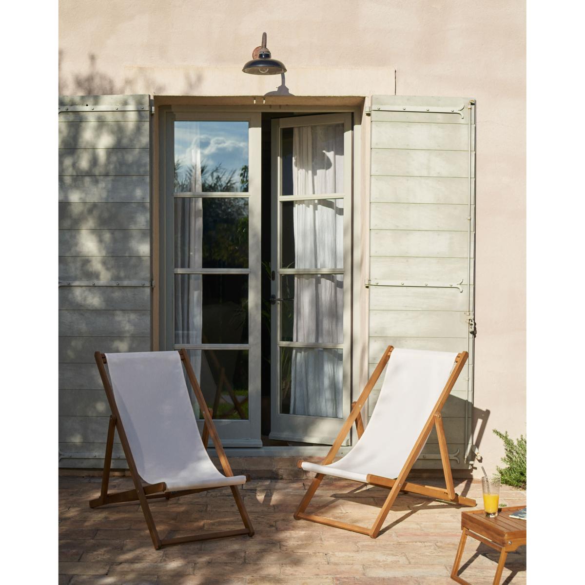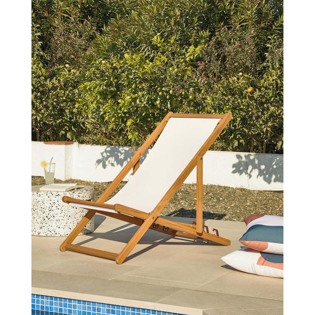 I love this outdoor deck chair for its simple, functional design and natural materials. The beige finish keeps it versatile, allowing it to complement both coastal and contemporary garden aesthetics. It works particularly well in relaxed outdoor settings, such as terraces or patio corners, where a clean, minimal look is desired. For styling, consider pairing it with neutral-toned cushions or throws for added comfort, or position it near lush greenery for a seamless blend with nature. Its FSC 100% acacia construction also ensures durability and eco-friendliness, making it a practical choice for those looking to combine style with sustainability.