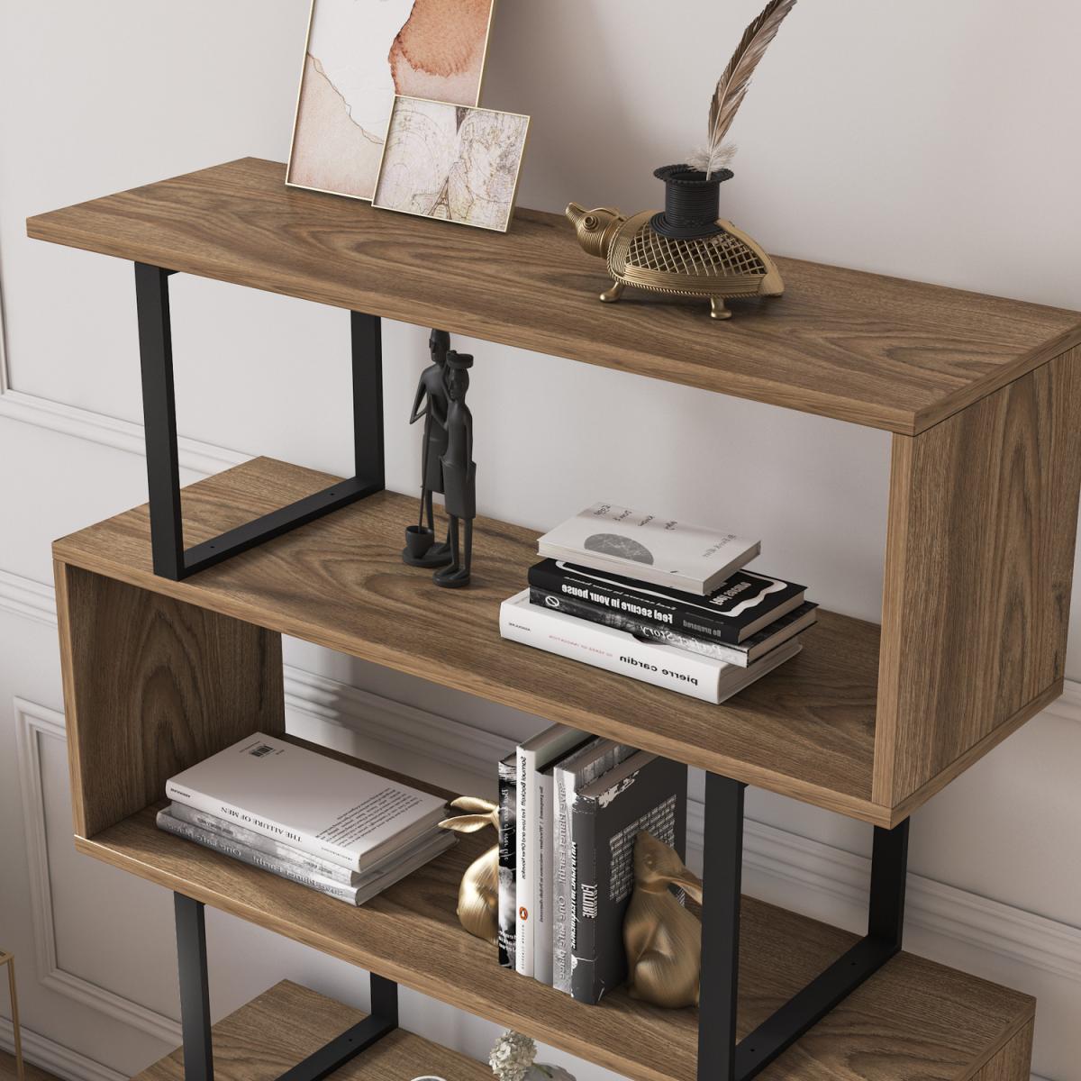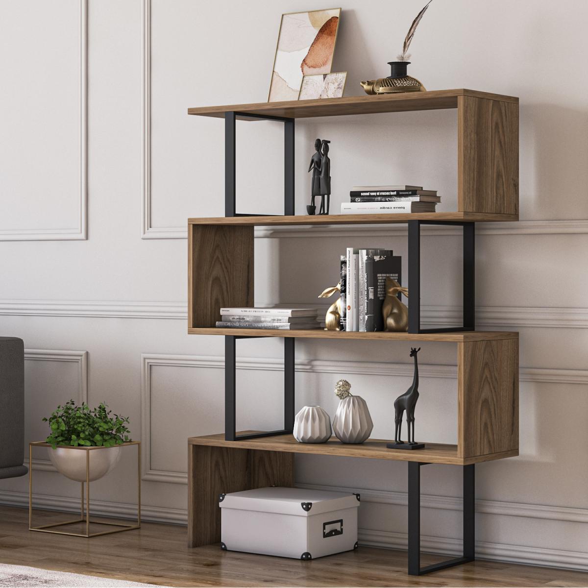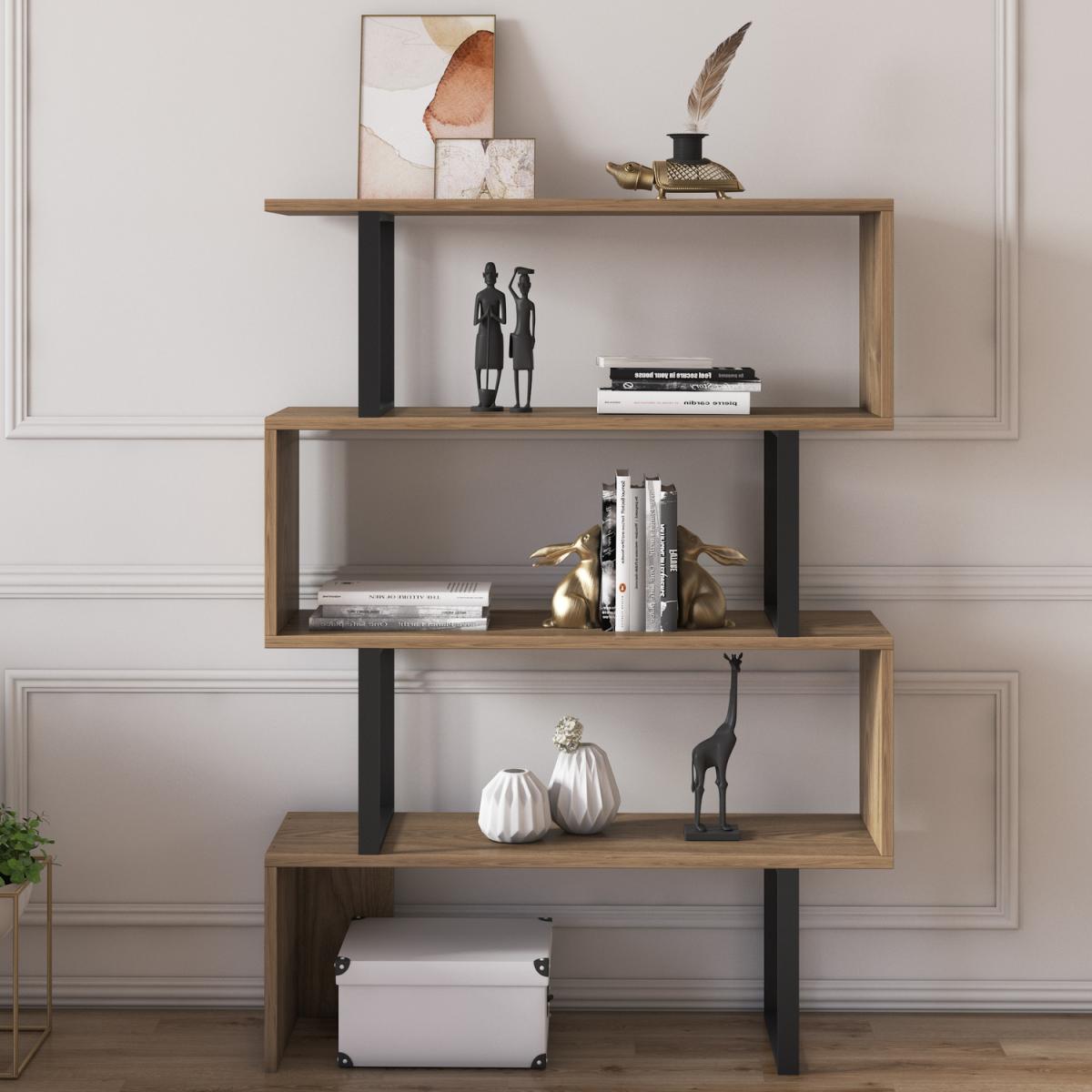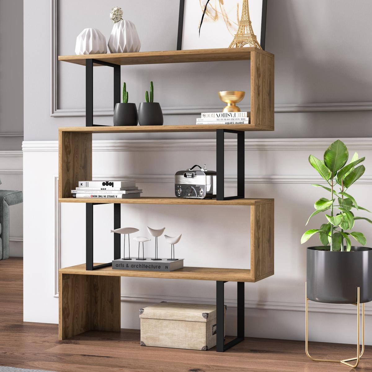 Starting from scratch, pure adventure, and fun. 120 cm high and 90 cm wide Adriana metal wood geometric bookcase adds an enthusiastic atmosphere while providing enough storage for your books, displays, and anything you want to put on. Sturdy enough and looking cool for your living space. Get ready for huge compliments because your loved ones would love this bookcase and it will make you happy. The bookcase is made of 18mm thick quality manufactured and industrial metal. Edges of the furniture are banded with laminated first-class PVC edge banding tape. Overall, it is manufactured using eco-friendly and health-friendly TSE-certified materials. The product will be delivered to the customer in the original package as disassembled. It is designed to be assembled by the customer easily using a power drill.