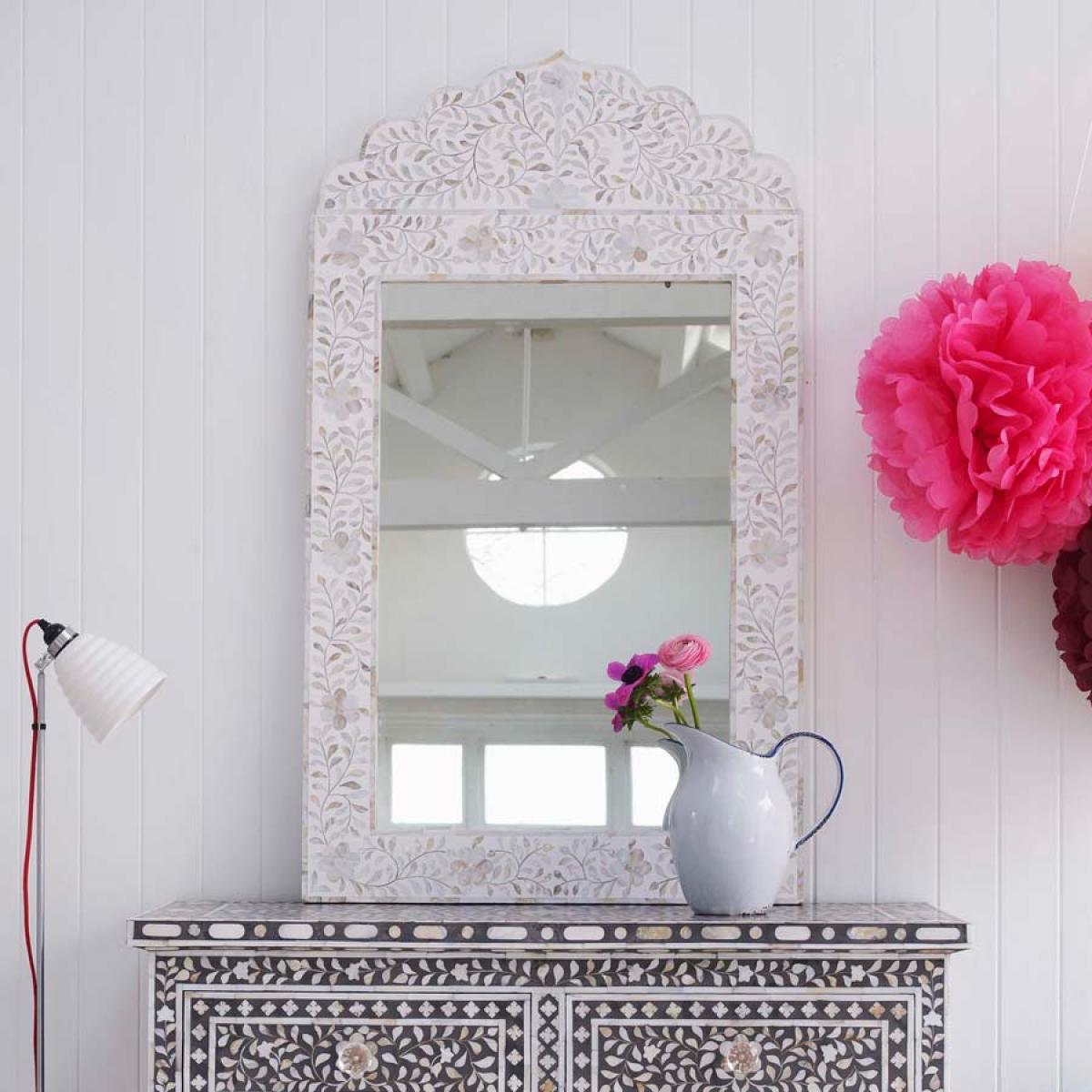I love this mirror for its elegant Mother of Pearl finish, which adds a touch of subtle luxury without feeling overly formal. It works particularly well in coastal or contemporary interiors where natural textures and light reflect beautifully, making spaces feel brighter and more open. For styling tips, try pairing it with soft neutrals or complementary metallic accents to enhance its shimmer, and position it where it can reflect natural light or interesting details, such as artwork or a floral arrangement. It’s versatile enough to work above a console table or in a bedroom, giving a refined yet understated statement.