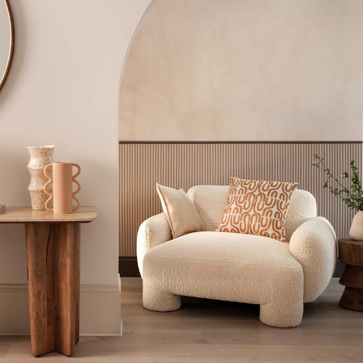 I’m a fan of the Adrina chair for its clean silhouette and soft boucle texture. It works brilliantly in modern, Scandinavian or minimalist schemes, where its low-slung form can soften sharper lines. For styling, position it beside a slimline floor lamp, add a neutral throw or a tactile cushion and pair it with a slender side table to keep the look airy. Anchor the setting with a muted geometric rug and minimal accessories so the chair remains the standout piece.