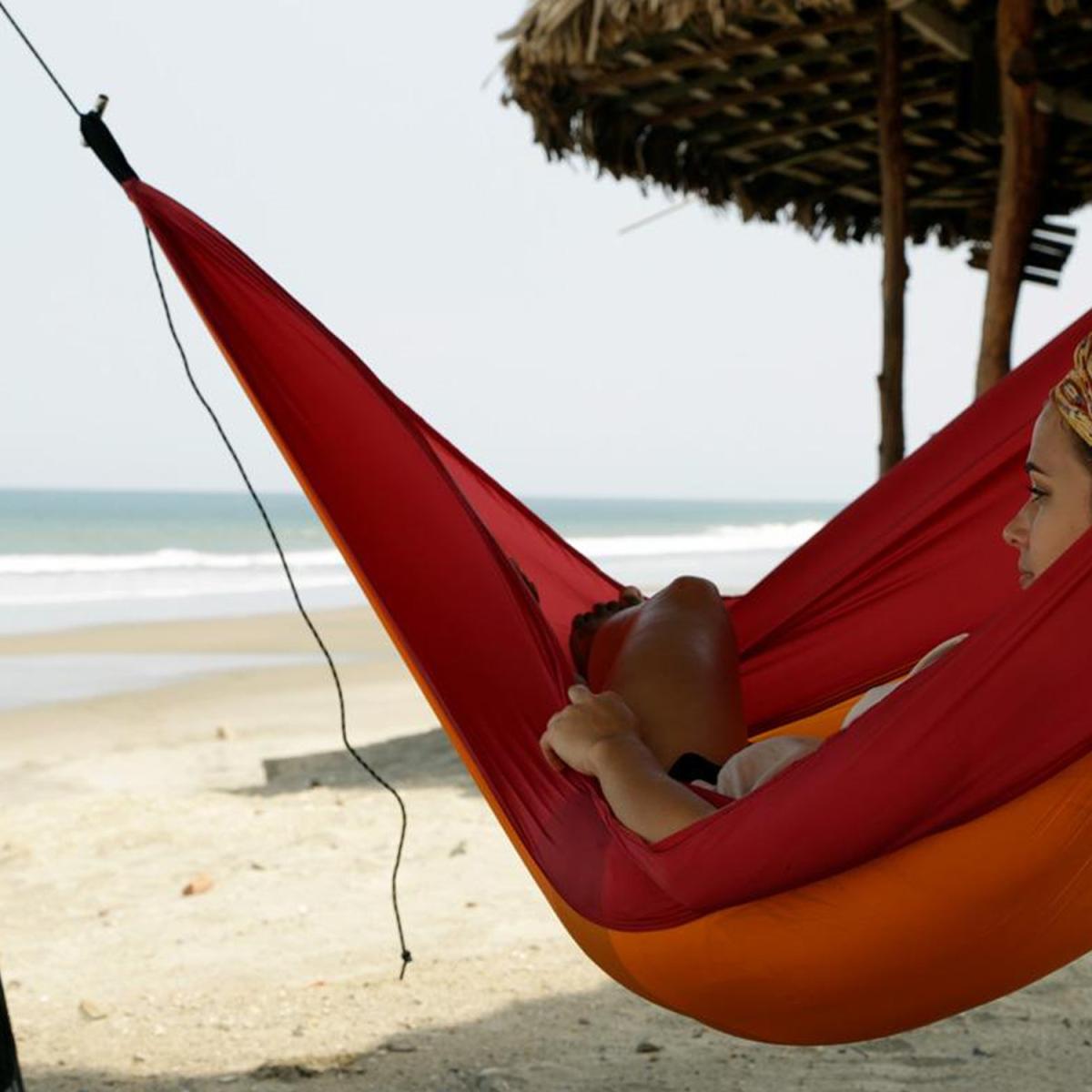 The Ultra-Light Adventure Hammock is made from strong, breathable, skin-friendly Ripstop Nylon material. The ultra-light adventure hammock weighs only 180g and can pack away into its own bag for ease. It's suitable for all types of weather, sun or rain, and can comfortably fit one or two people. It's a great value-for-money hammock that you can take anywhere. Available in a range of different colours to suit your personal style.