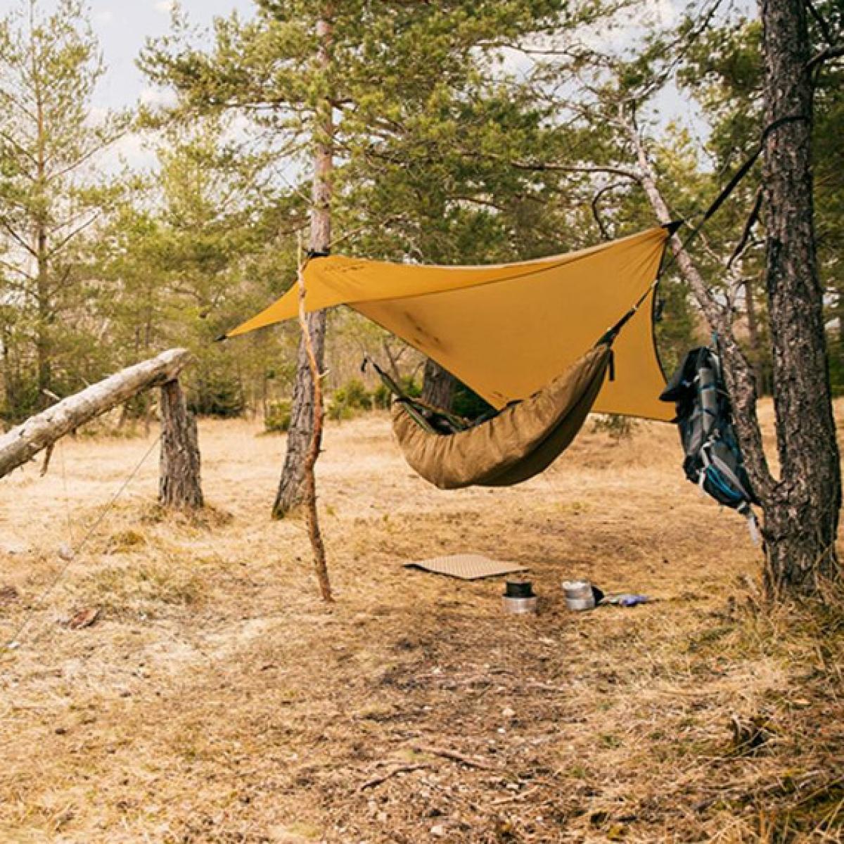 The Wing Tarp is perfectly coordinated with the dimensions of the ultra-light hammocks. It provides the hammock with all-round protection from wind and rain thanks to the variably folding sides (wind protection can be rolled up when not in use). Suspending the Wing Tarp is child's play with the adjustment carabiner and the Y-shaped aluminium pegs. The tarp also has small pockets for storing the guy ropes. With the variable wind protection you do not only have 360-degree protection from wind, but you can simply roll it up when and enjoy the view outside when the wind dies down. This makes the hammock the perfect outdoor bed for any weather! Wing Tarp is suitable for many ultra-light hammocks, and for any kind of outdoor camp as a roof to keep off the rain. It can also be used as a lightweight alternative to a tent.