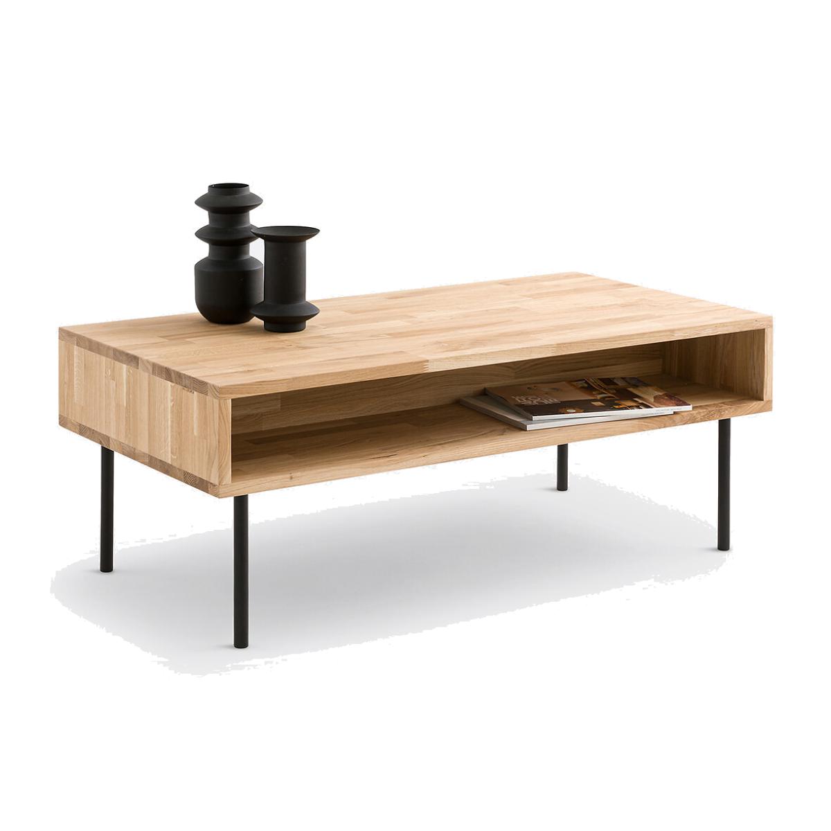 This coffee table, in a revisited vintage spirit, is made in Europe. The Adza coffee table features a Scandinavian spirit that leans into the retro style. For a beautiful living room. Product Details • Top and unit in solid finger-jointed oak, colourless polyurethane varnish finish • FSC® certified wood • 2 compartments • Pre-assembled top, 1 central divider along the length of the coffee table • Feet in black epoxy lacquered steel, to be attached • Felt pads. Care Advice • To protect your coffee table, consider trivets, coasters and placemats. Dimensions • Width: 100cm • Height: 39.5cm • Depth: 50cmDelivery:. This product required assembly. Available for home delivery. • Made in Europe. • WOOD FROM SUSTAINABLY MANAGED FORESTS. FSC® certified wood comes from forests that are environmentally, socially and economically well managed. Dimensions and weight of parcel2 parcels • L105 x H20 x D55cm. 17kg • L30 x H11 x D50cm. 5.5kg