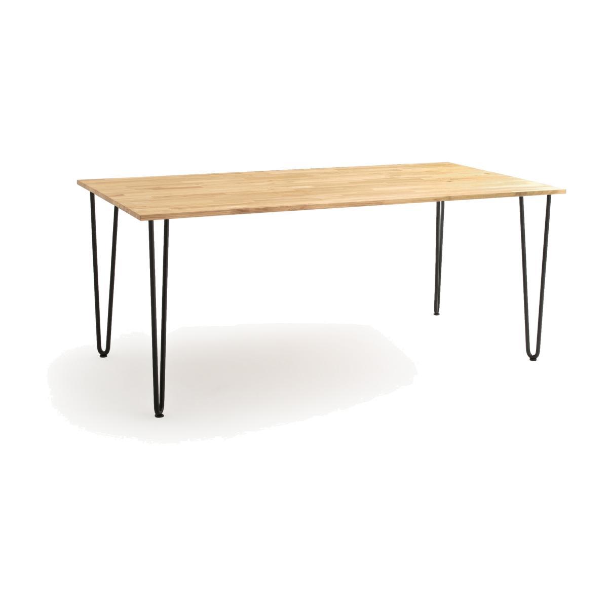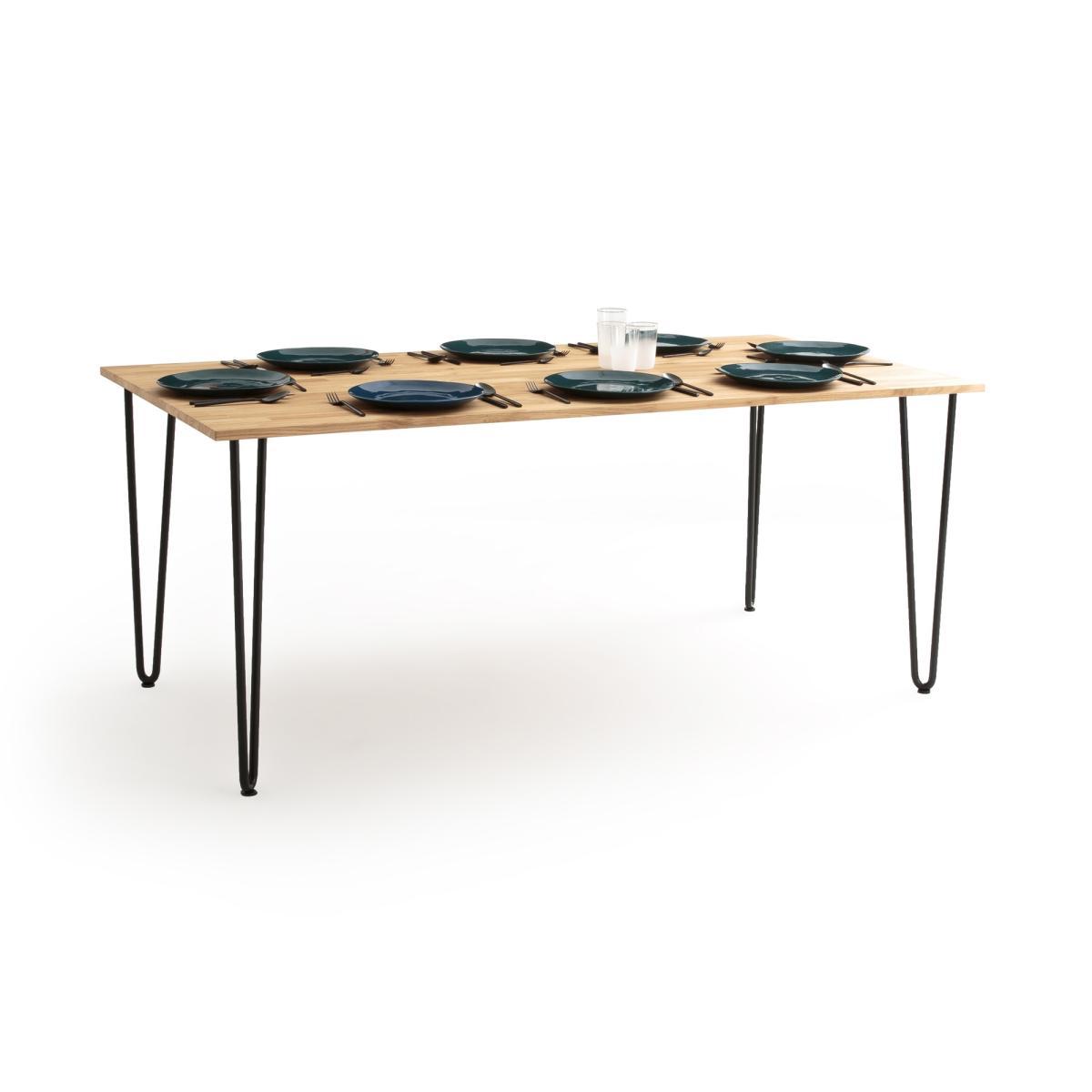I love this table for its clean, minimalist style that effortlessly blends modern and rustic aesthetics. Its solid oak top offers warmth and durability, making it a practical choice for daily use, while the black metal hairpin legs give it a contemporary edge. This piece works well in an open-plan kitchen-diner or a Scandinavian-inspired interior, where natural materials are a key feature. For styling, consider pairing with a mix of upholstered and wooden chairs to create an inviting, lived-in look, and add a statement rug underneath to anchor the space. It’s versatile enough to dress up for dinner parties or keep casual for everyday family meals.