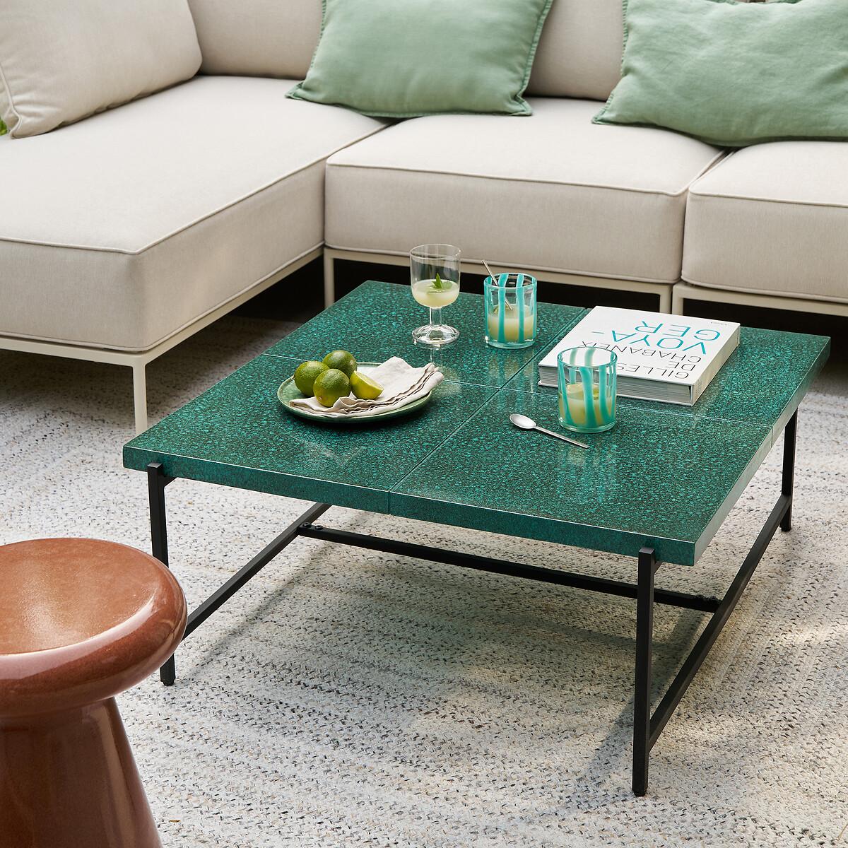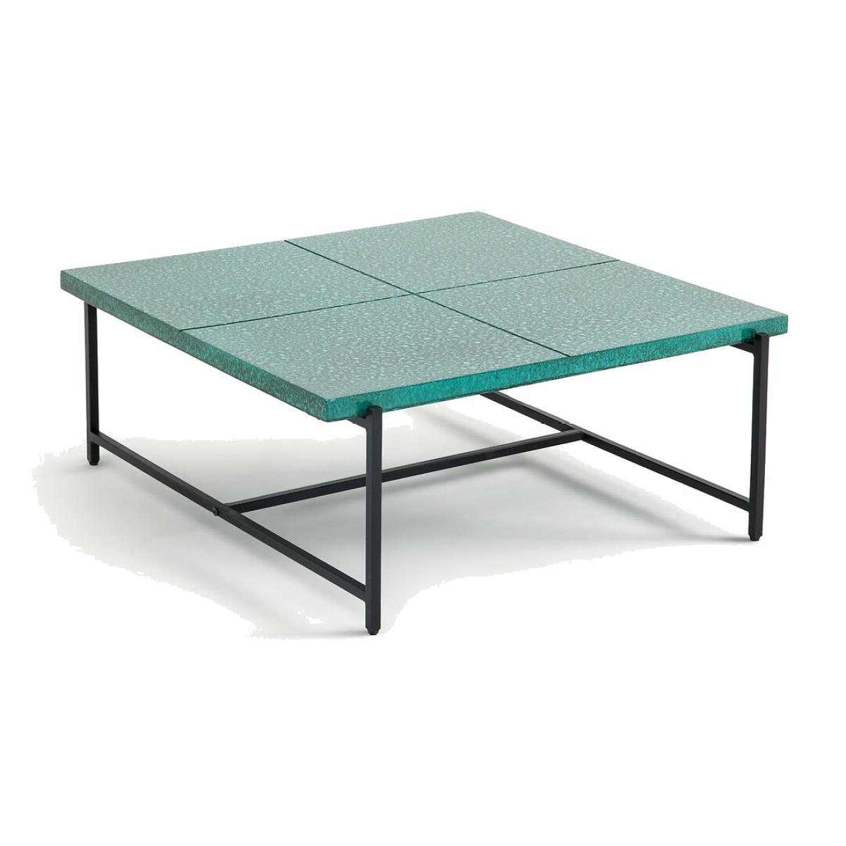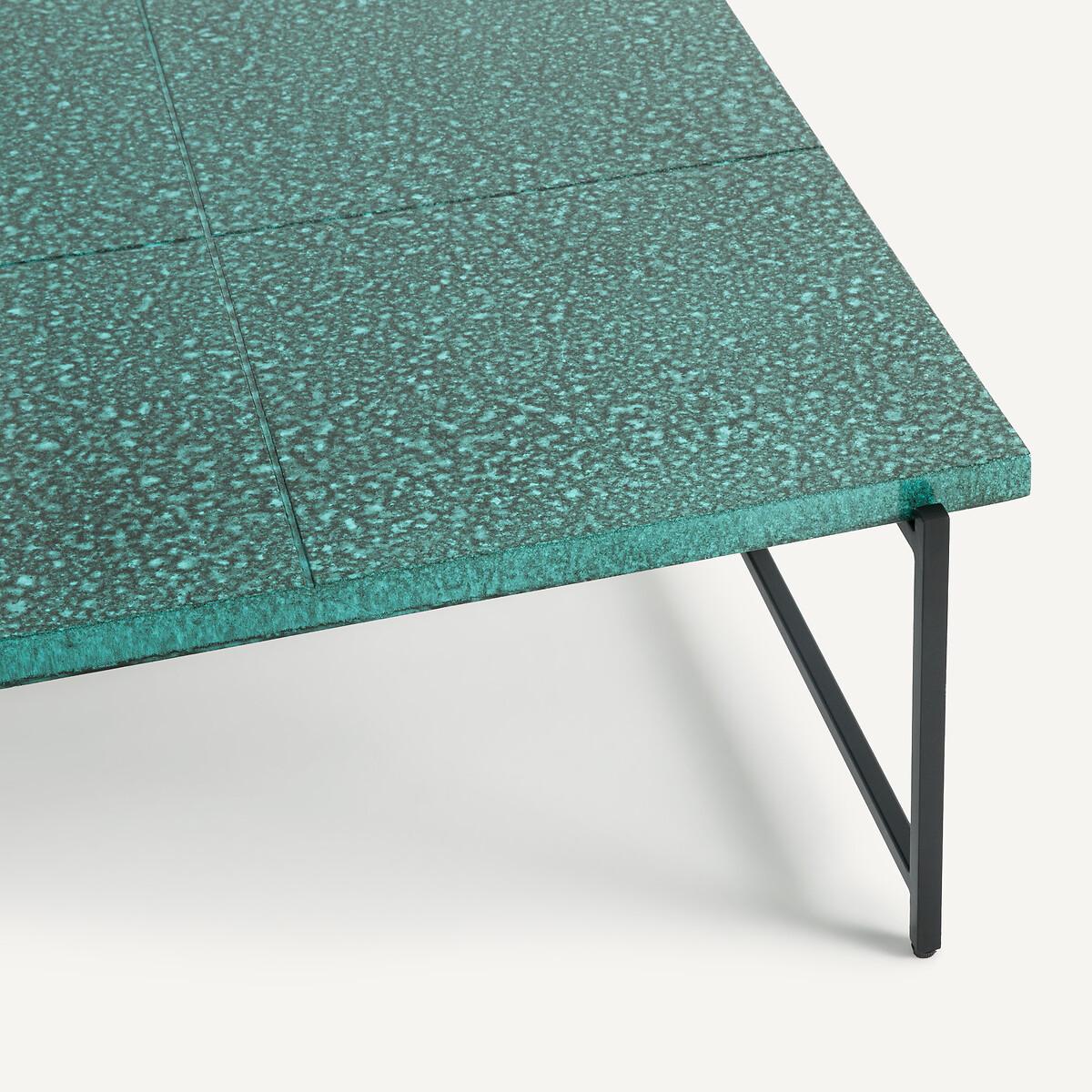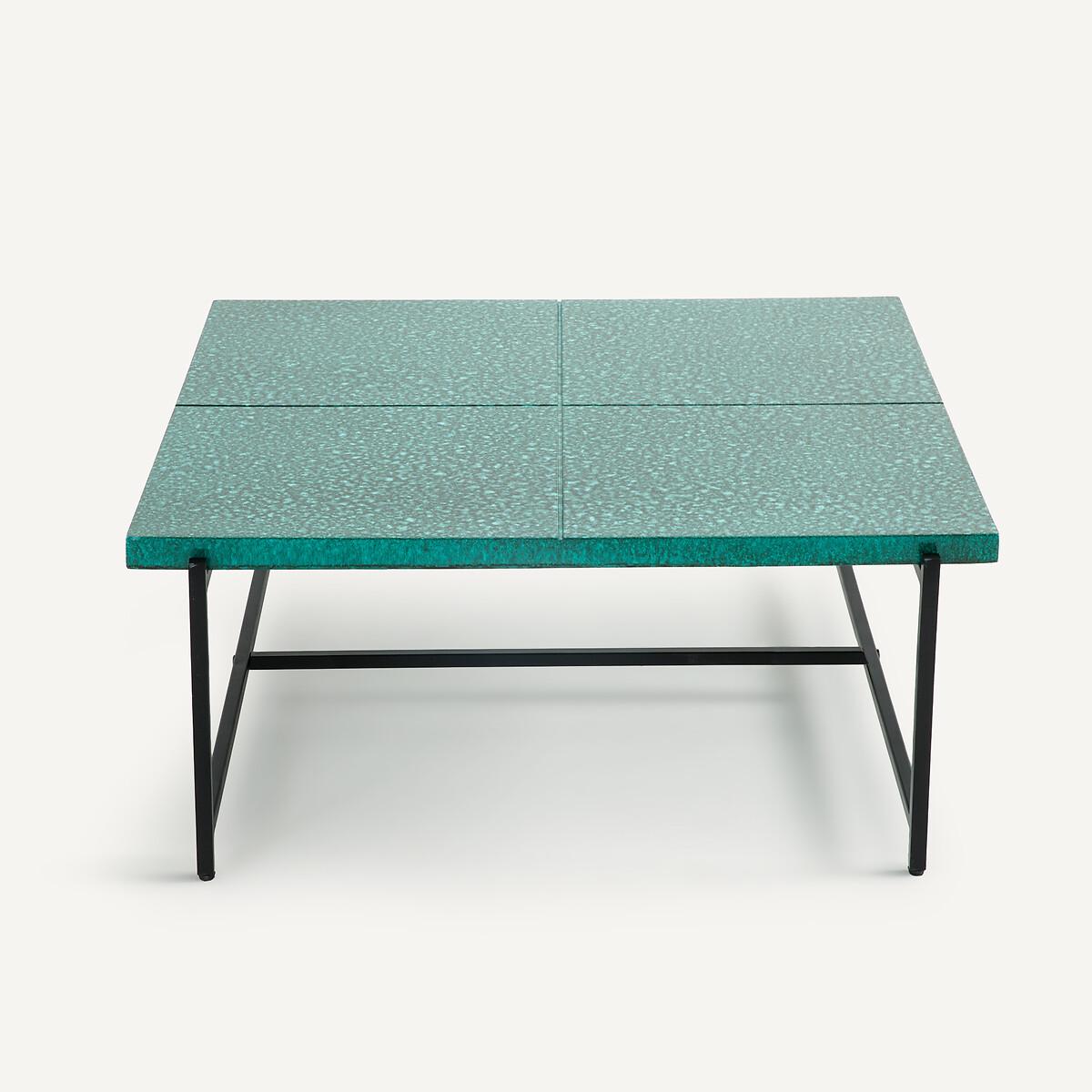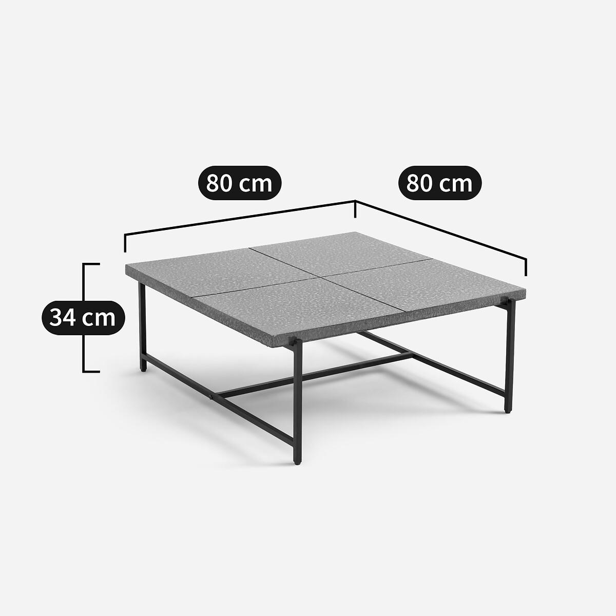 Graphic, pared down and resolutely contemporary. This coffee table has a squared polystone top, a combination of finely ground stone, fibreglass and resin which gives it a speckled, satin finish. Its slim black galvanised steel legs underline the elegance of its contemporary design. An AMPM signature design. Product Details • Galvanised steel frame with black powder-coated finish • Top in acrylic-finish polystone with grooved detail Quality • Polystone is a composite material made mainly of polyester resin, powdered stone and fibreglass, offering great strength, with the look of natural stone. • Lightweight and impact and weather resistant, it is ideal for outdoor furniture. Care Advice • For daily maintenance: use a soft sponge and soap. Avoid using sponges that are too abrasive, which could damage the surface. • Clean greasy and acidic stains immediately with diluted bicarbonate of soda. • Low temperatures are likely to affect the proper functioning and surface condition of your outdoor furniture. • We therefore advise you to store it in a dry, ventilated and closed room.. We strongly advise against the use of a tarpaulin because it will act as an oven and will damage the surface conditions; wood and metal products are particularly concerned. • Before any storage, remember to clean and dry the products well, in order to prevent the appearance of mould or unpleasant odours.. • Whatever the material, it is not advisable to leave furniture outdoors unprotected, particularly during bad weather and winter. Dimensions • Width: 80cm • Height: 34cm • Depth: 80cm • Table top thickness: 3cm/1" • Weight: 22kg • This product requires assembly. Dimensions and weight of parcel • 1 parcel • L87 x H10 x D87cm. 27kg