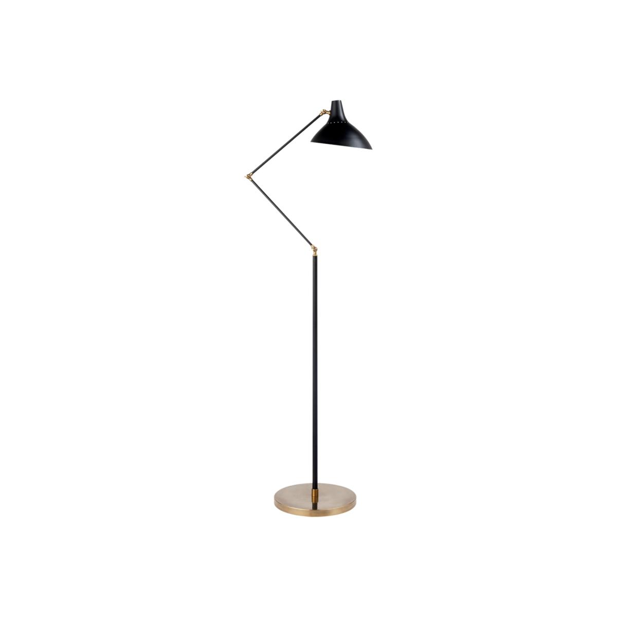 A sleek floor lamp in matte black with antique brass fixings. Charlton is designed by AERIN, with just enough European design-led chic. It exudes cool, crafted smoothness with wide spot lighting and adjustable branches, perfect for a contemporary living room, kitchen or bedroom.