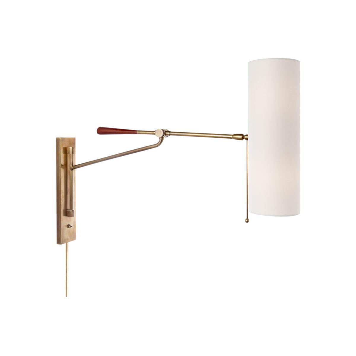 A wall light with a hand-rubbed antique brass stem, mahogany accents and a long cylindrical linen shade. Frankfort is designed by AERIN, with just enough European design-led chic. It exudes cool, contemporary smoothness. Available also as a floor lamp.