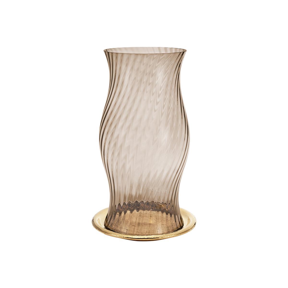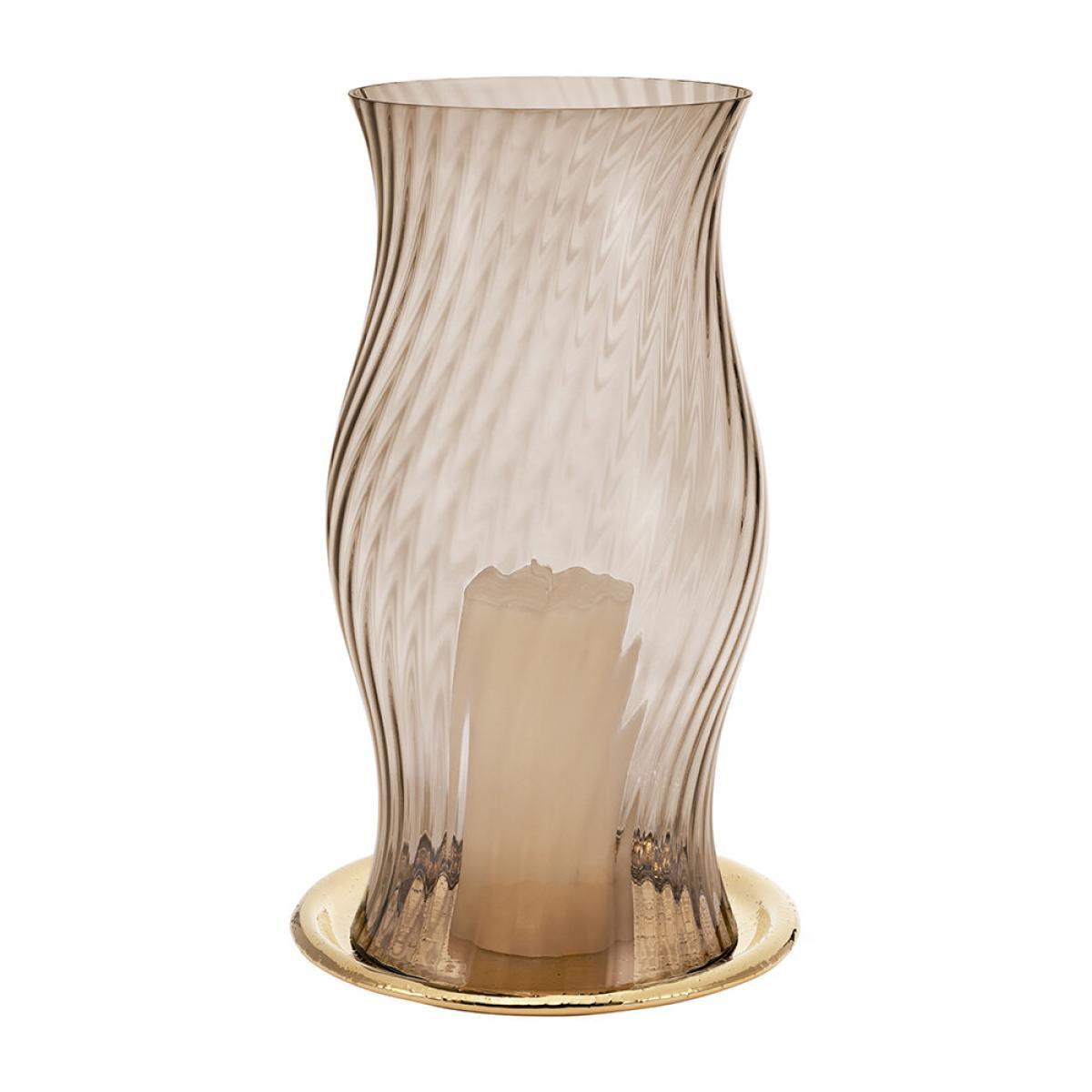 Add a stylish glow to your home with this Milla hurricane from AERIN. Inspired by vintage glassware, this hurricane has a fluted form enhanced with a curving pattern. Finished with a 14ct gold ceramic base, it'll add a glistening touch wherever you place it. Key features: * Material: glass, ceramic * Dimensions: Ø22xH37cm * Fluted shape * Taupe colour * 14ct gold paint * Please note, due to the handmade nature each piece is unique